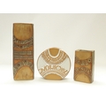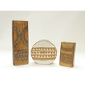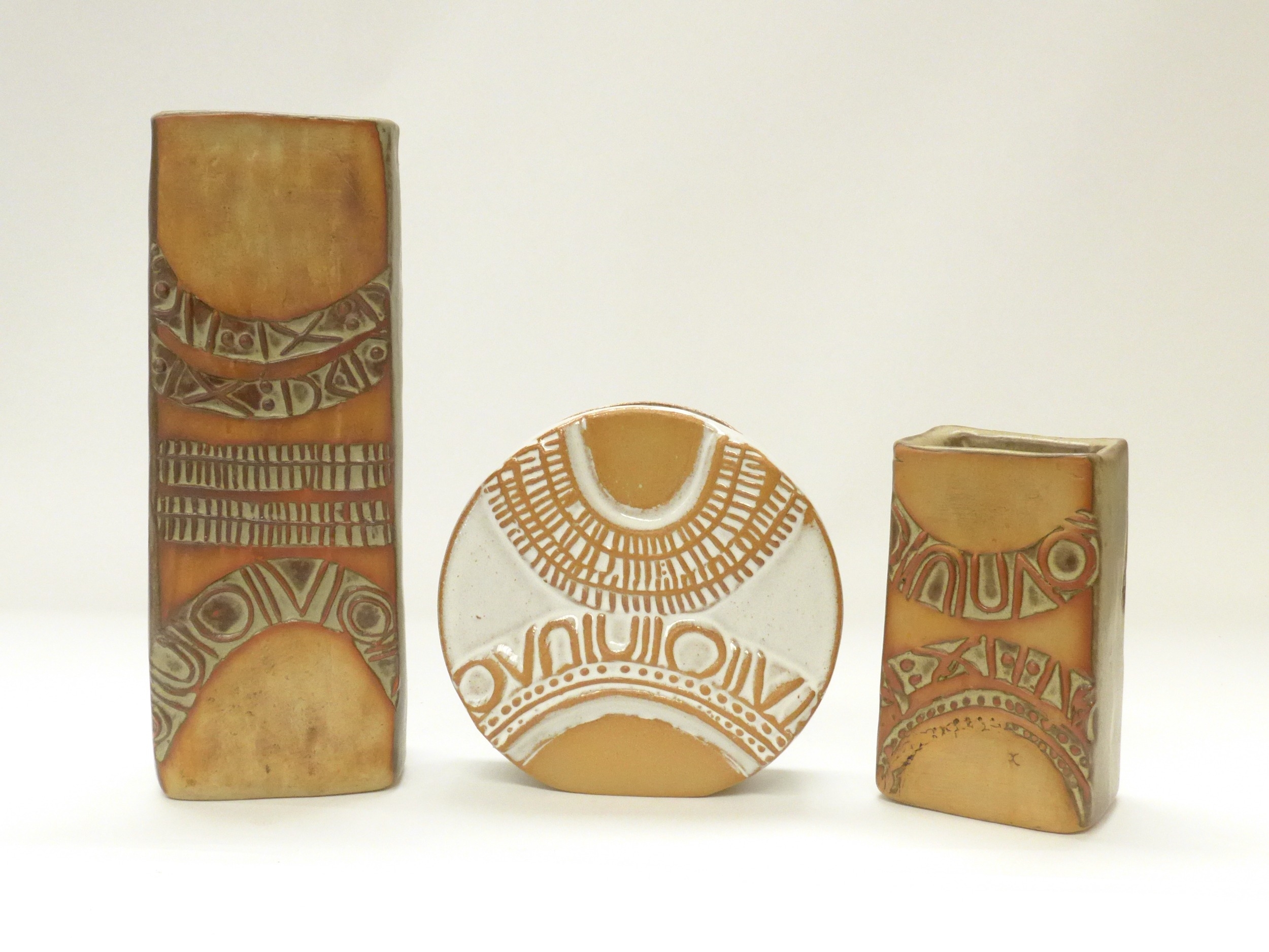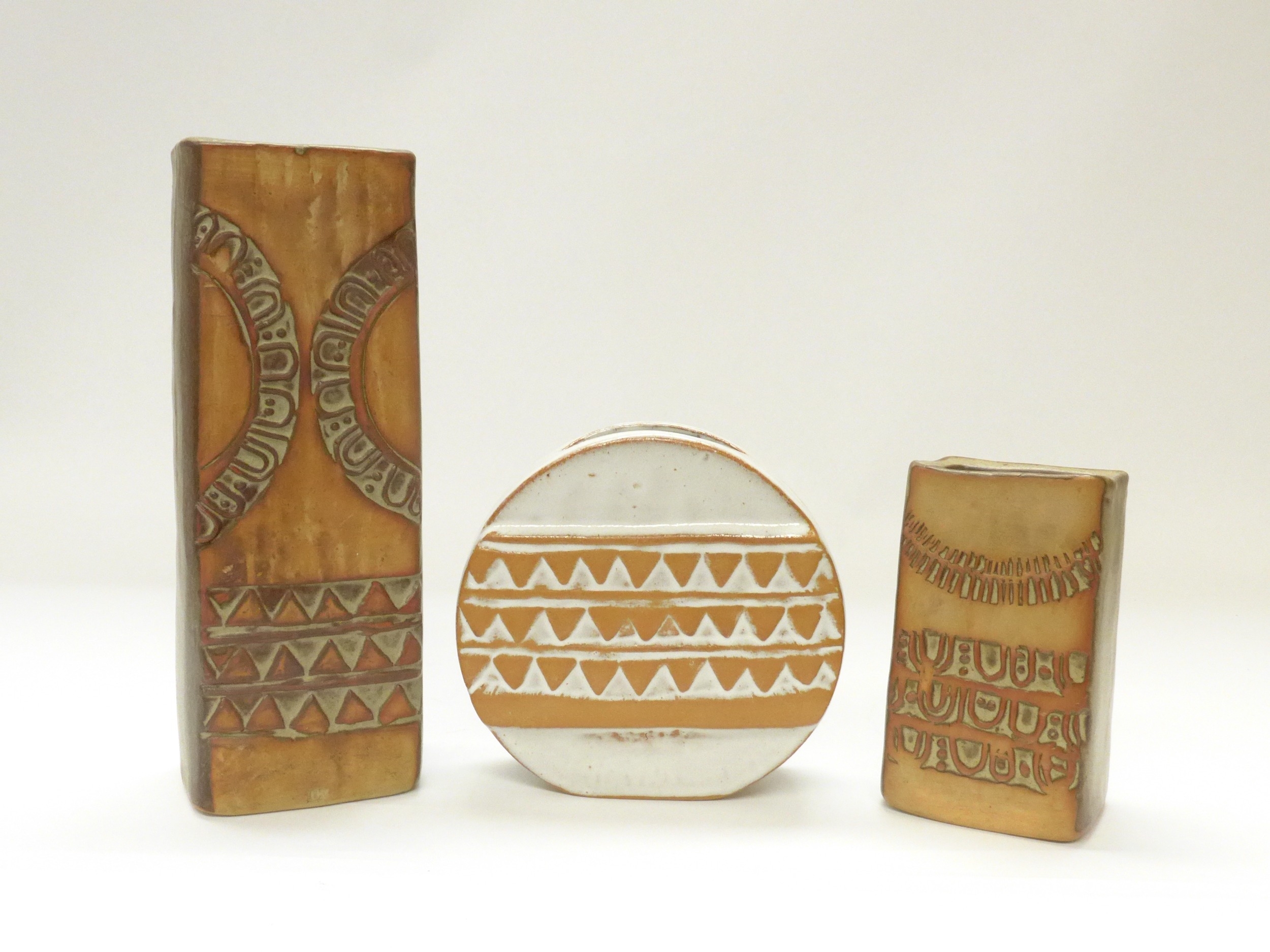 Louis Hudson Pottery - A white glazed wheel vase with relief moulded geometric detail, plus two Hudson slab vases, tallest 24cm