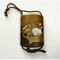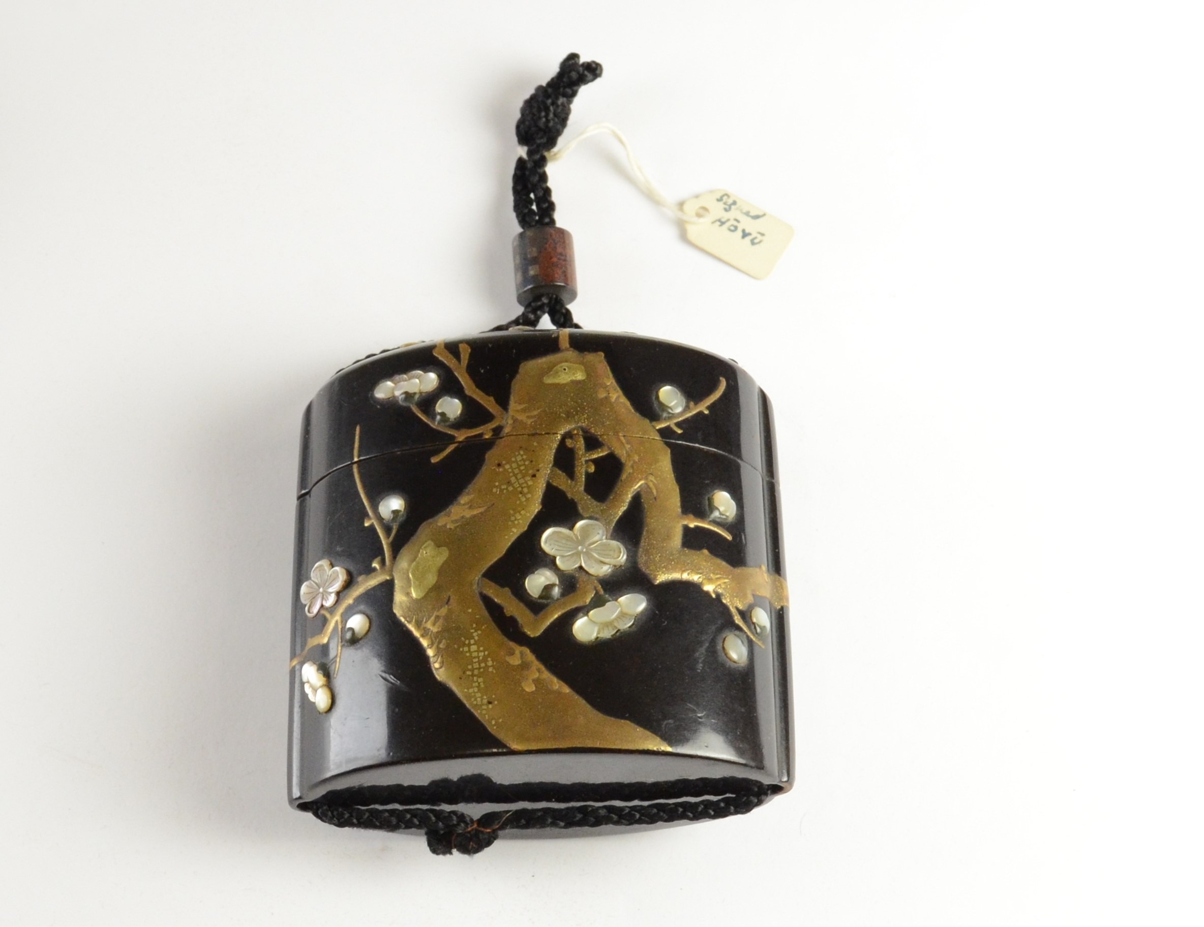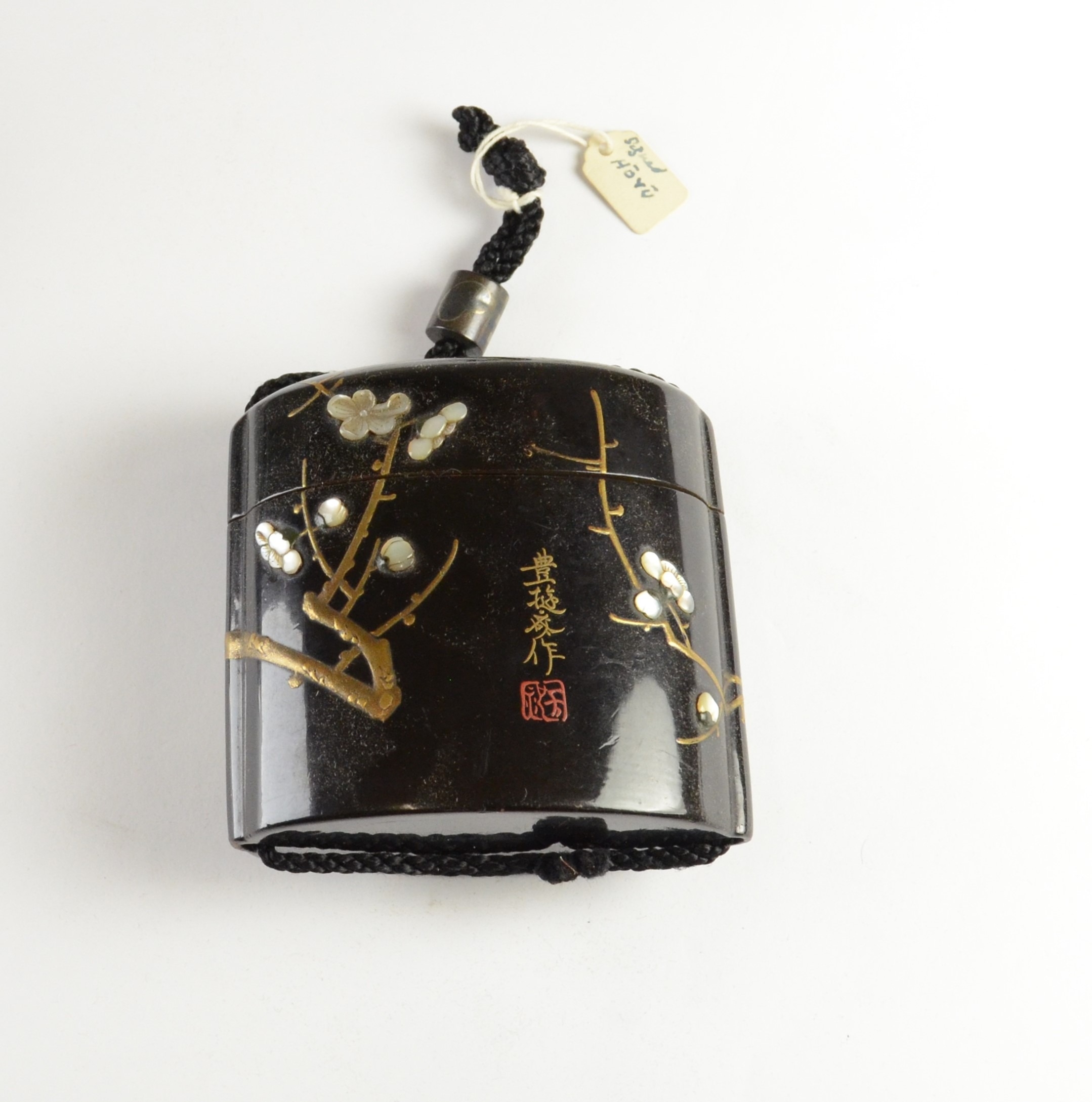 A single case lacquer inro or tonkotsu decorated with a blossom tree mother of pearl flowers, signed 7.8cm high, 8.4cm wideProvenanceHenry Potter Stevens collection 212 Glendining & Co Boyle sale 22/1/47 part lot 210
