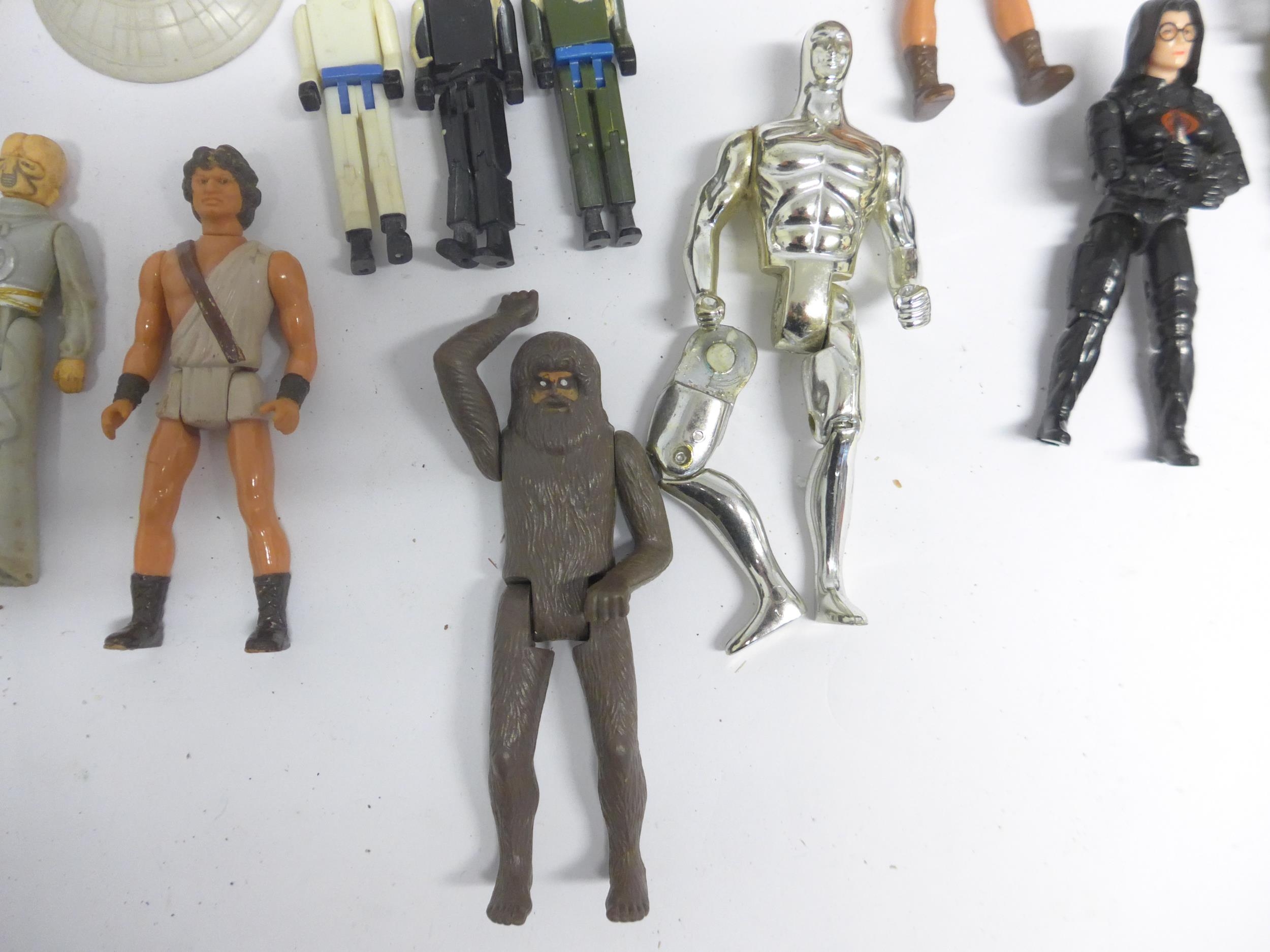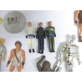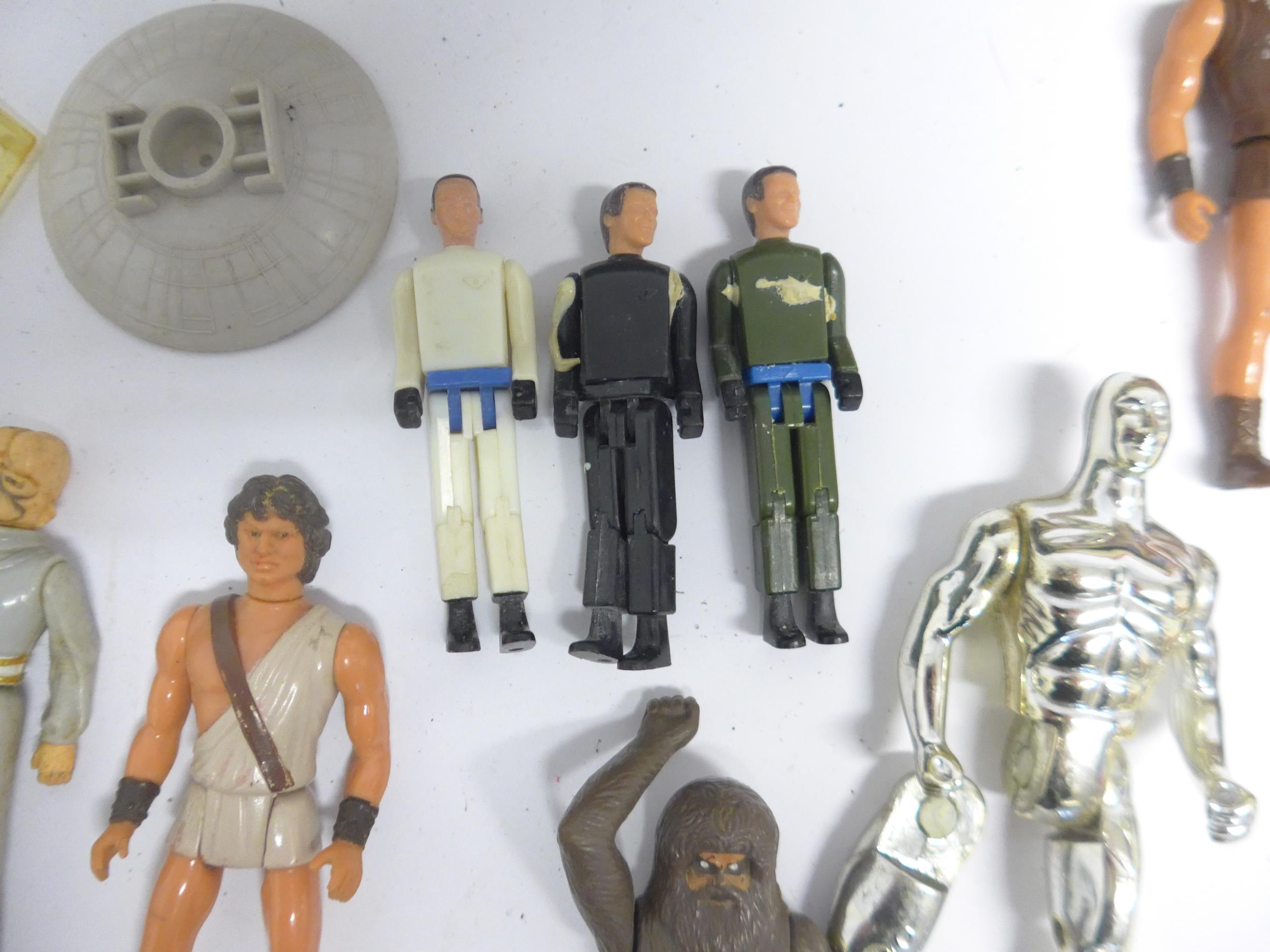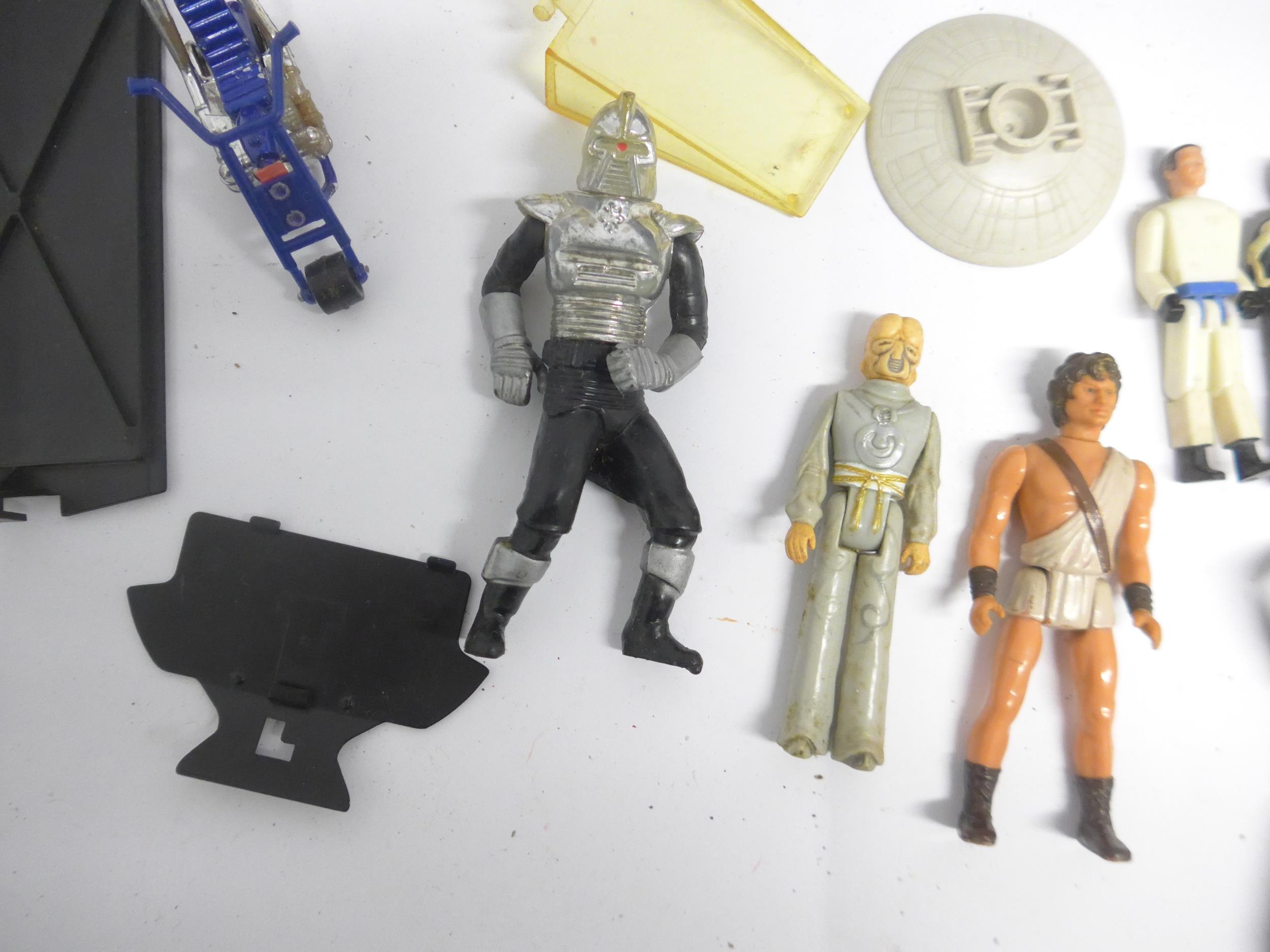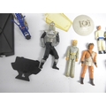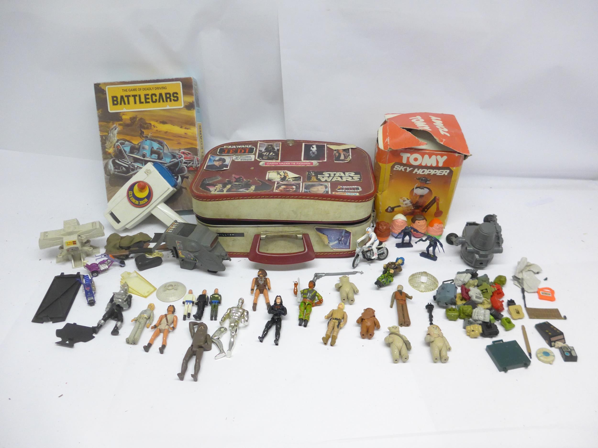 A collection of vintage playworn toys and action figures including Palitoy/Kenner Star Wars figures and vehicle parts, Battlestar Galactica, Star Trek, Clash Of The Titans, Matchbox MAC Mobile Actionm Command, Evel Knieval, Battlecars driving game, Tomy Skyhopper, etc.