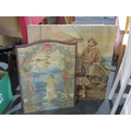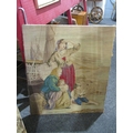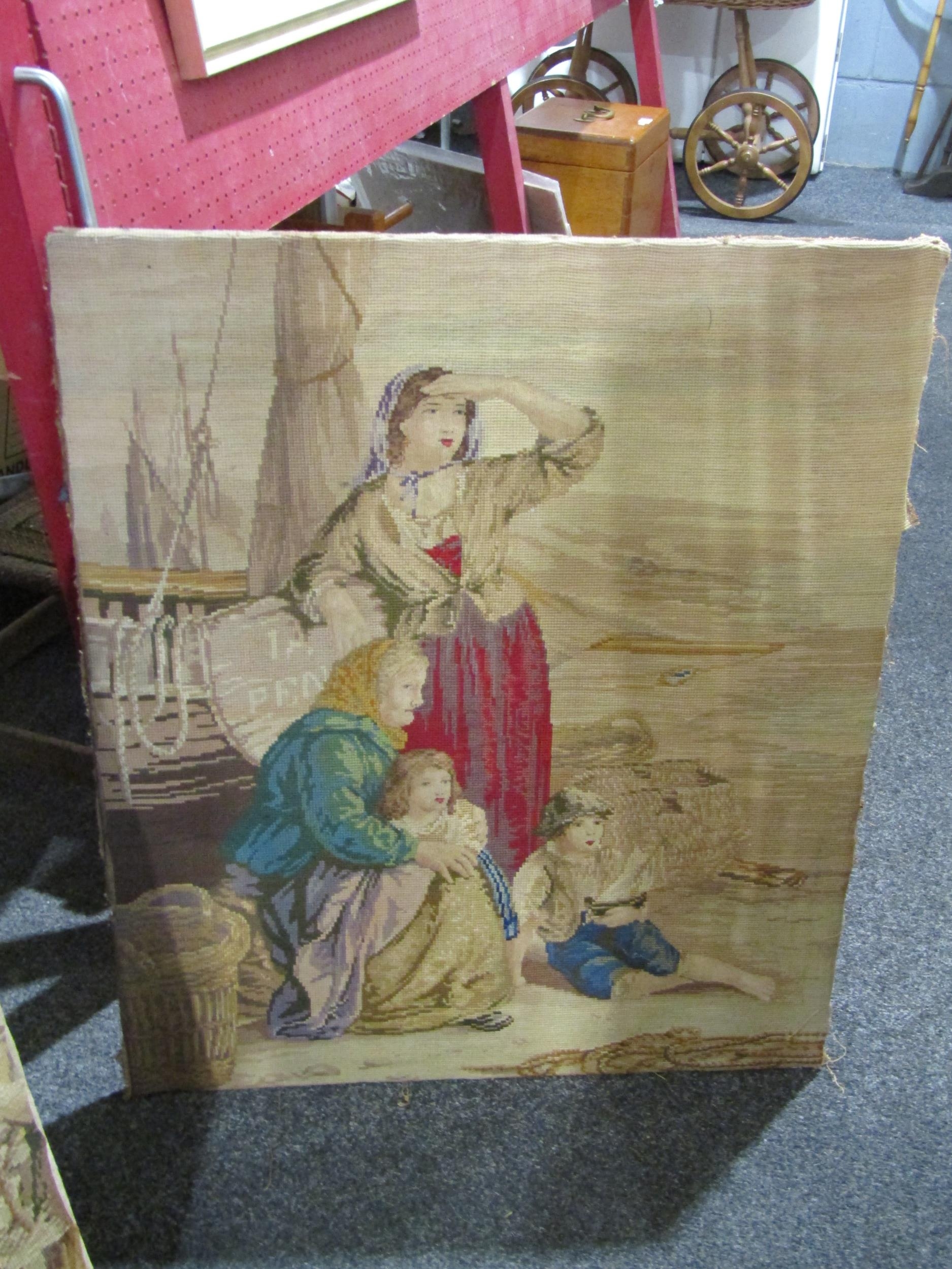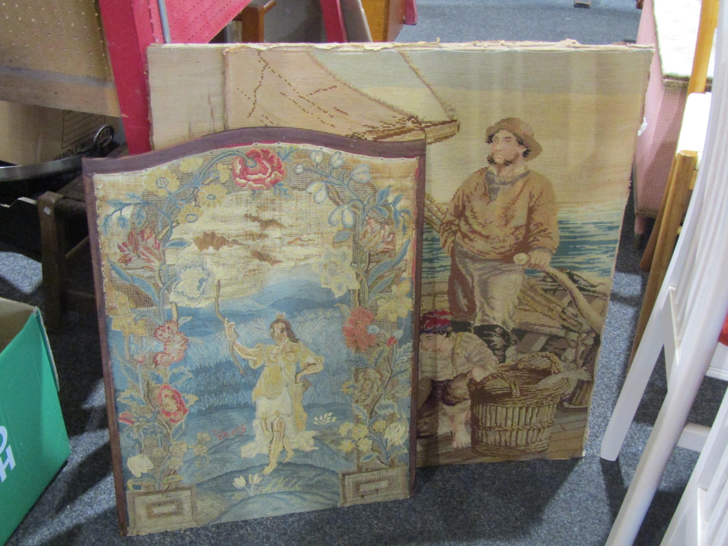 Three tapestries including fishermen and figures by boat, framed example of lady surrounded by flowers