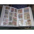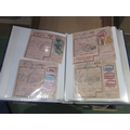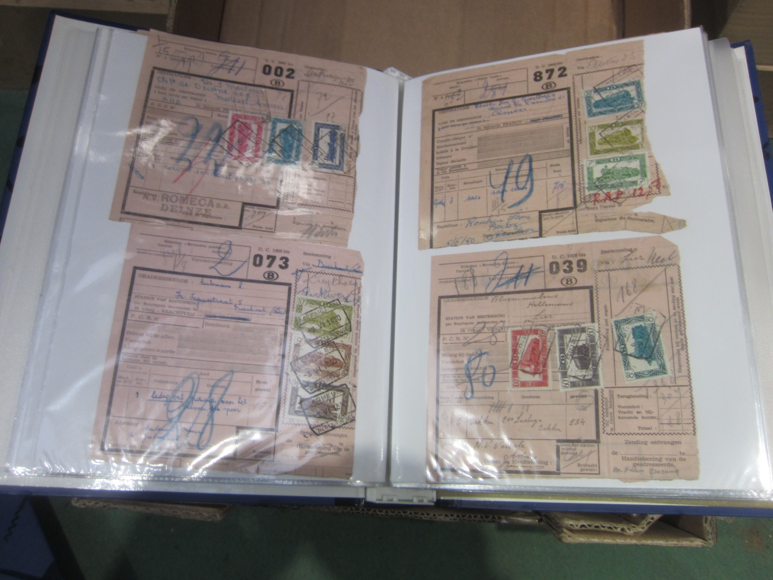 Three folders containing various Belgium parcel labels with attached stamps and Belgium railway lines no. 1-99 with hand drawn routes and attached stamps