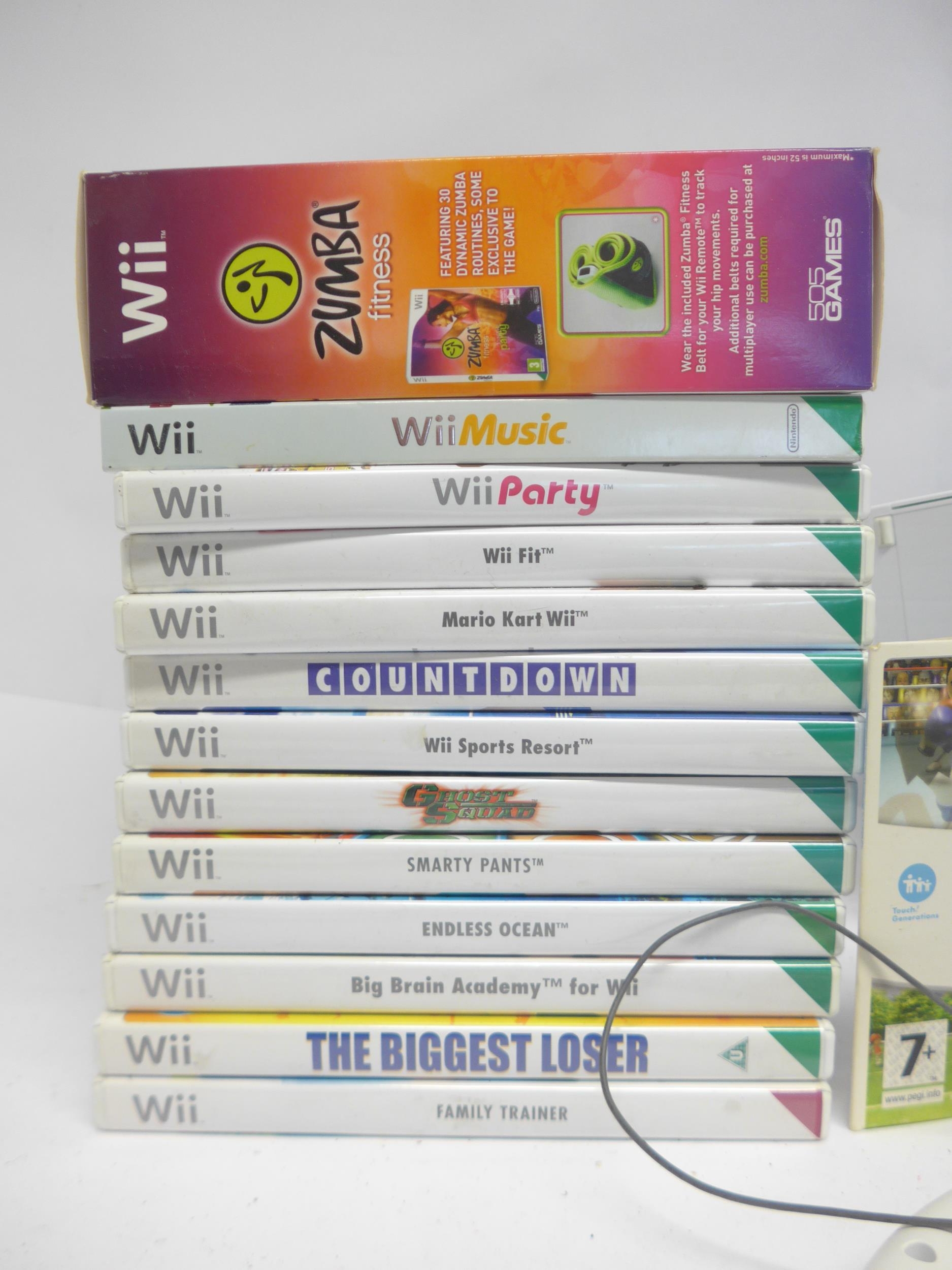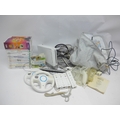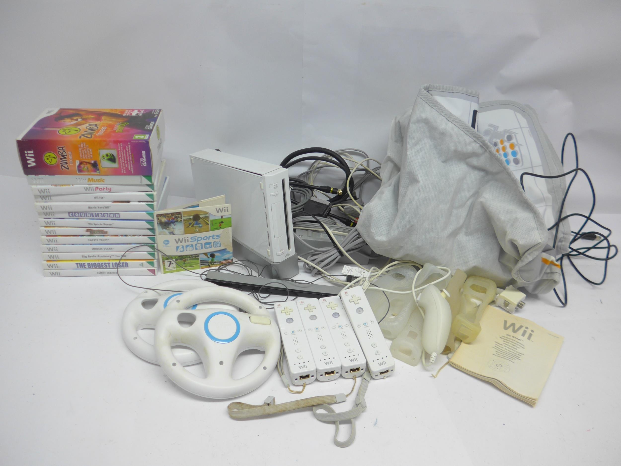 Retro Gaming - An unboxed Nintendo Wii computer games console with four controllers, one nunchuck, various games, leads, two steering wheels, dance mat, etc.