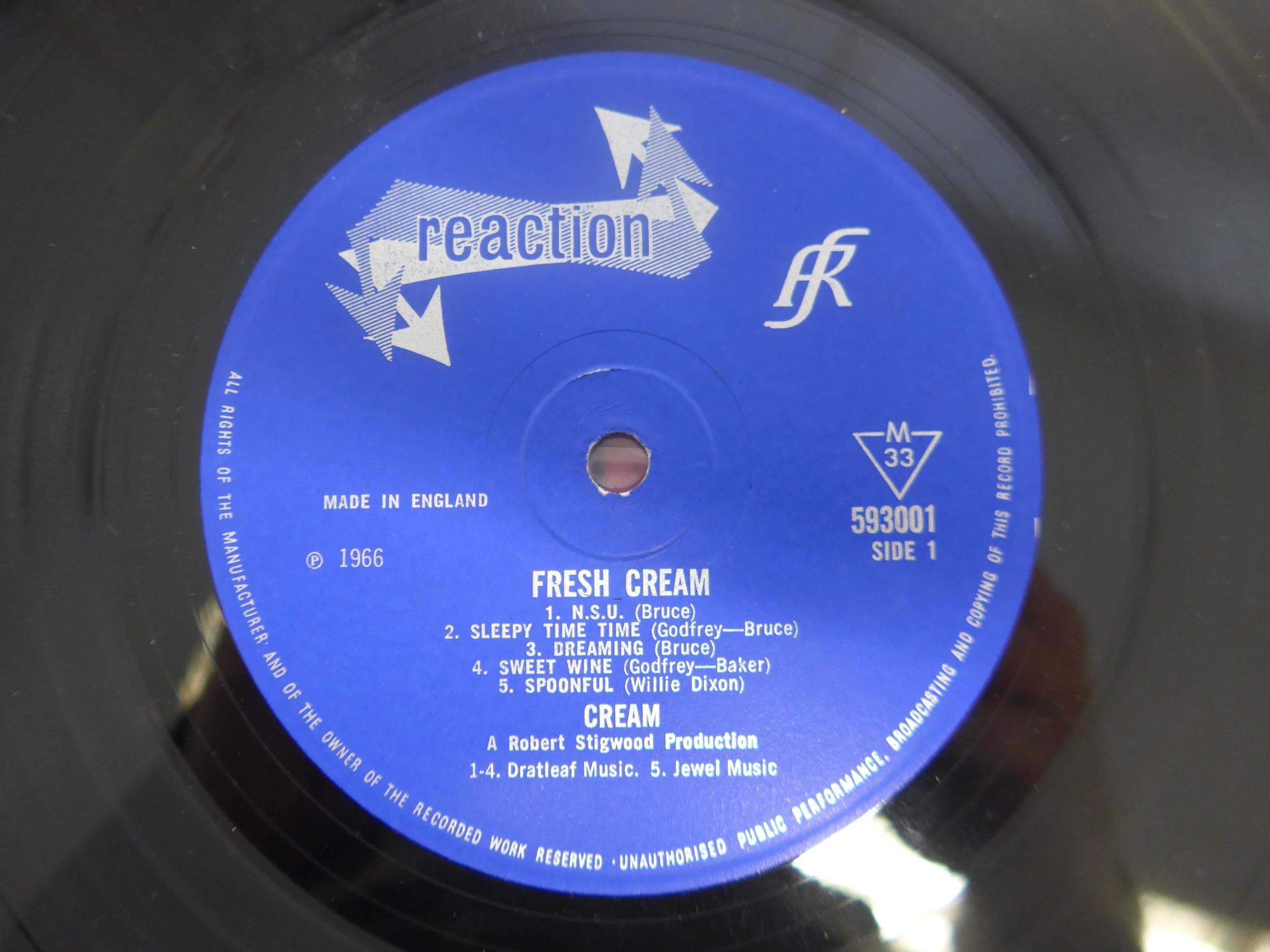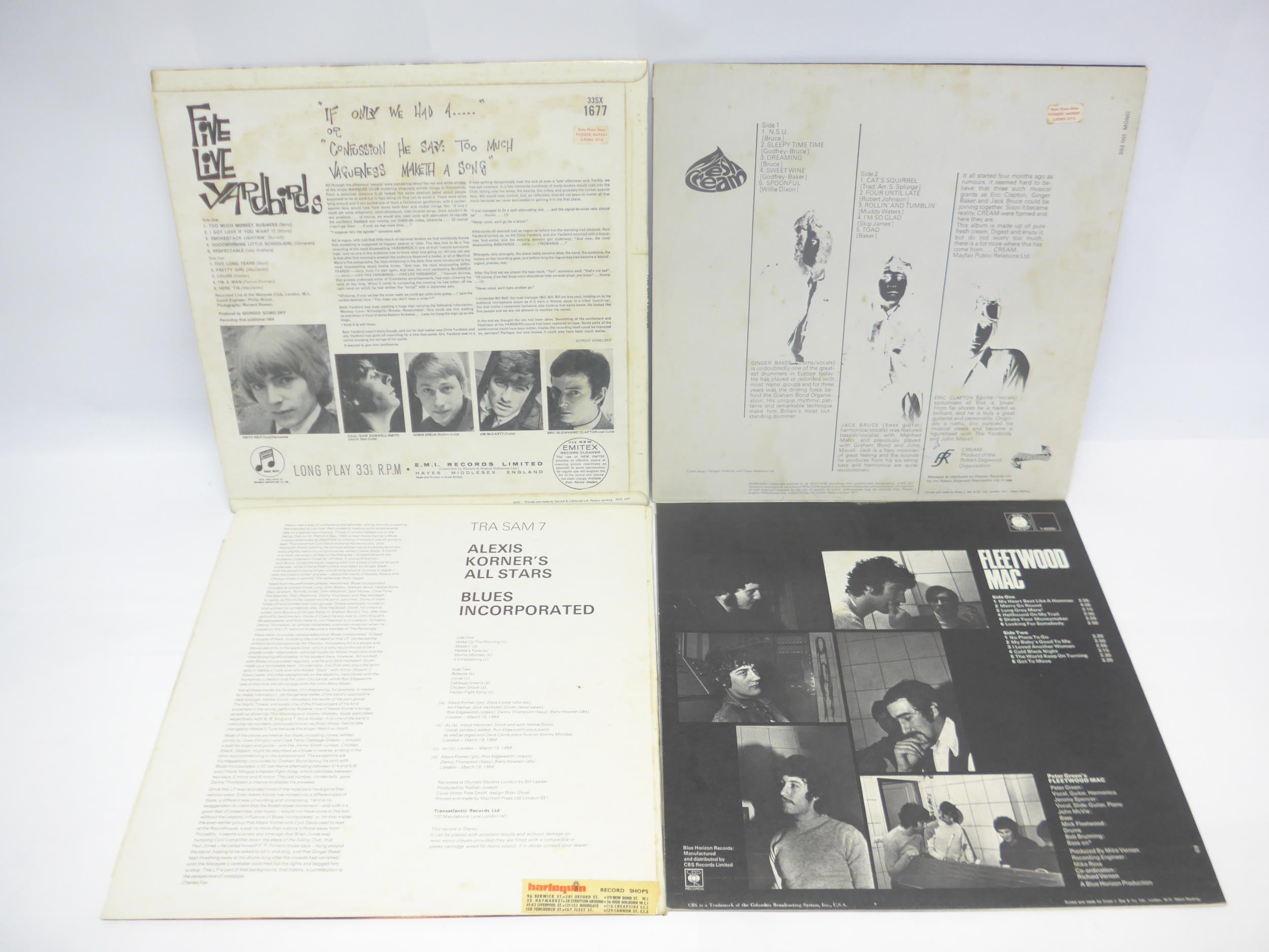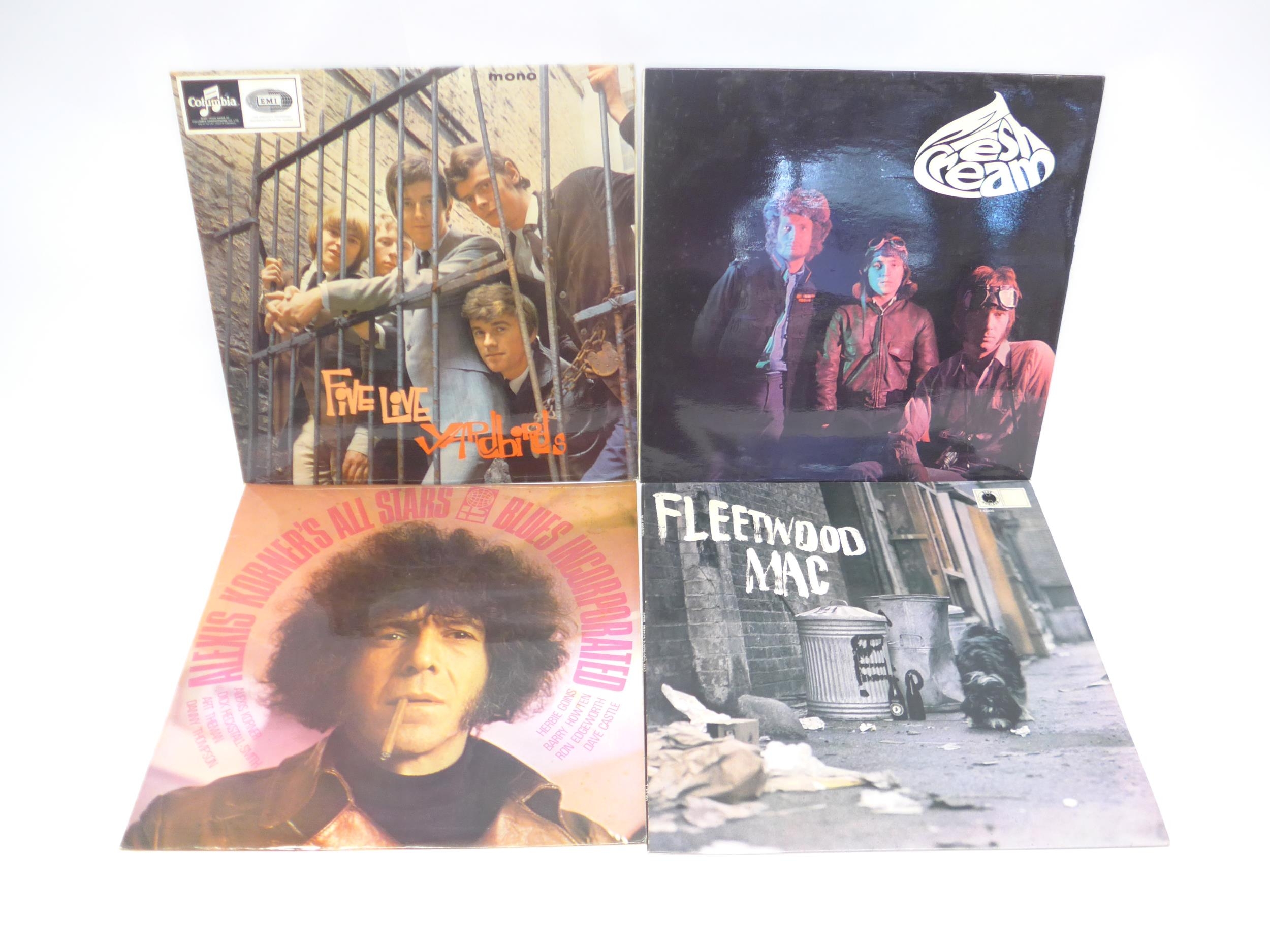 Blues Rock - Four LPs to include FLEETWOOD MAC: 'Peter Green's Fleetwood Mac' original UK mono pressing (Blue Horizon 7-63200, vinyl and sleeve EX), CREAM: 'Fresh Cream' original UK mono pressing (Reaction 593 001, vinyl VG, foxing and original shop sticker to back cover, sleeve otherwise VG+), BLUES INCORPORATED: 'Alexis Korner's All Stars' 1969 reissue (Transatlantic TRA SAM 7, vinyl VG+ with light foxing to labels, sleeve VG), and THE YARDBIRDS: 'Five Live Yardbirds' 1965 repress (Columbia 33SX 1677, vinyl VG, foxing and original shop sticker to back cover, sleeve otherwise VG+) (4)