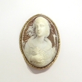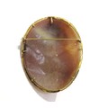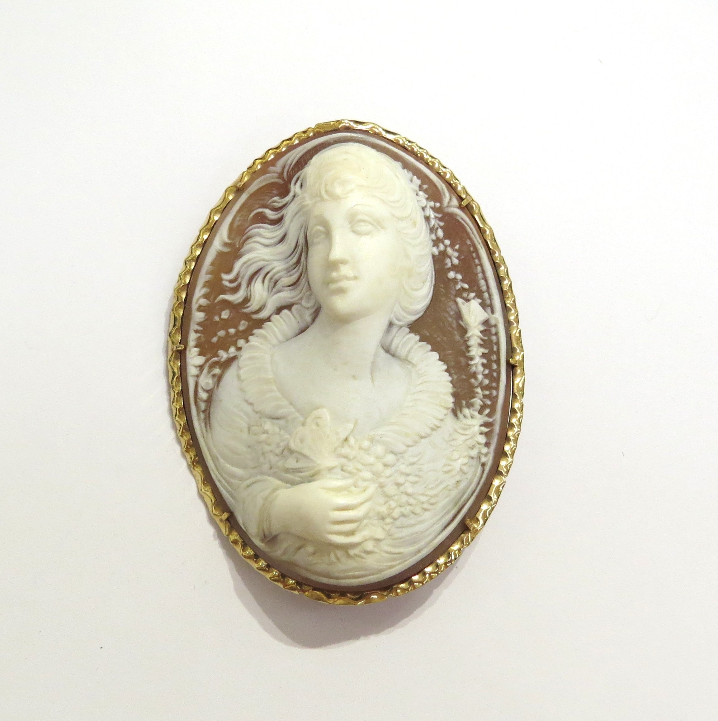 A finely carved shell cameo brooch depicting a female with the wind blowing in her hair and holding a butterfly, frame stamped 14k, 7cm long