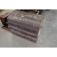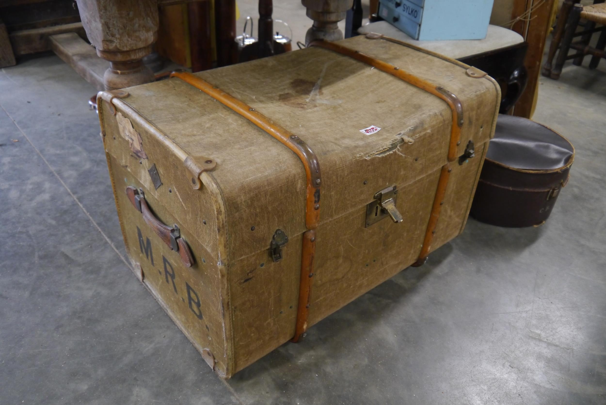 A Victorian green canvas, beech bound trunk with brass locks and leather handles a/f