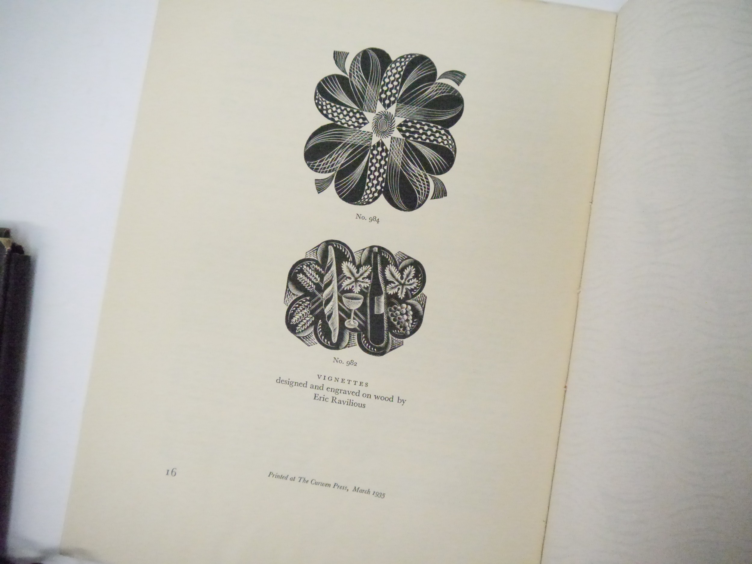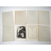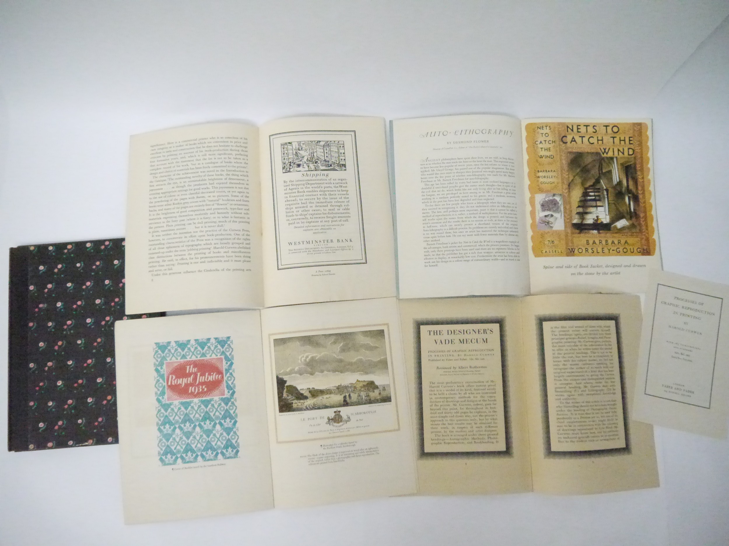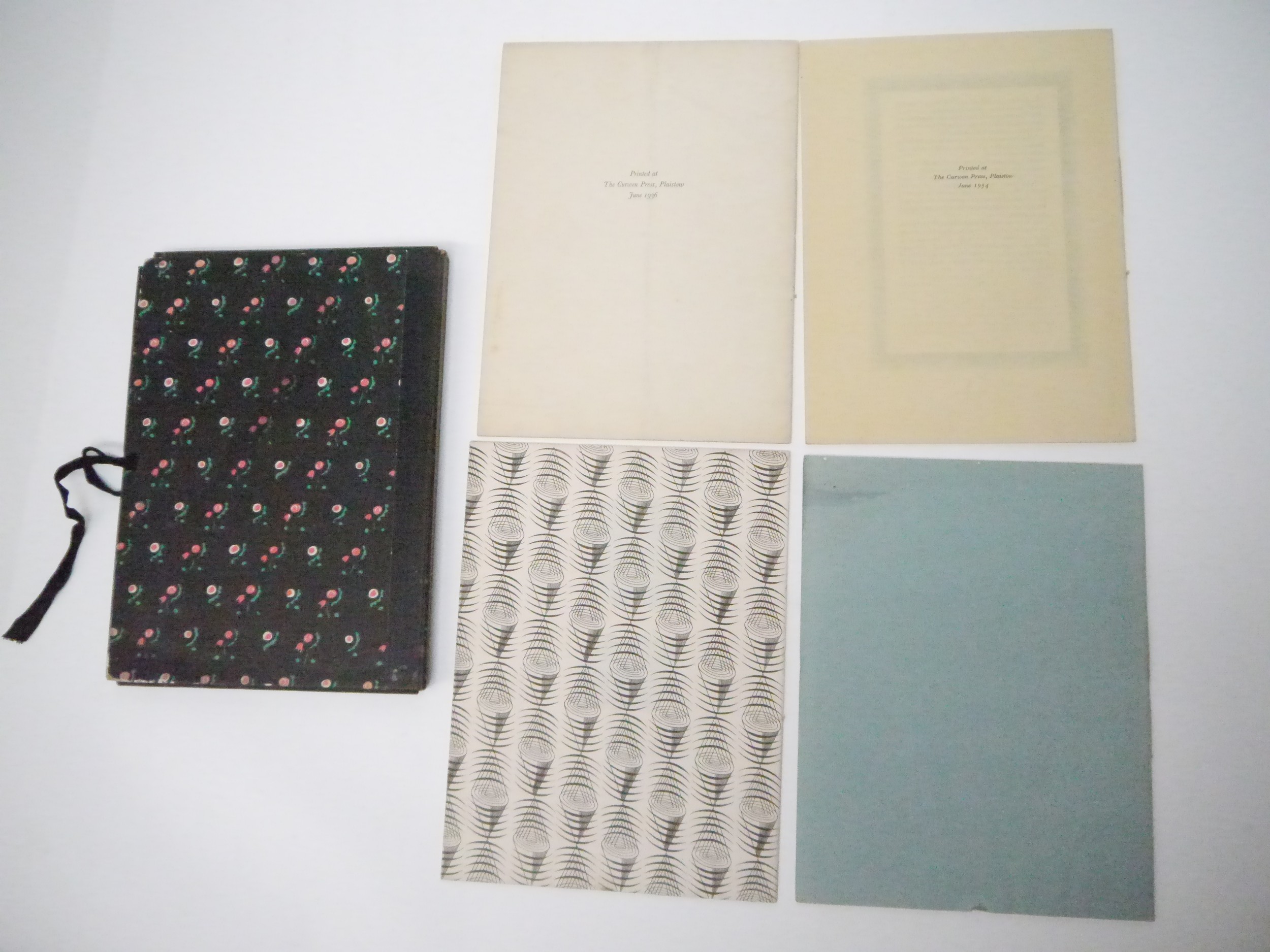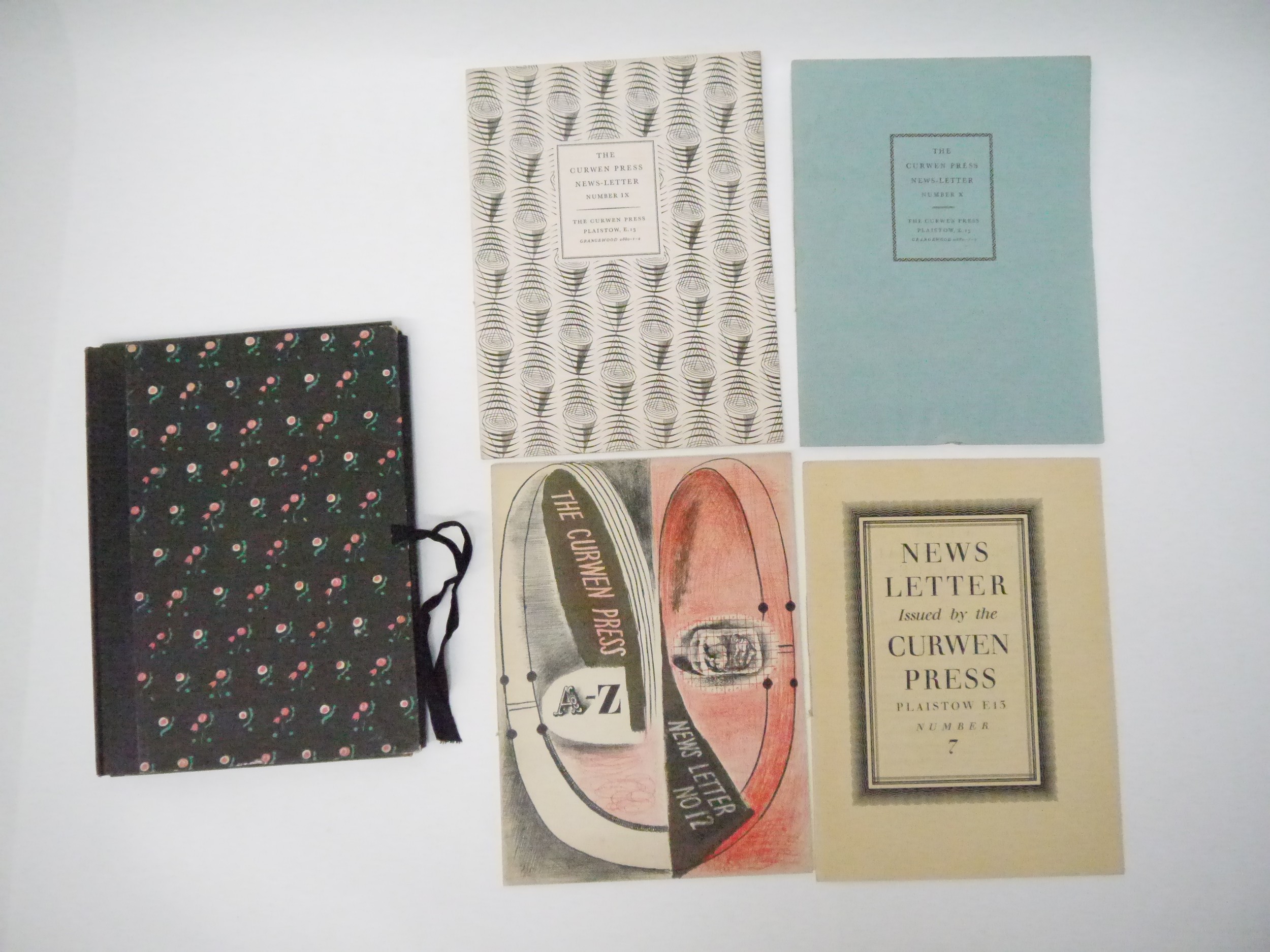 Curwen Press. 'The Curwen Press News-Letter', 4 issues, June 1934-June 1936, comprising issues no. 7,9,10 & 12, no.7, June 1934, 12pp, contents include, "A List of Classical Type Faces by A.F. Johnson". A review by Albert Rutherston of Harold Curwen's book, 'Processes Of Graphic Reproduction In Printing', together with laid in prospectus and order form for the book, crown 4to, original stitched printed wraps; no. 9, March 1935, (500), illustrations by Edward Bawden, Eric Ravilious, Albert Rutherston etc, 16pp, crown 4to, original stitched decorative patterned printed wraps by Edward Bawden; no. 10, July 1935, 10pp, includes an article, "Auto-Lithography", by Desmond Flower, with full page colour lithograph illustration by Barnett Freedman, together with an article and examples of the type-face Walbaum, crown 4to, original stitched printed wraps; no. 12, June 1936, original lithograph surrealistic cover design by Graham Sutherland, described by Pat Gilmour in her book 'Artists At Curwen', as a "rather splendid bivalve design with rich red and black crayoning", content includes ‘Job Printing’ by Beatrice Warde (writing as Paul Beacon) illustrated Eric Ravilious, etc., [12]pp, crown 4to, original stitched pictorial wraps, all housed in an original quarter black cloth gilt folder, Curwen Press patterned paper sides, ribbon ties (4)