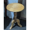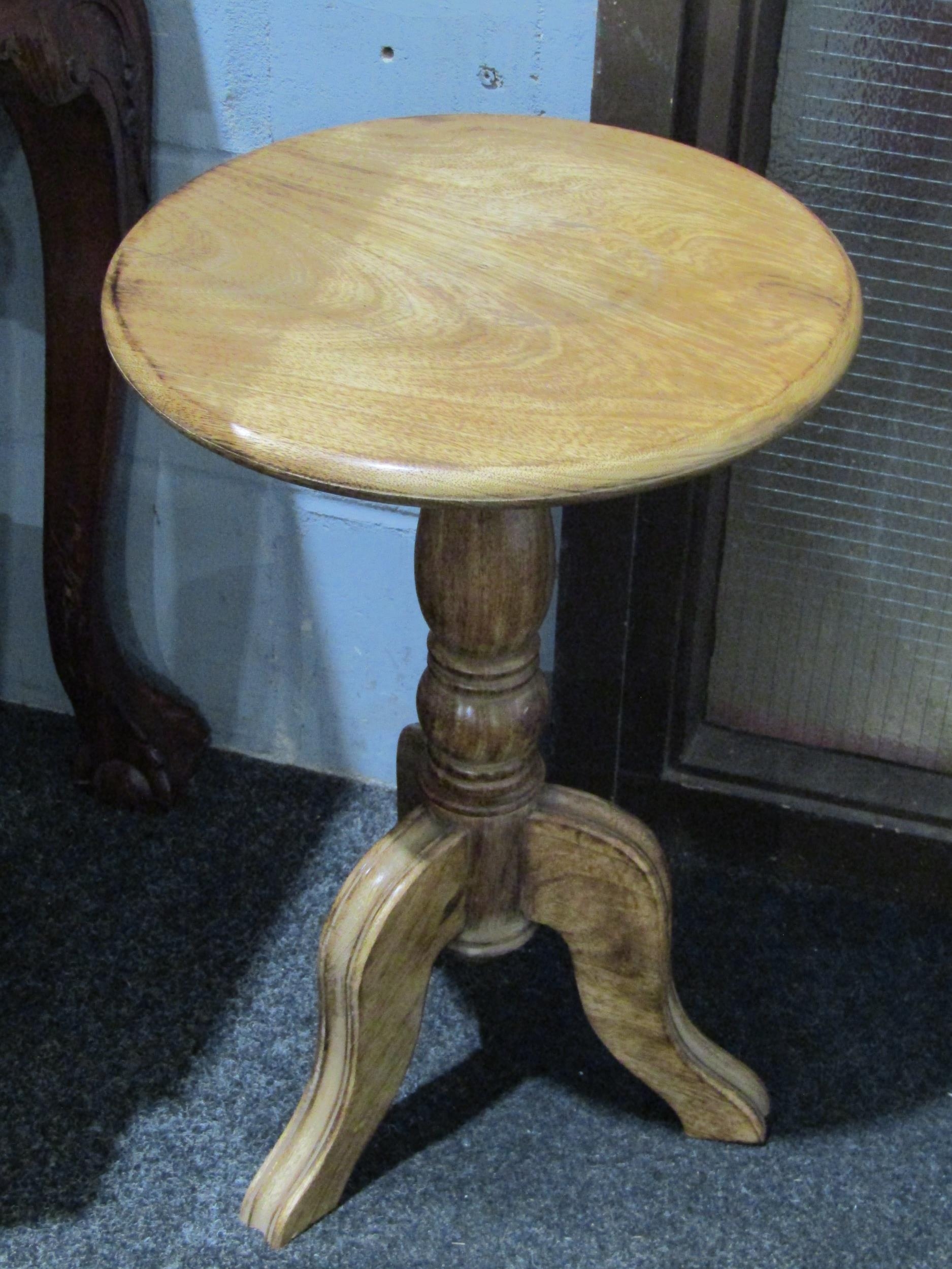 A modern oak tripod wine table with turned column, 55cm tall x 35cm diameter