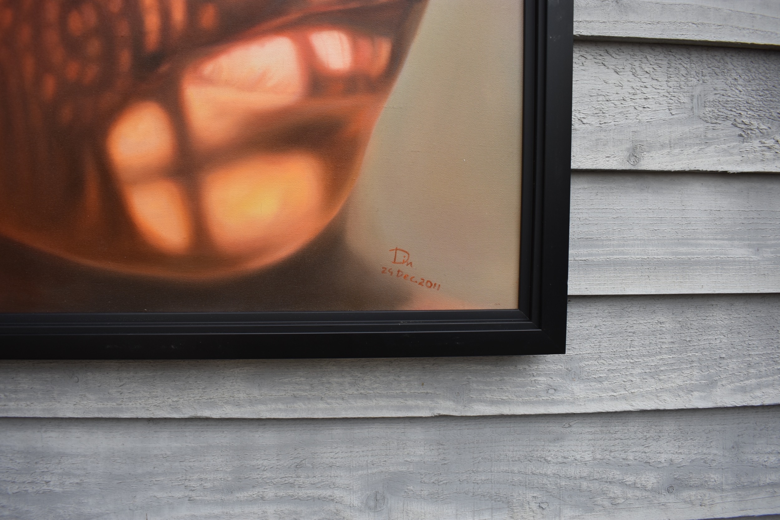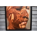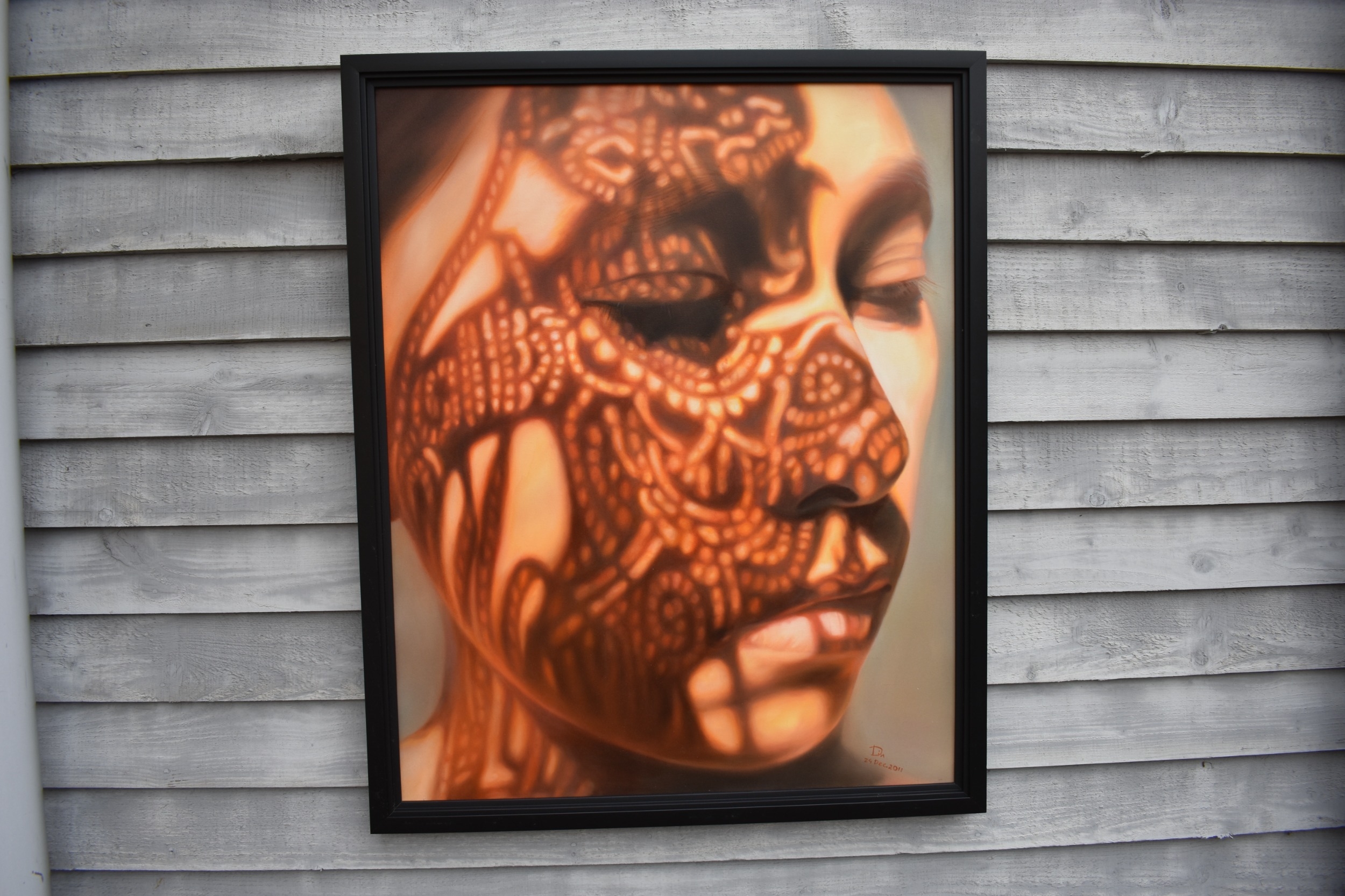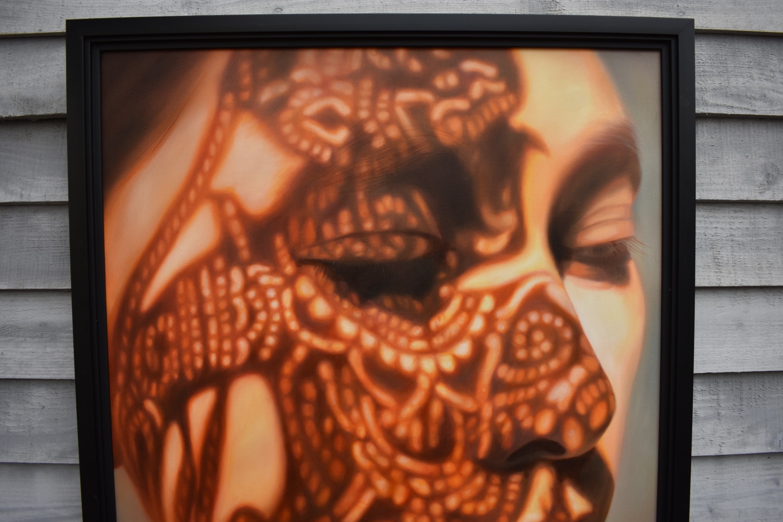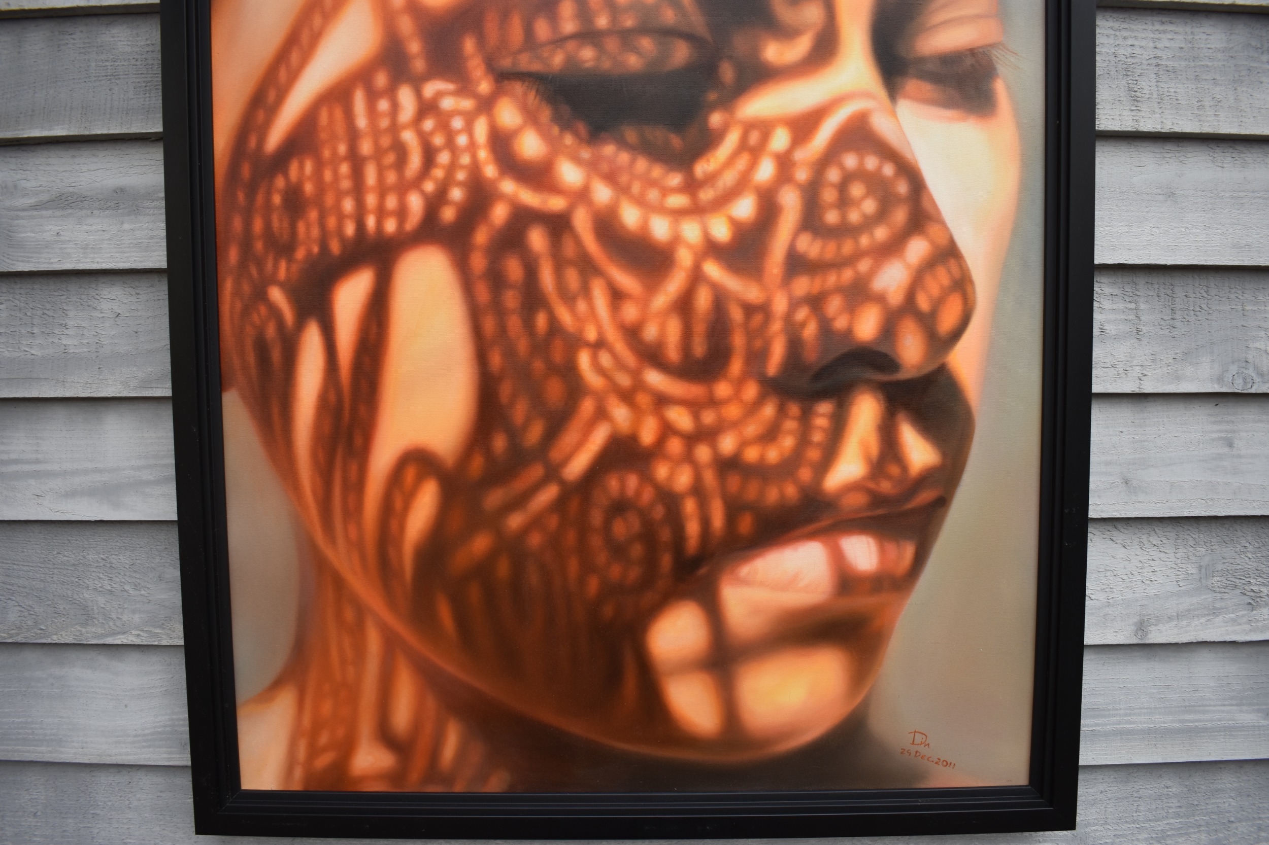 KARUNA PANUMES (b. 1967) Thai Contemporary Artist: Self-portrait executed in oils on canvas, in meticulous detail that make them stunningly life-like, they articulate her emotions with a spiritual intensity that's compelling and honest. Mysterious shadows and light patterns fall on her impassive features. These are rich in the symbolism of Thai culture. Dated 2011. 99cm x 79cm