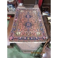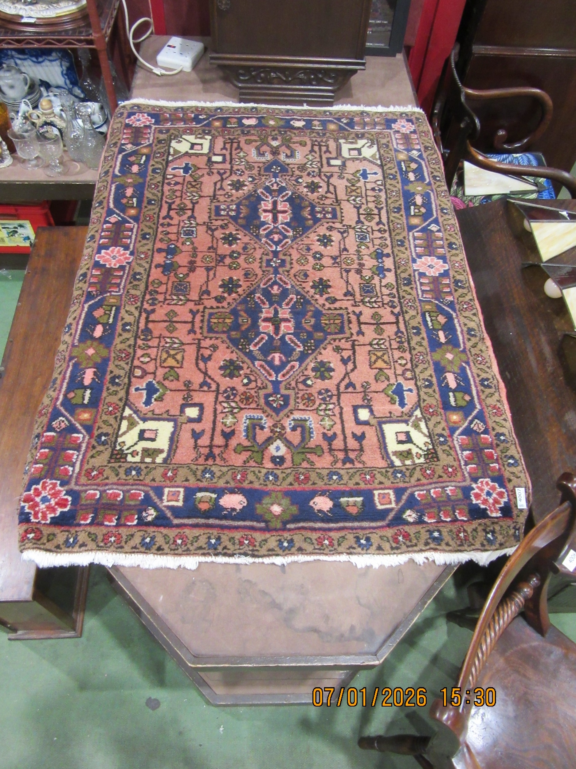 A pink and blue ground Turkish rug with geometric design, 102cm x 140cm