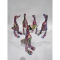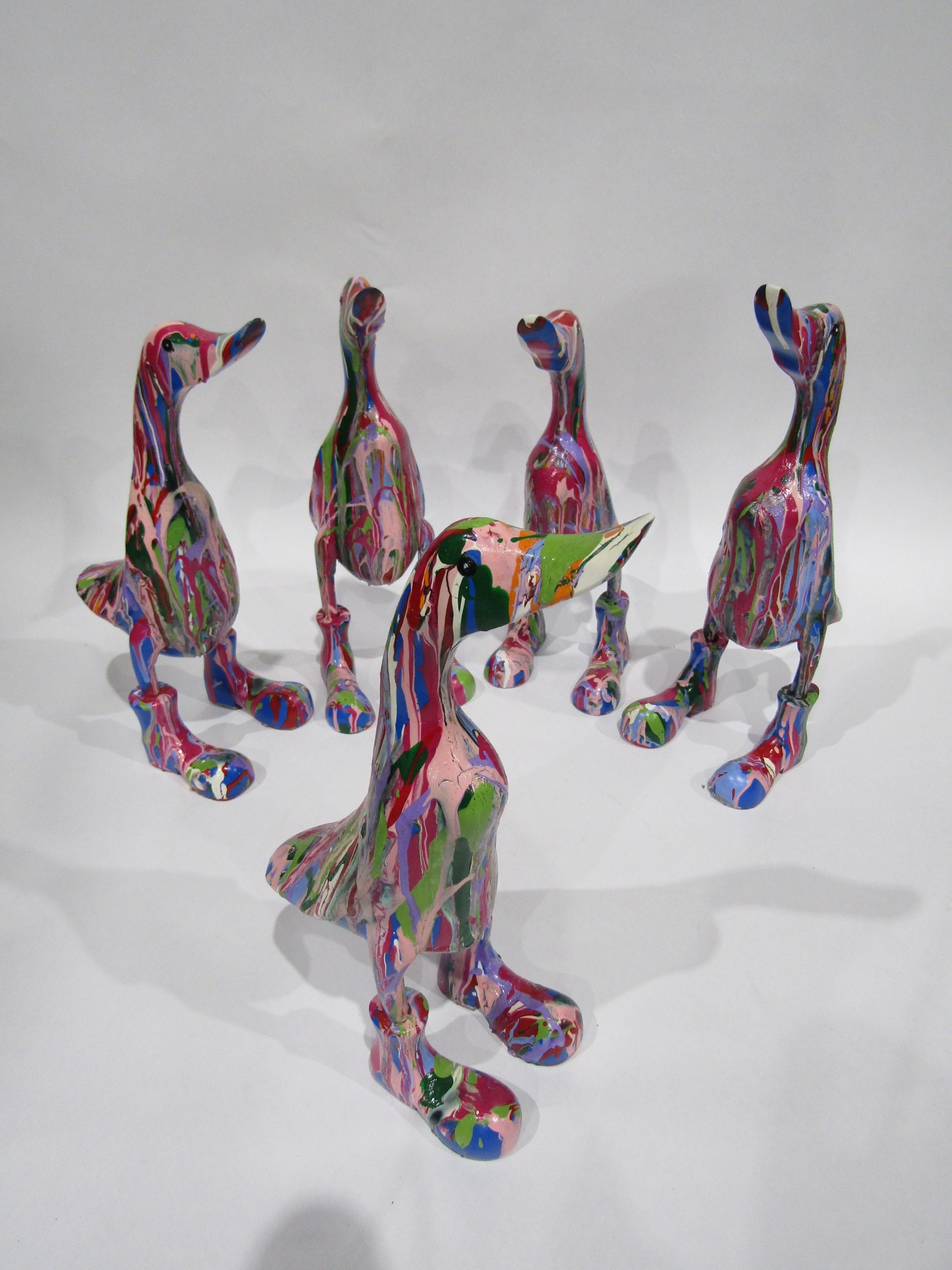 A set of five splatter painted ducks, tallest 34cm, all monogrammed DH2023 (5)