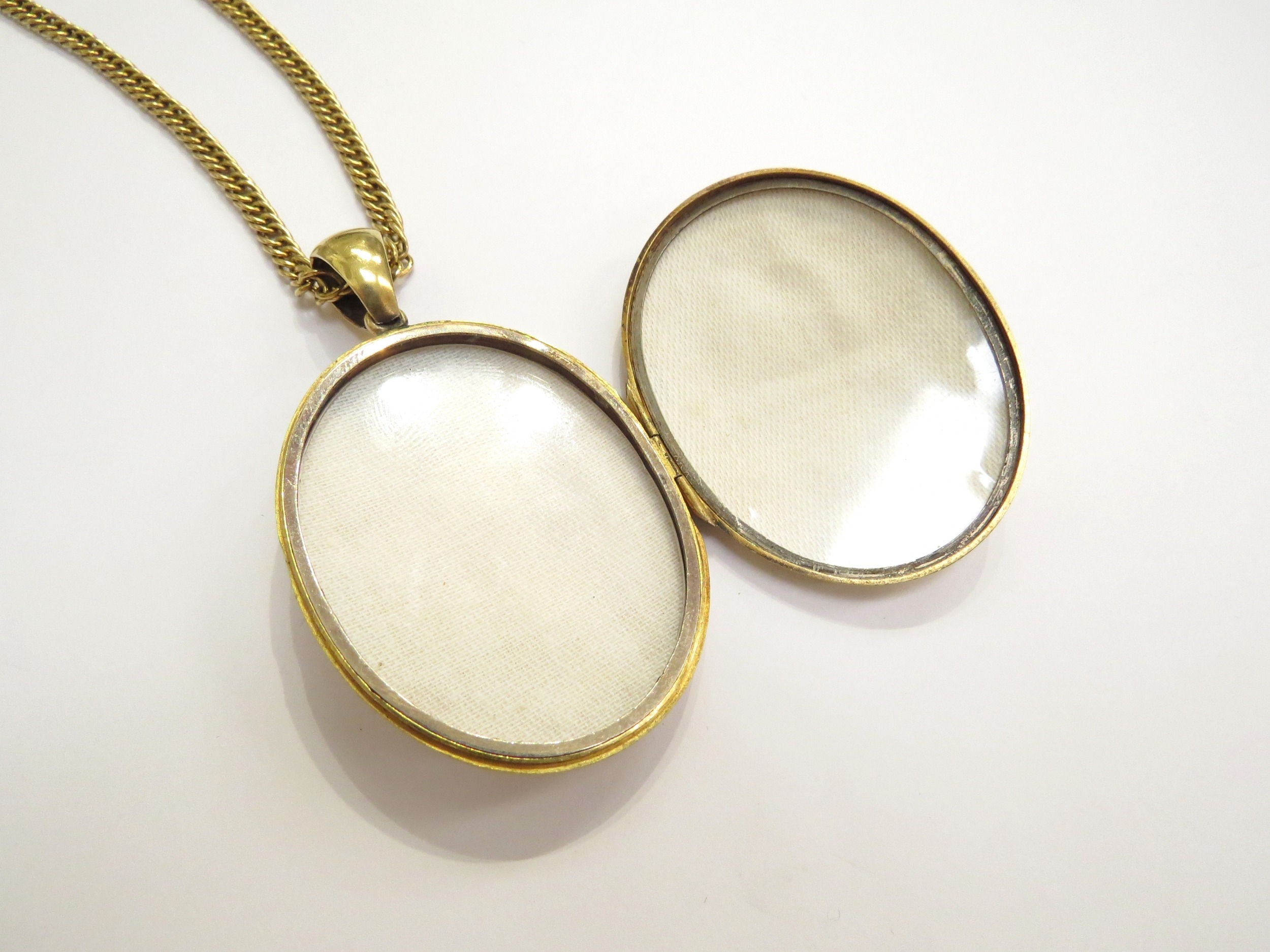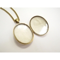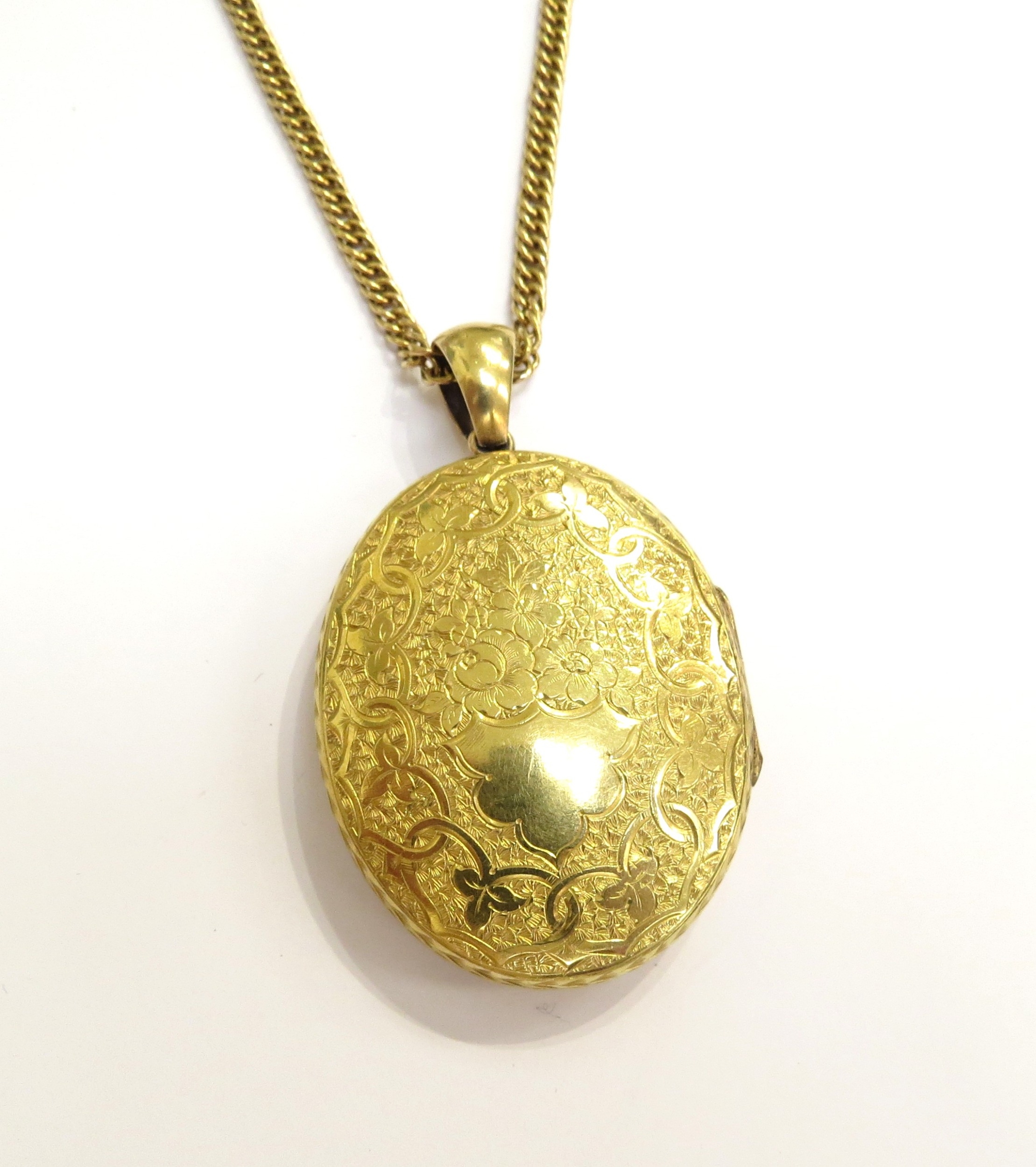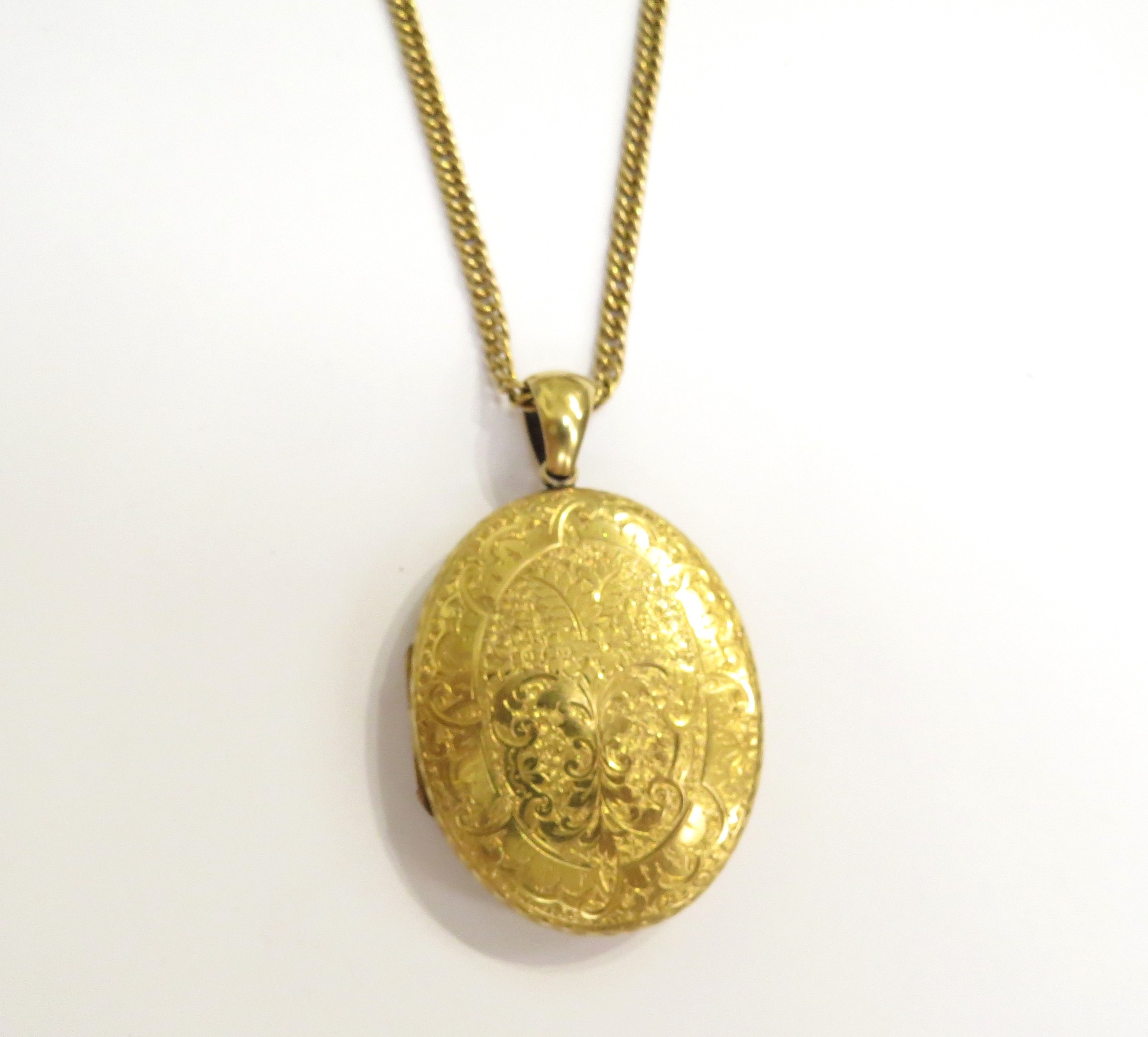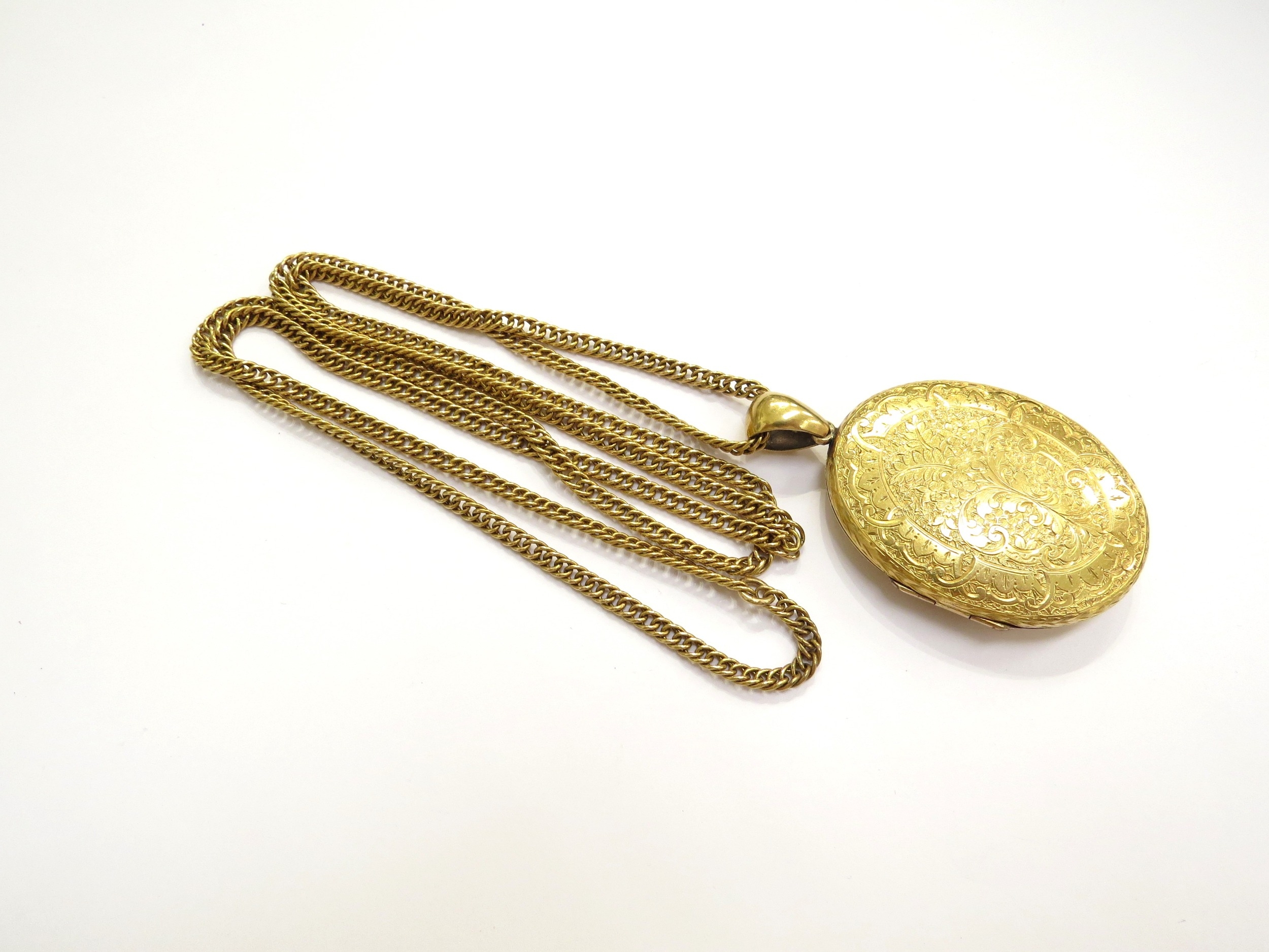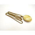 An oval finely engraved locket, unmarked gold, 5cm x 4cm hung on an unmarked gold chain, 84cm long, 44.6g total weight