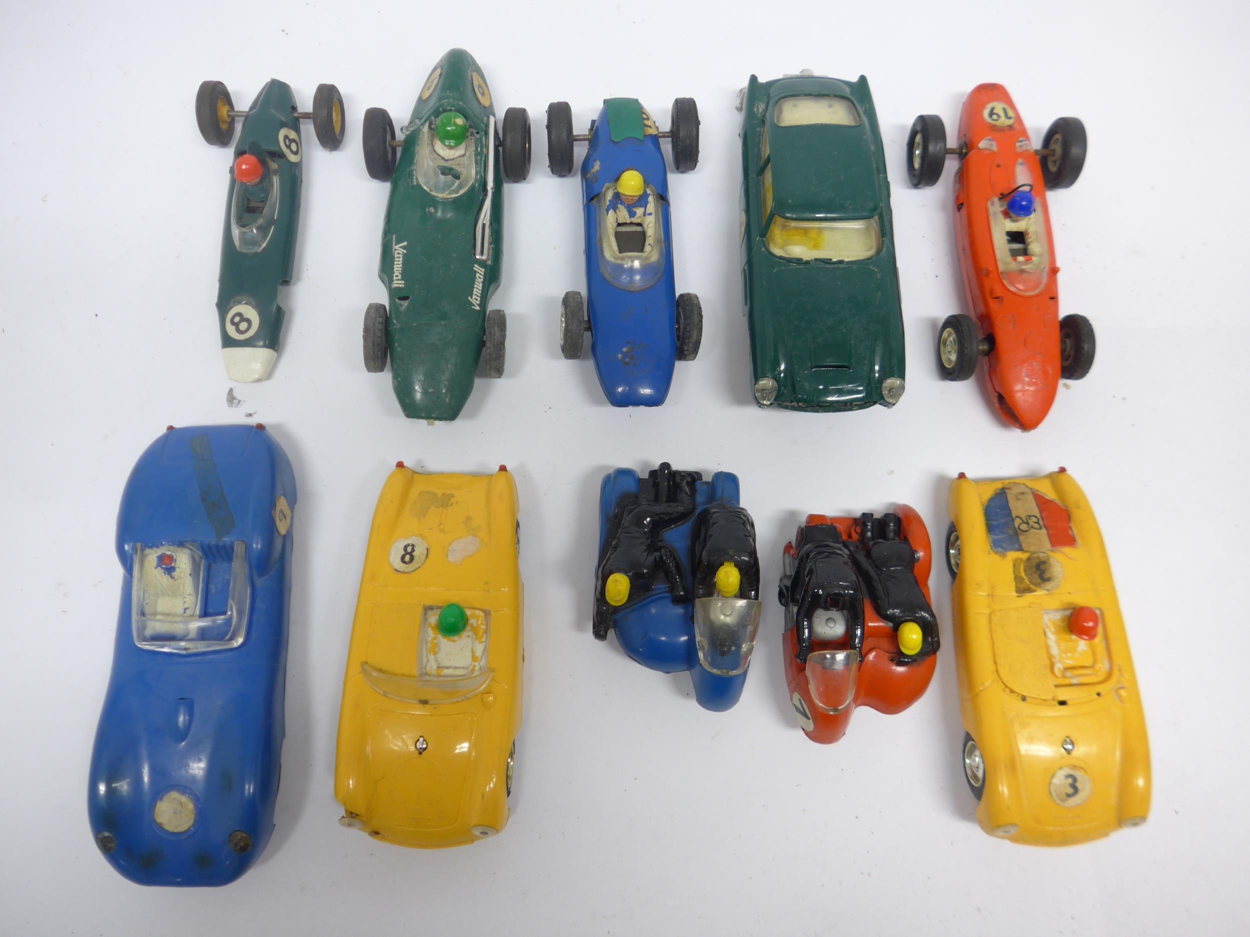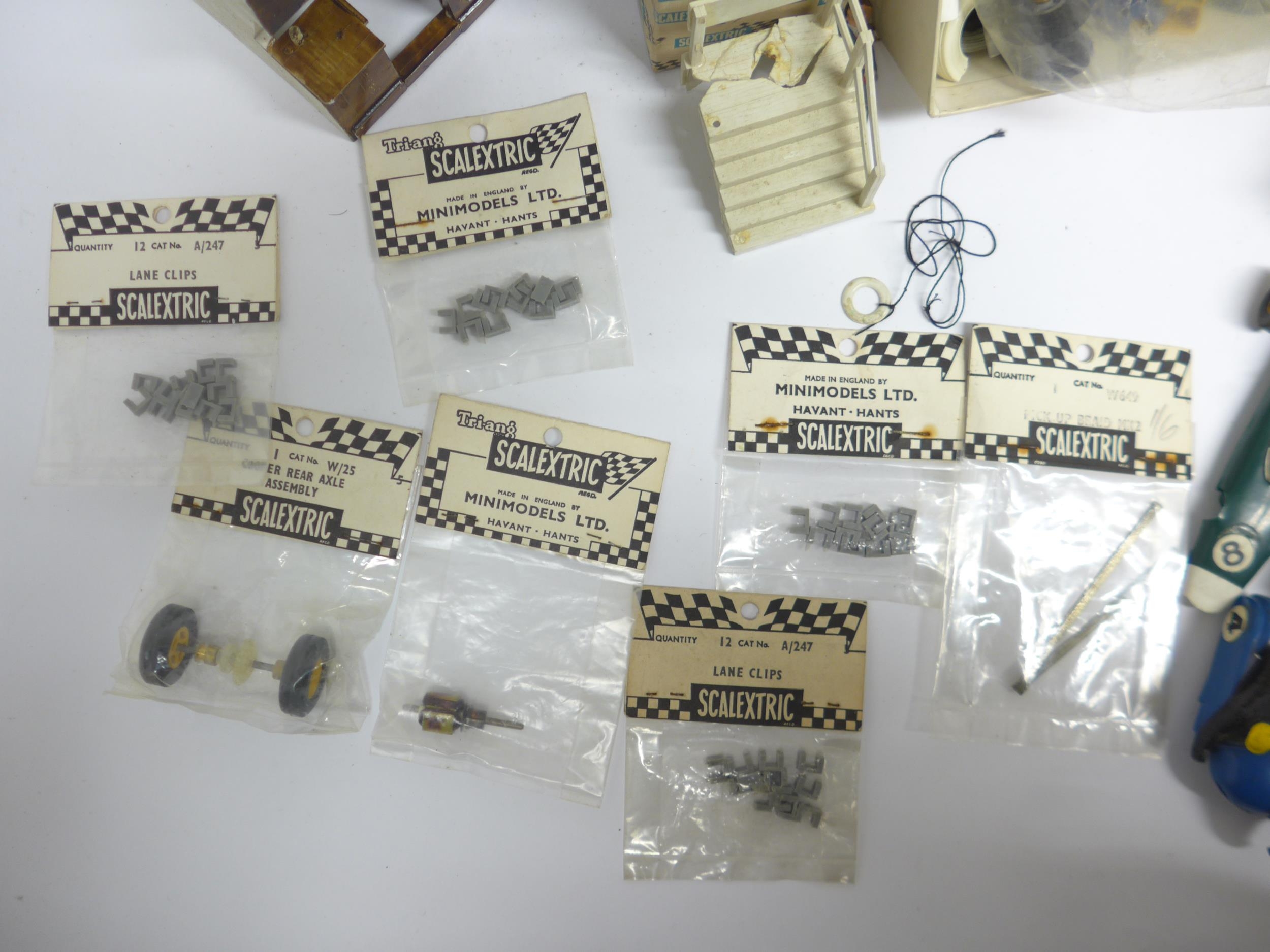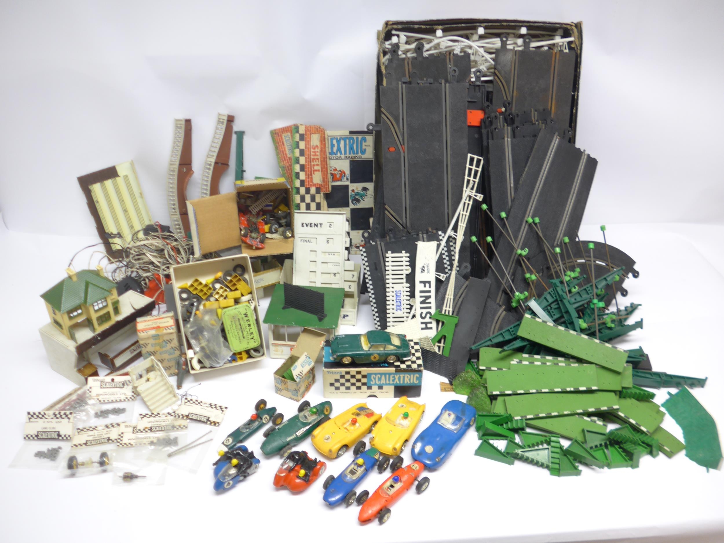 Ten playworn Triang Scalextric slot racing cars to include C57 Aston Martin (boxed), C61 Porsche, C56 Lister Jaguar, B1 Typhoon, B2 Hurricane, C55 Vanwall, C63 Lotus, C62 Ferrari and C72 B.R.M. (10, a/f). Together with assorted track, accessories and spares including some bagged items with header cards comprising A247 Lane Clips (x4), W649 Pick Up Braid Mk2, W582 Armature and Commutator R X and W25 Cooper Rear Assembly