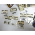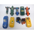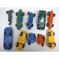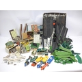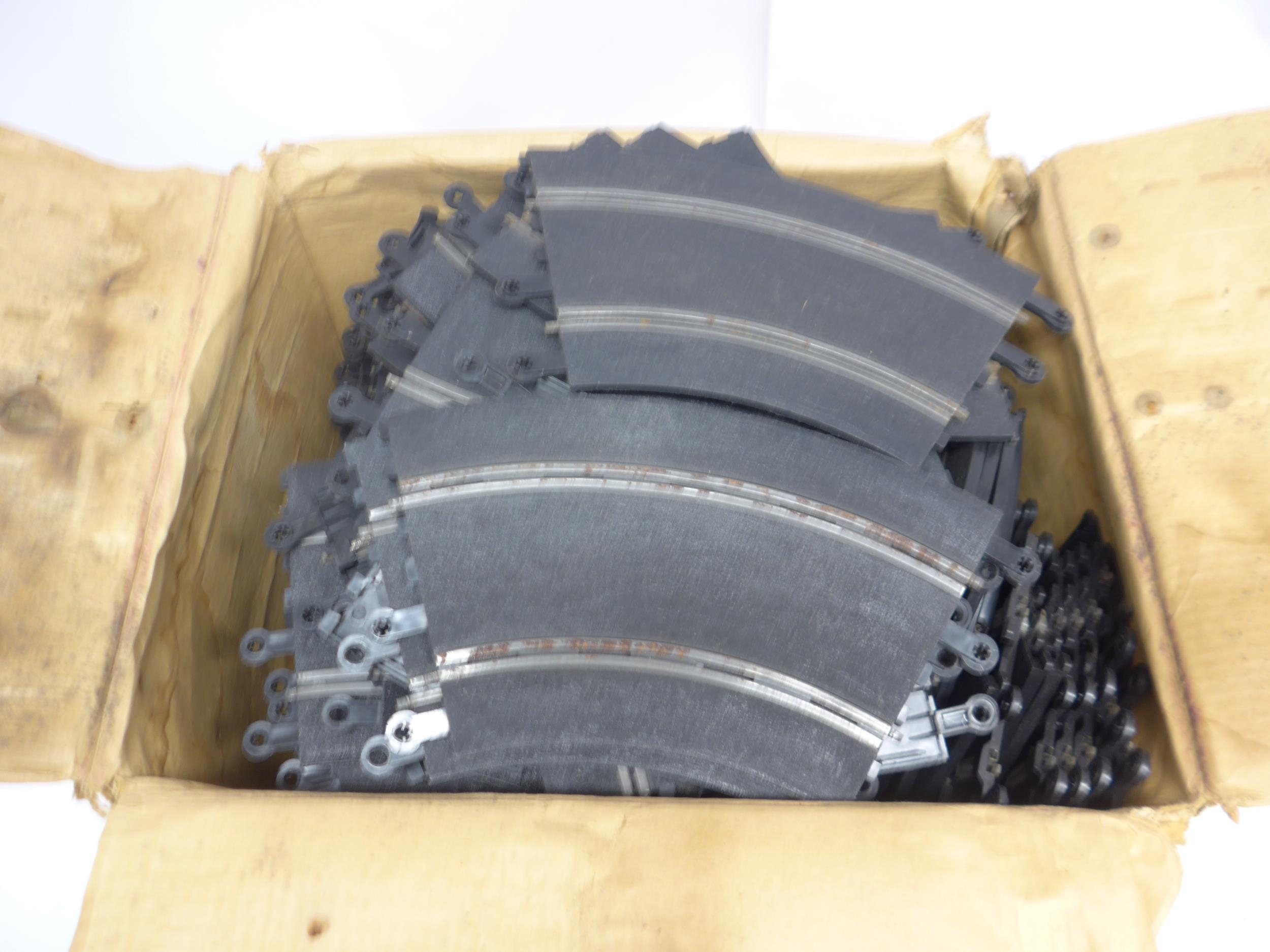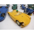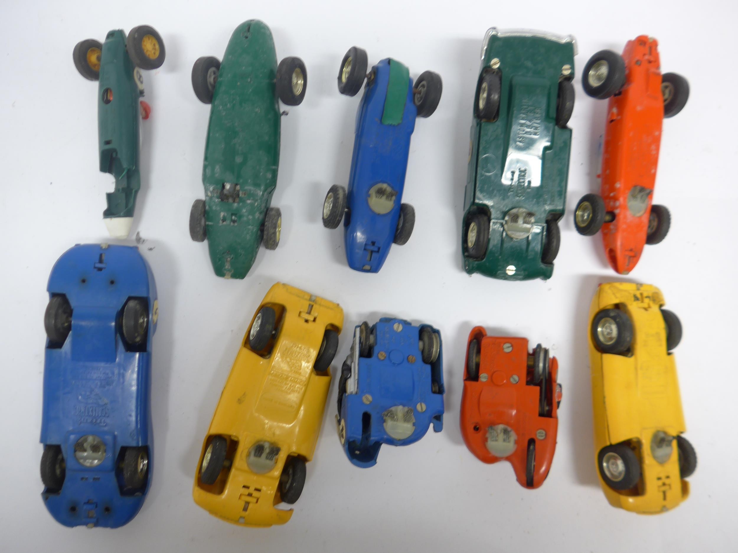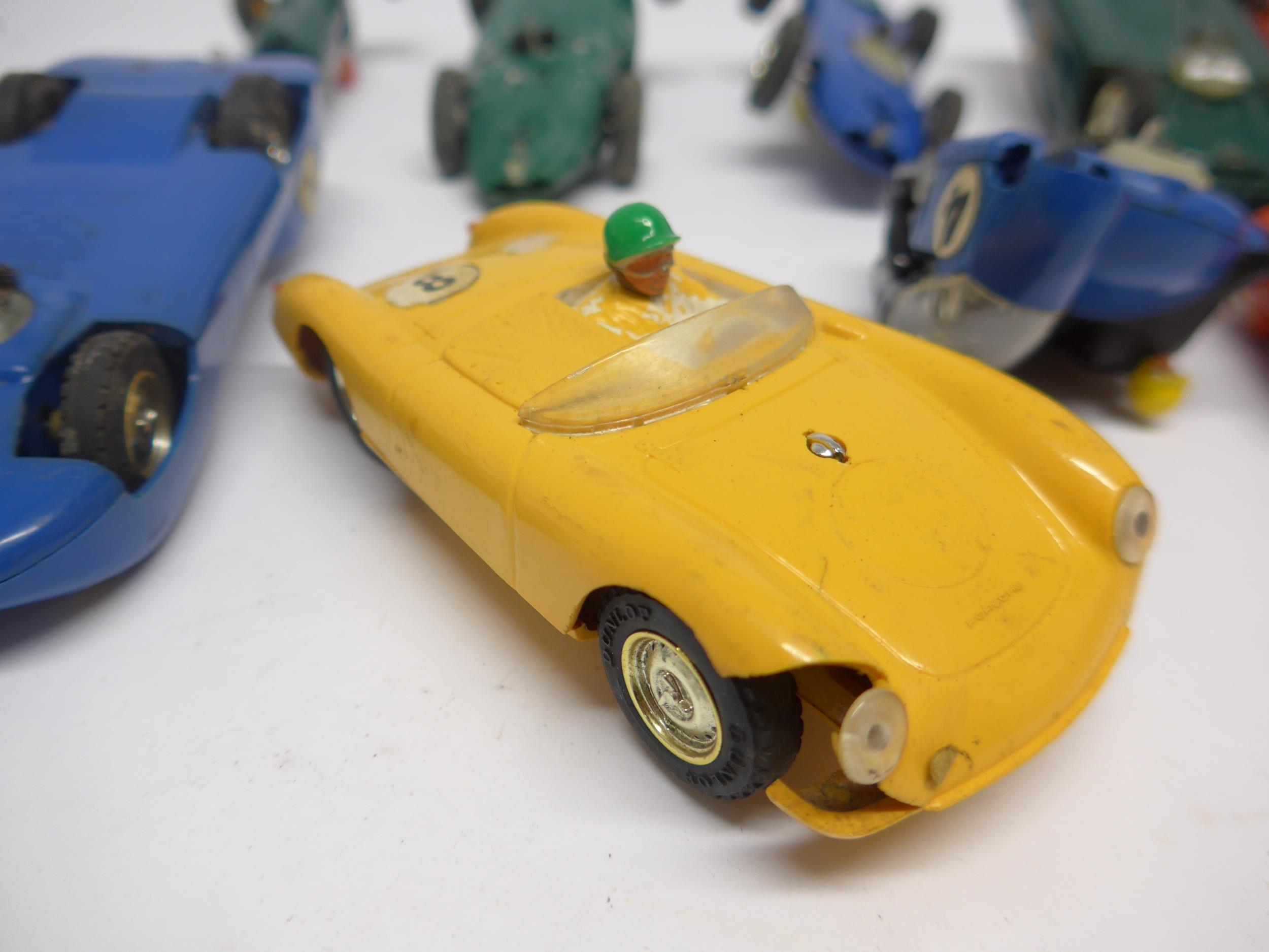 Ten playworn Triang Scalextric slot racing cars to include C57 Aston Martin (boxed), C61 Porsche, C56 Lister Jaguar, B1 Typhoon, B2 Hurricane, C55 Vanwall, C63 Lotus, C62 Ferrari and C72 B.R.M. (10, a/f). Together with assorted track, accessories and spares including some bagged items with header cards comprising A247 Lane Clips (x4), W649 Pick Up Braid Mk2, W582 Armature and Commutator R X and W25 Cooper Rear Assembly