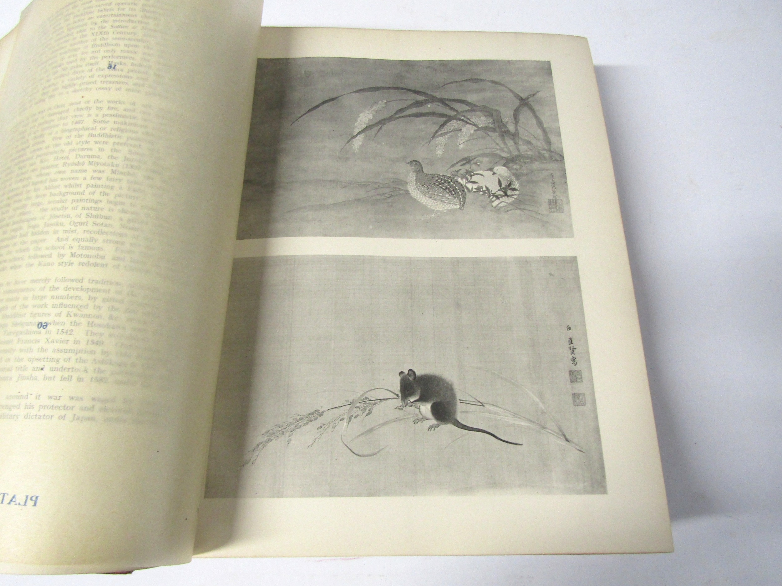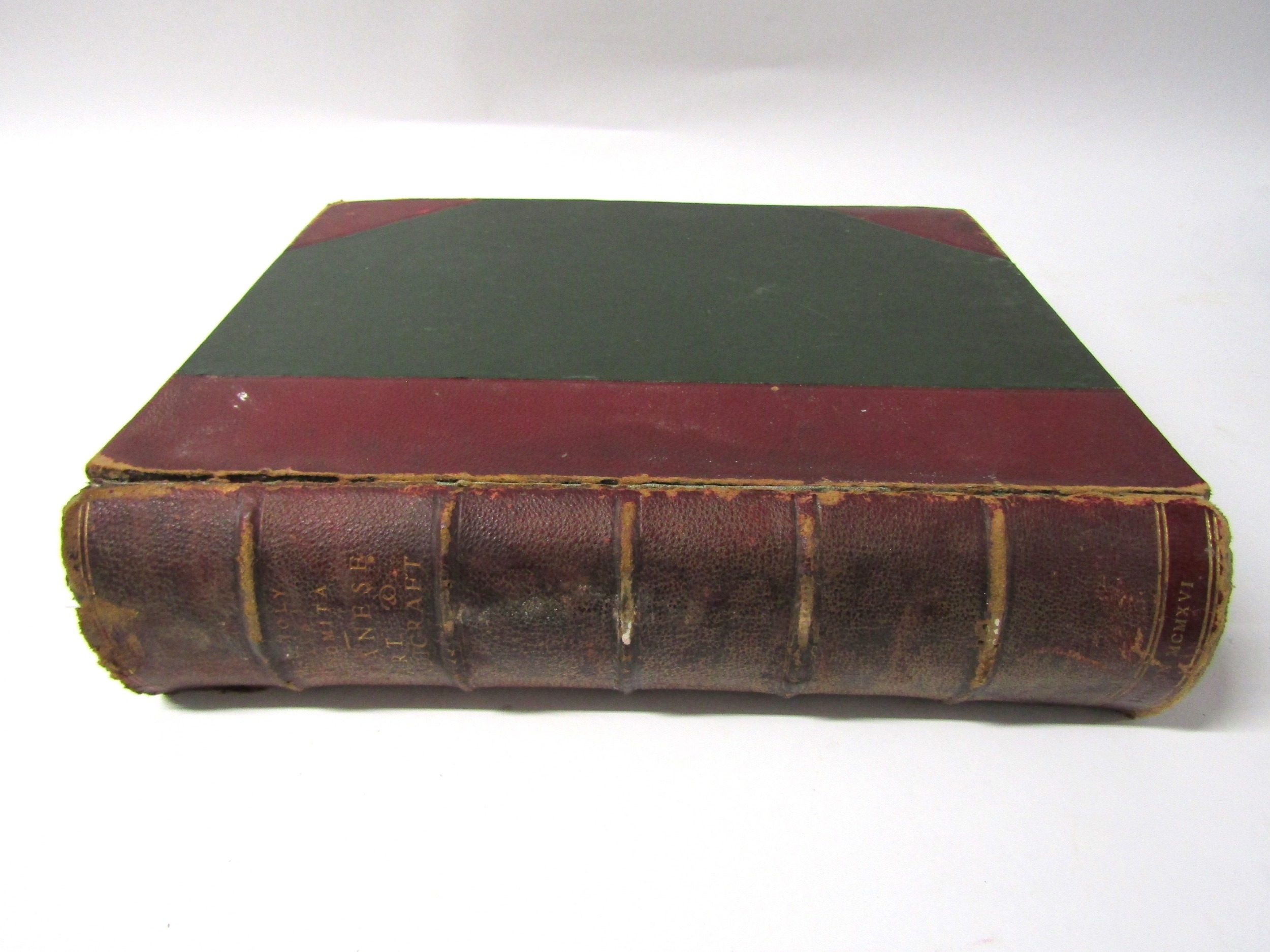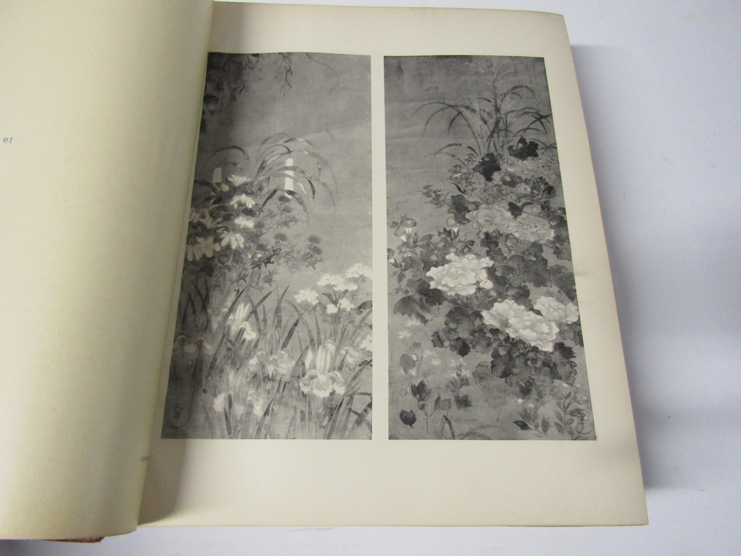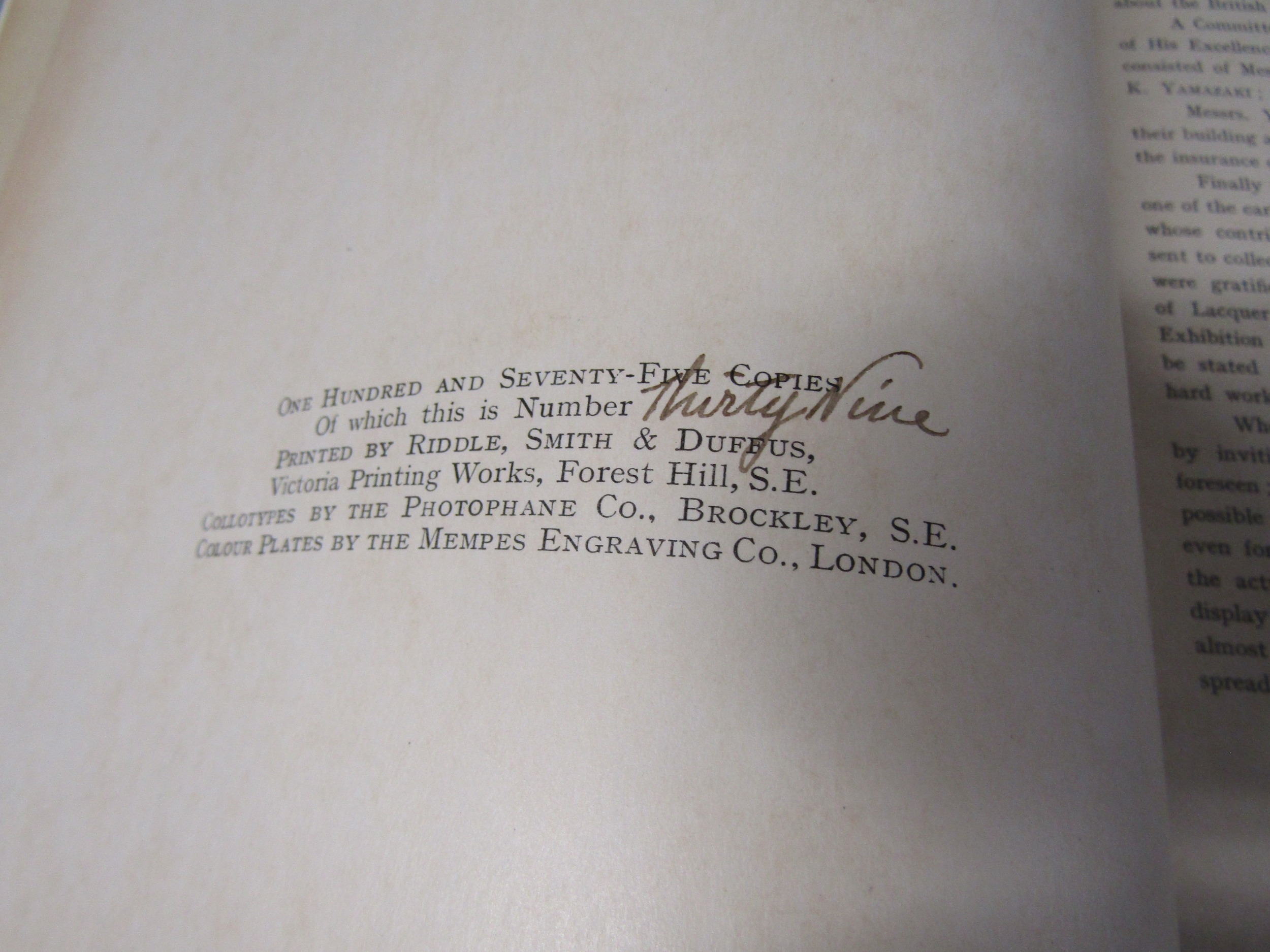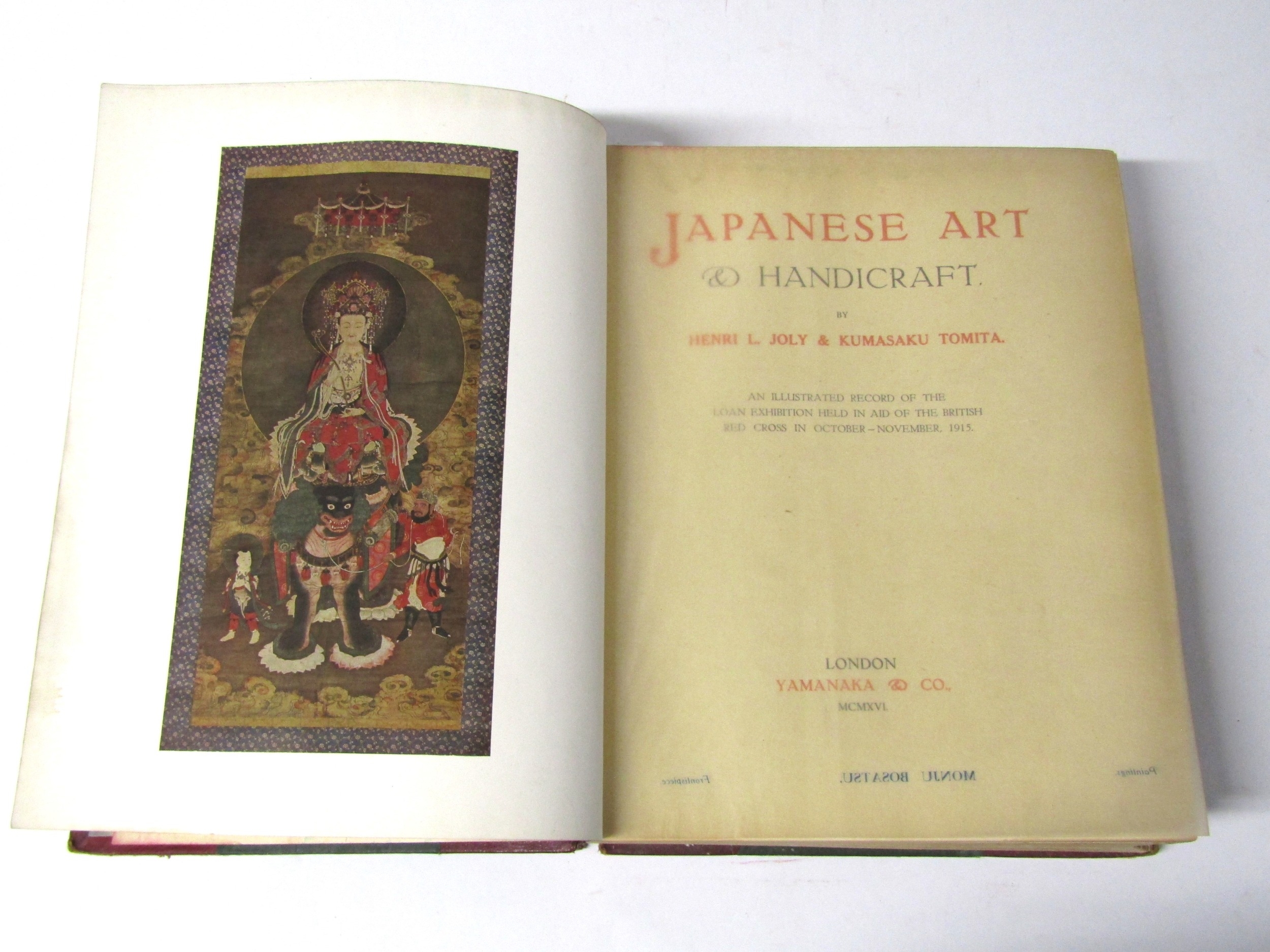 (Japan, Art, Antiques.) Henri L. Joly & Kumasaku Tomita: 'Japanese Art & Handicraft: An Illustrated Record of the Loan Exhibition Held in Aid of the British Red Cross in October - November, 1915', London, Yamanaka & Co, 1916, limited edition, number 39 of 175 copies only, 2 volumes bound in 1, 170 plates from photographs (several colour), all tissue guarded with printed captions to guards, depicting Japanese paintings, prints & drawings, sculpture and carvings, netsuke, lacquer, inro, swords, sword furniture, metal work varia, pottery and enamels, pipe cases and pouches, miscellanea, general title page, separate printed title pages for each volume, list of contributors at front, 213pp text + plates, continuous pagination, large thick 4to (31.5 x 25cm), old half calf gilt (worn, front joint weak), top edge gilt. The very scarce original 1916 limited edition copy