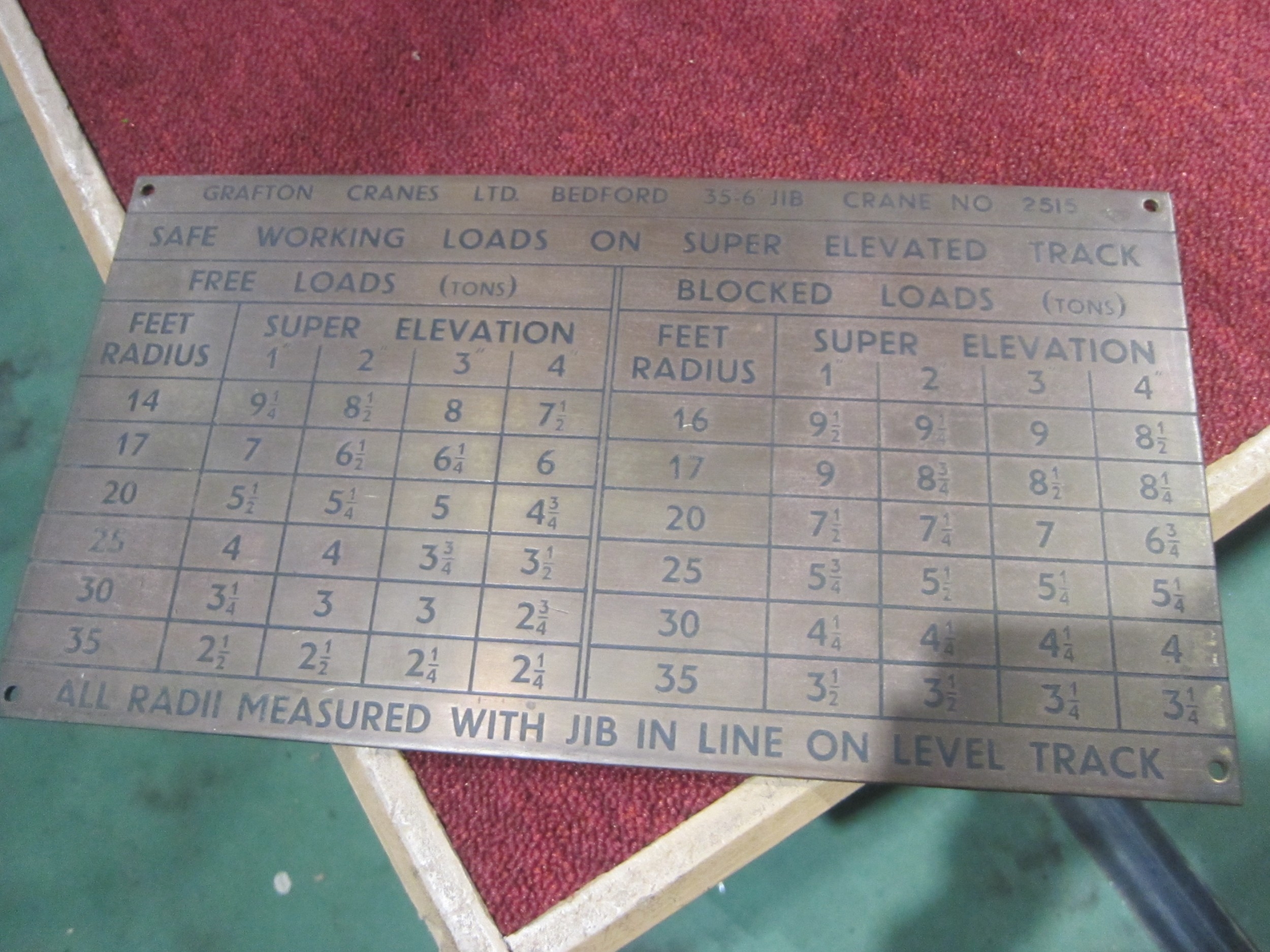 A brass Grafton Cranes Ltd, Bedford load chart showing free and blocked loads in tons, 35cm x 19cm