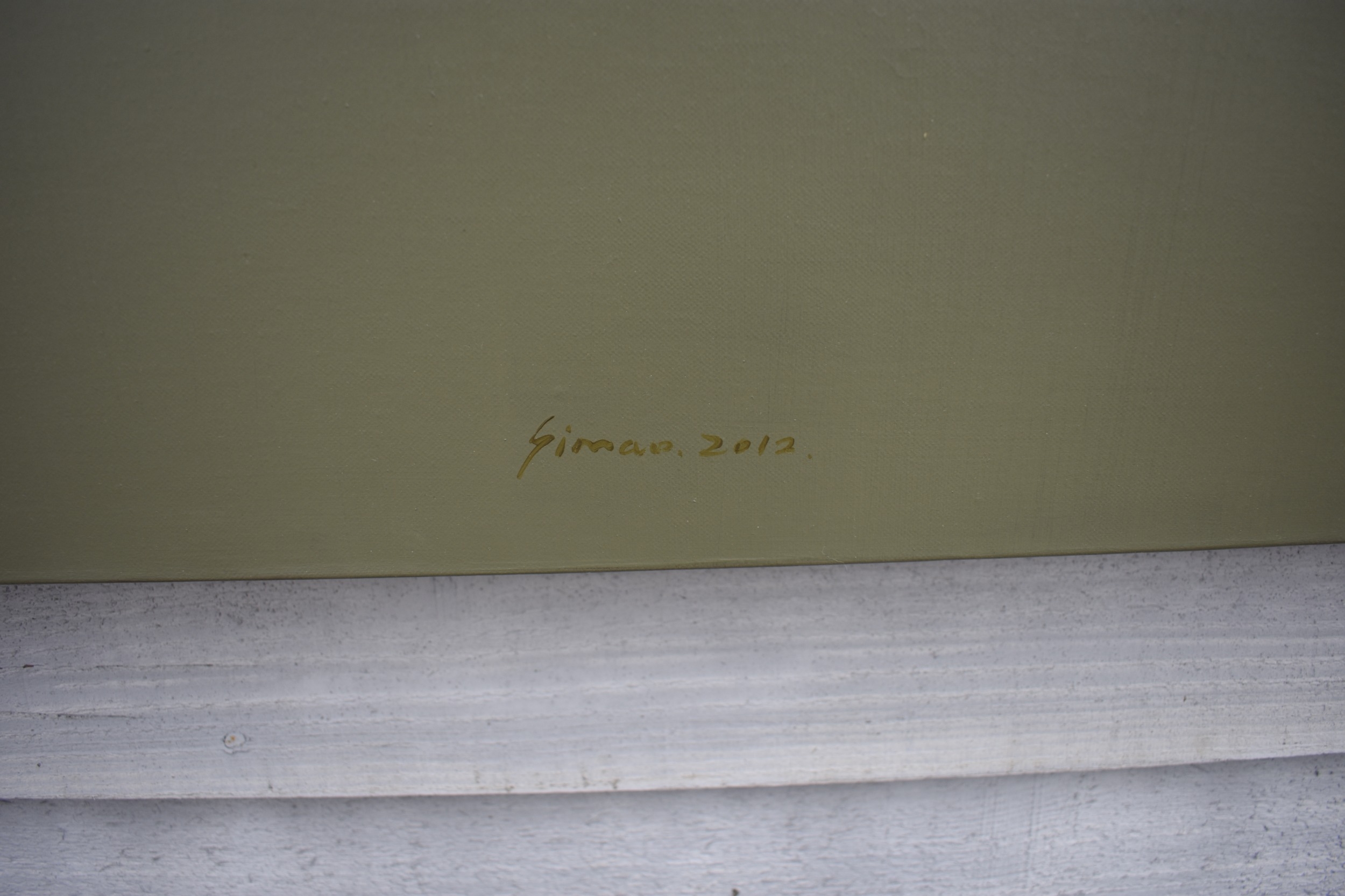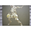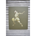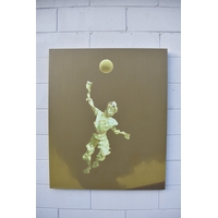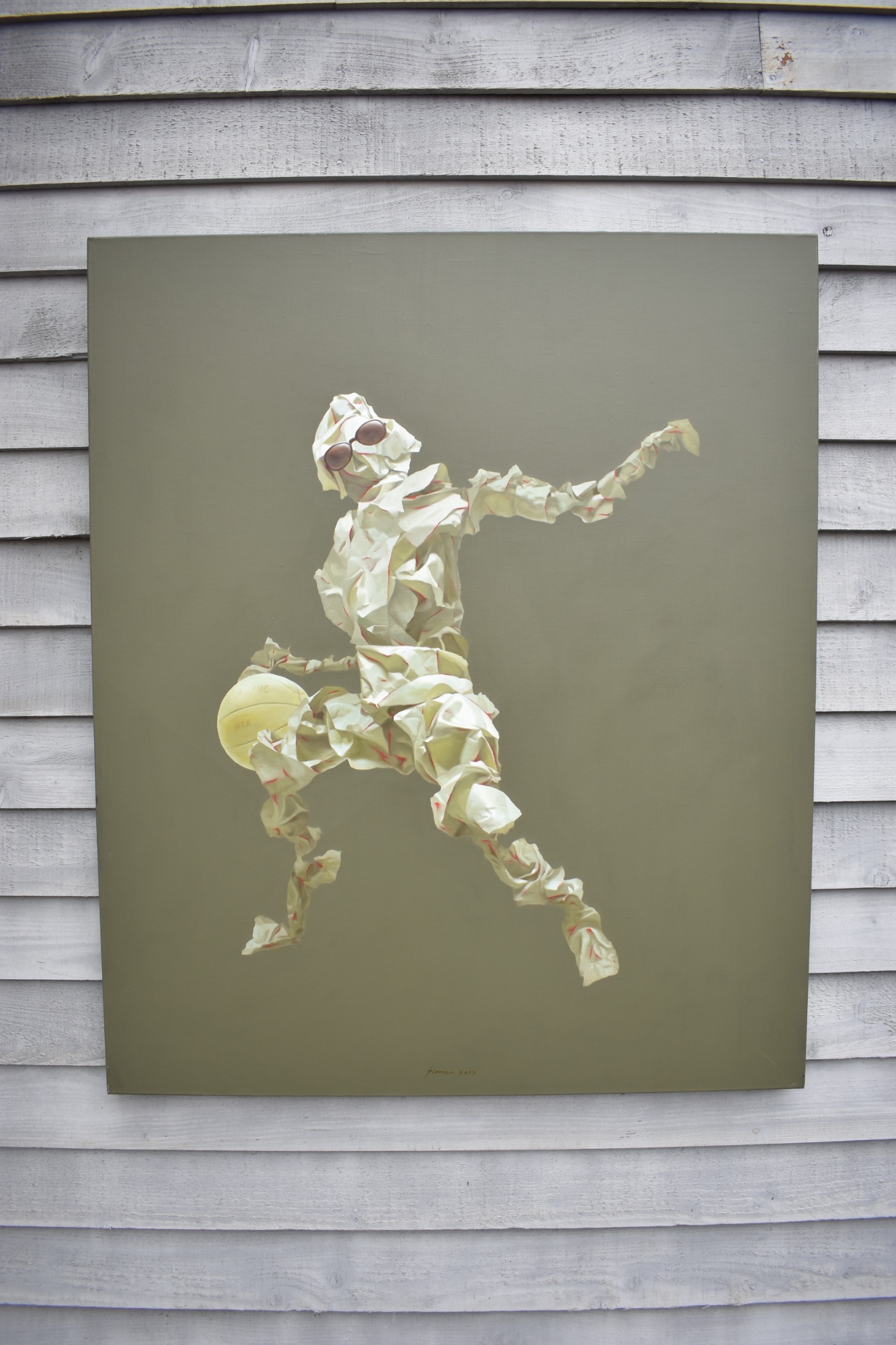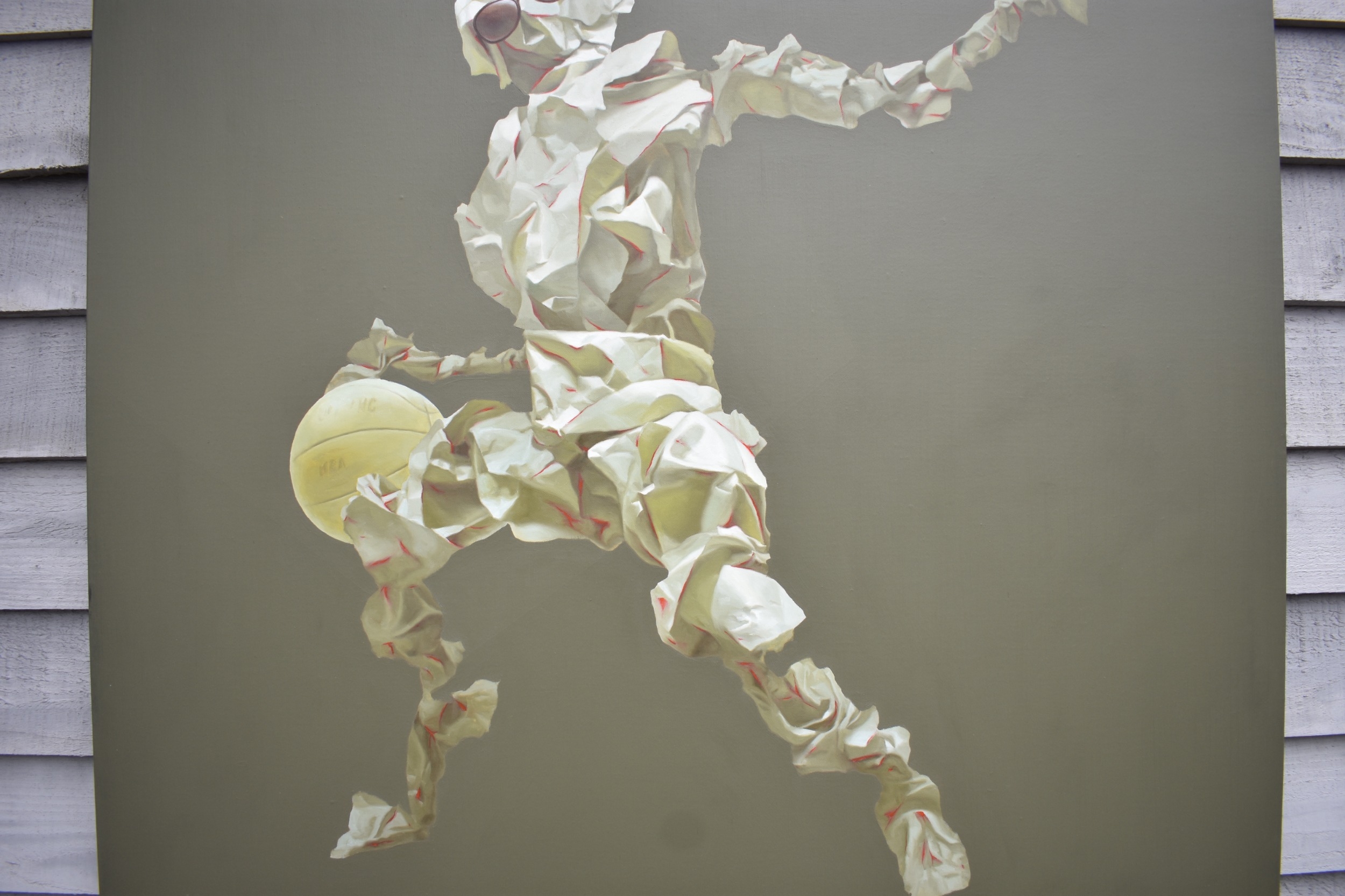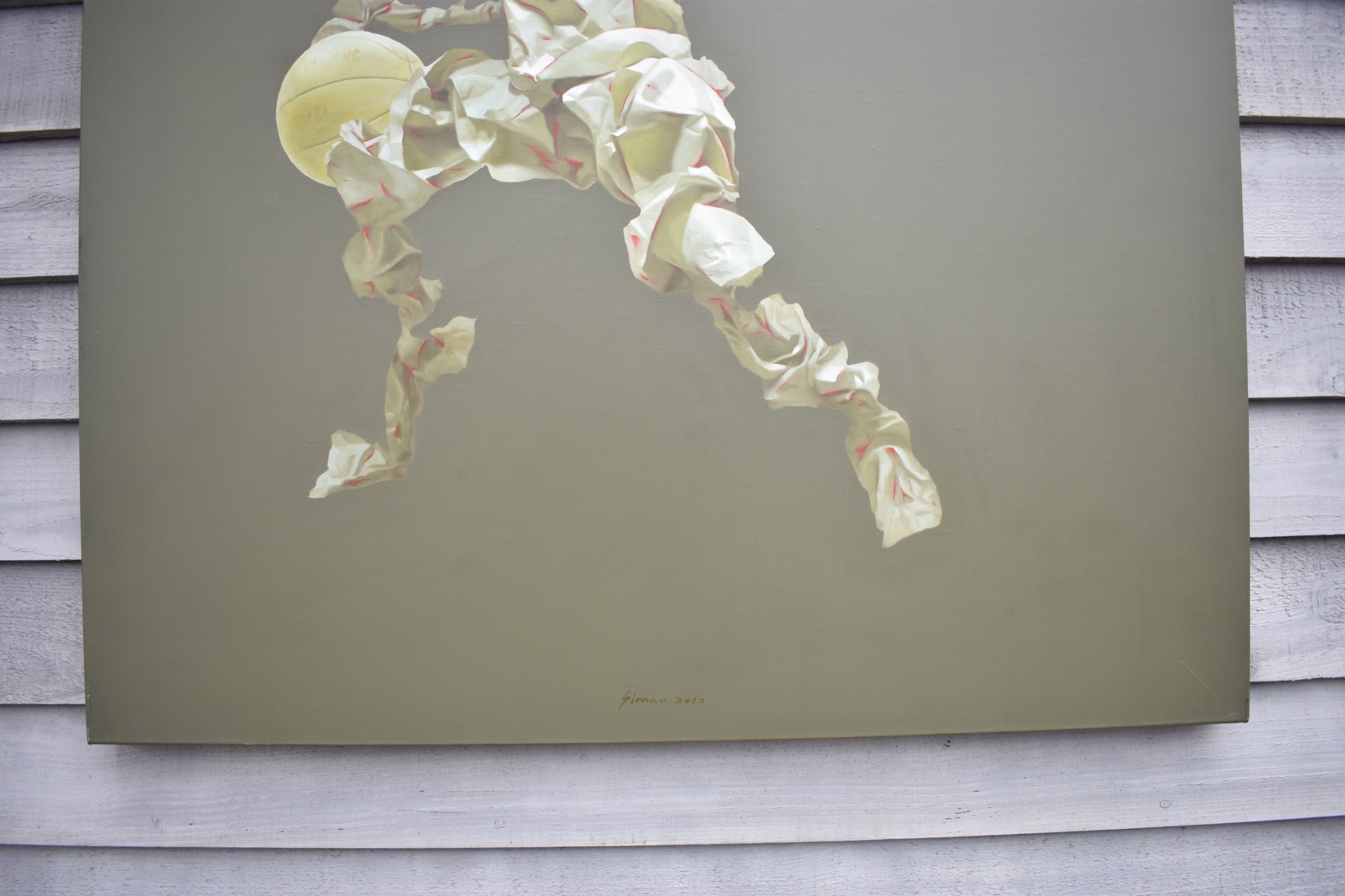 HUANG SIMAO (b.1967) Jingdezhen (China) Contemporary Artist: Oil painting from the "Edge of Reason" series. The image uses paper as its subject matter in the form of a figure wearing sunglasses bouncing a basket ball, dated 2012. (It represents the fragility of life both psychologically and physically). 120cm tall x 100.5cm