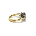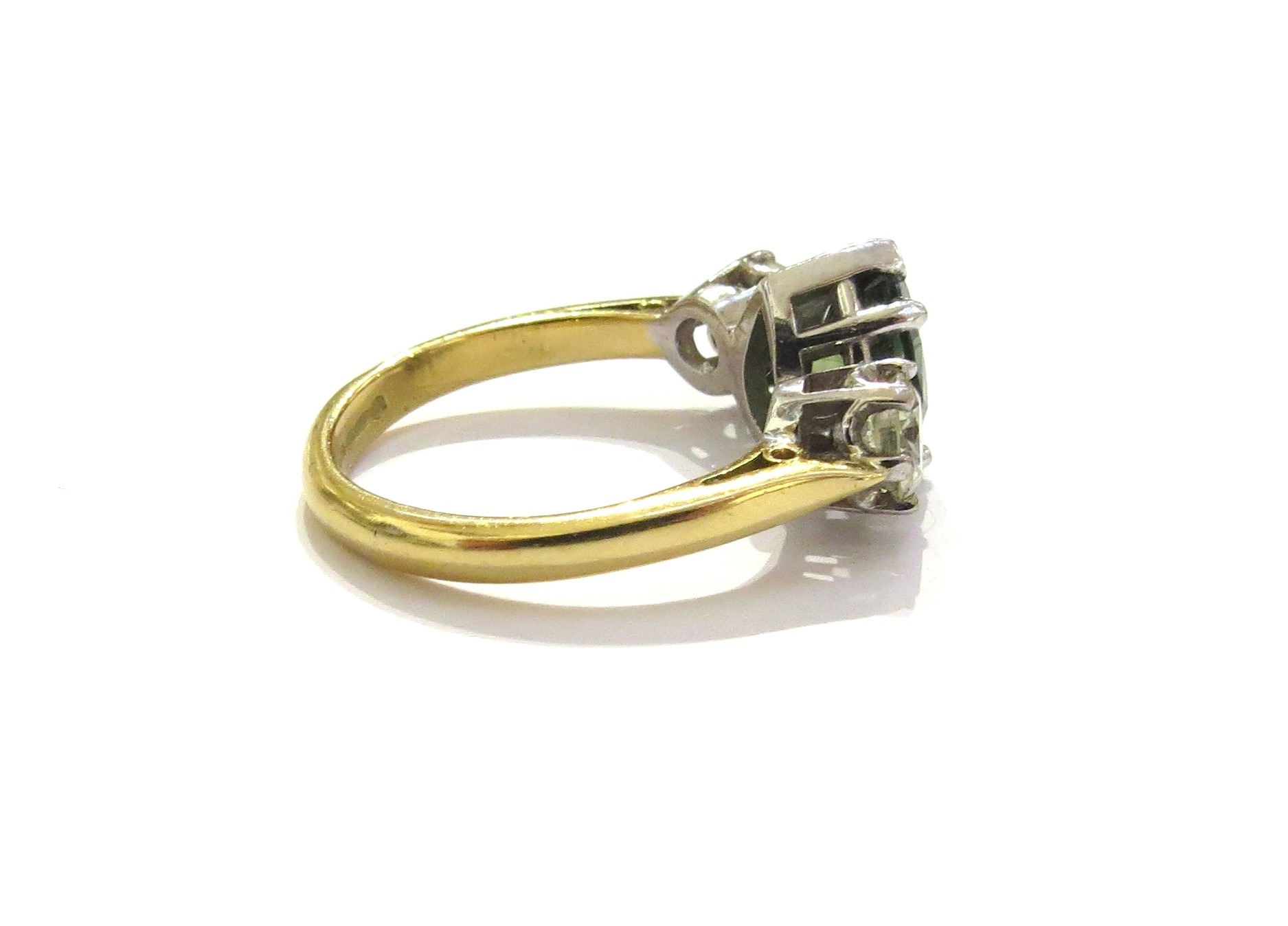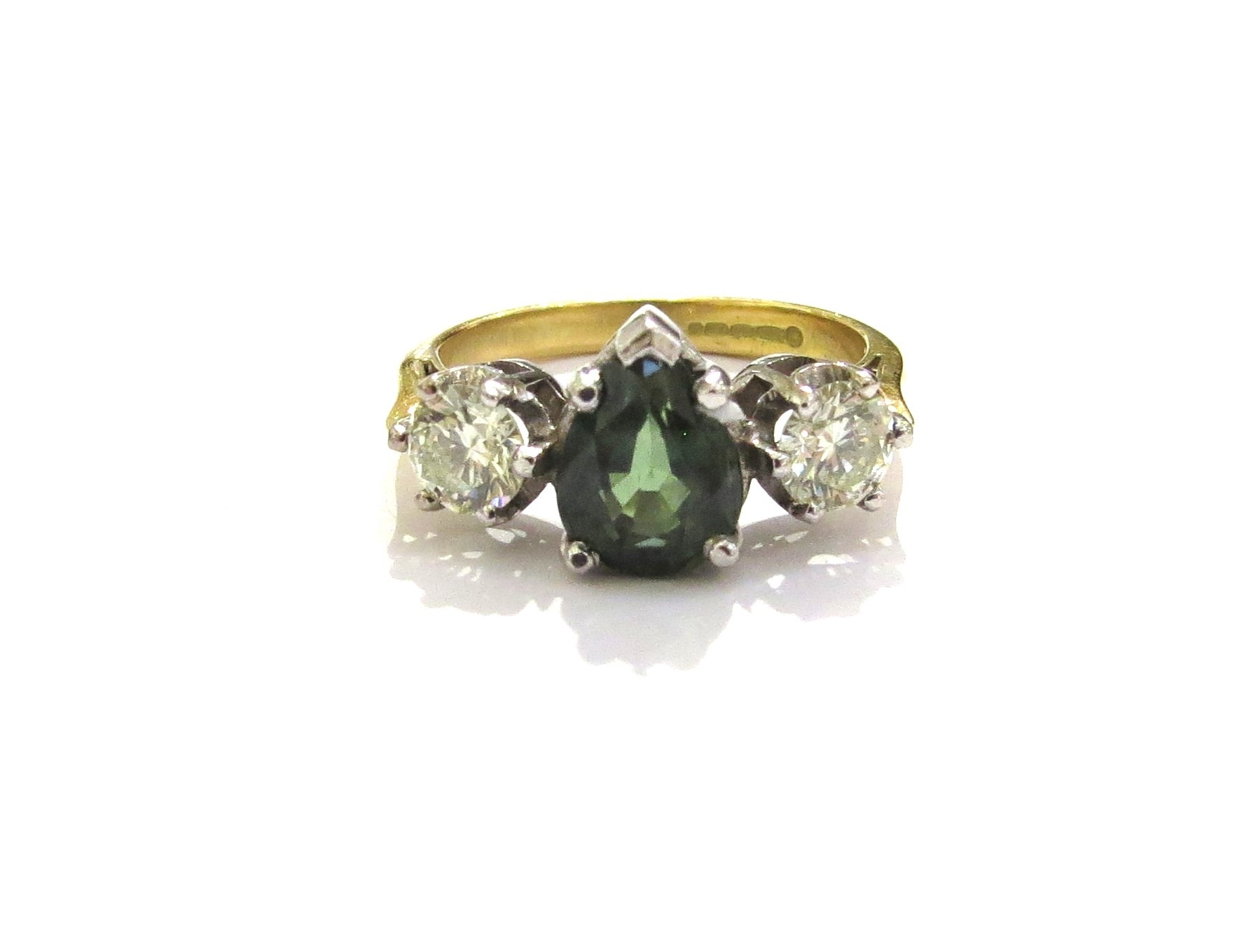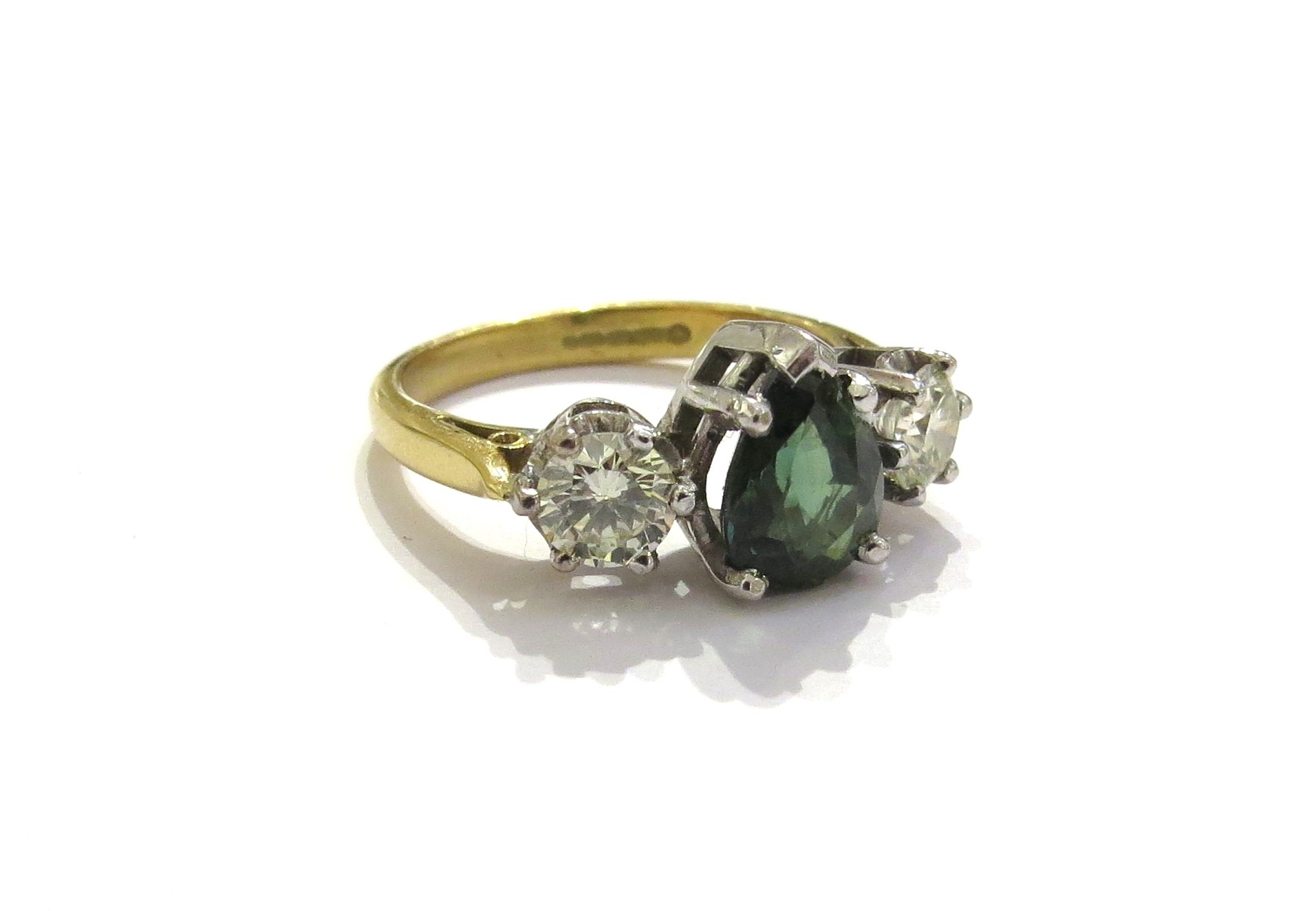 An 18ct gold ring with a pear cut teal sapphire flanked by diamonds 0.50ct each approx. Size N, 5.2g