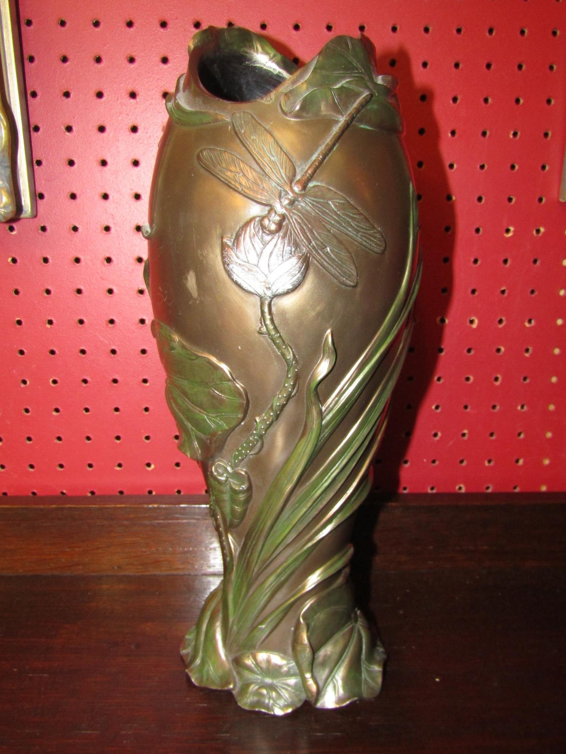A Veronese bronze effect Art Nouveau style Dragonfly design vase, 32cm tall
