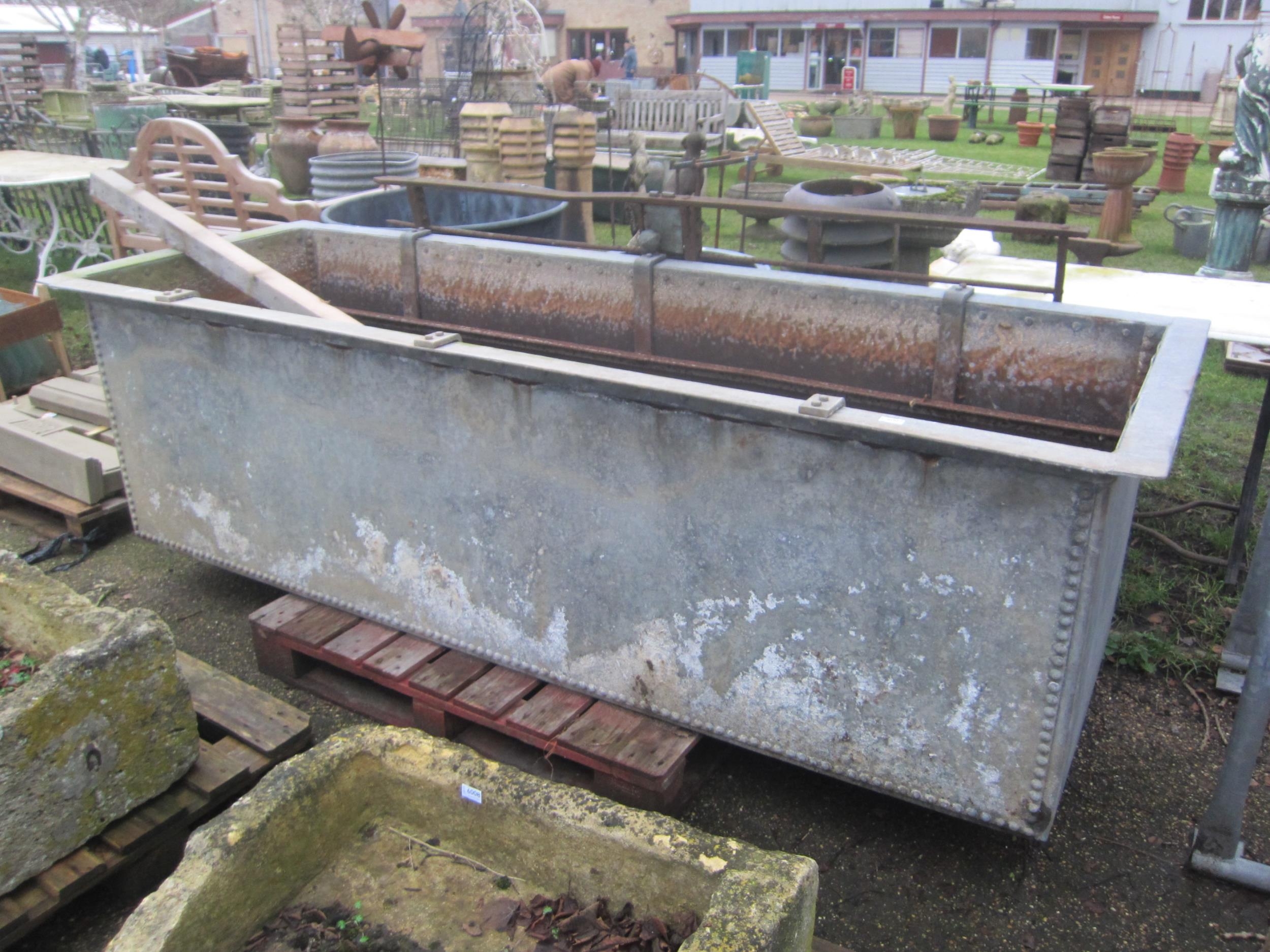 A large riveted galvanised water tank with flat rim, 95cm x 269cm x 78cm