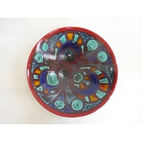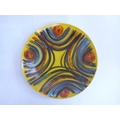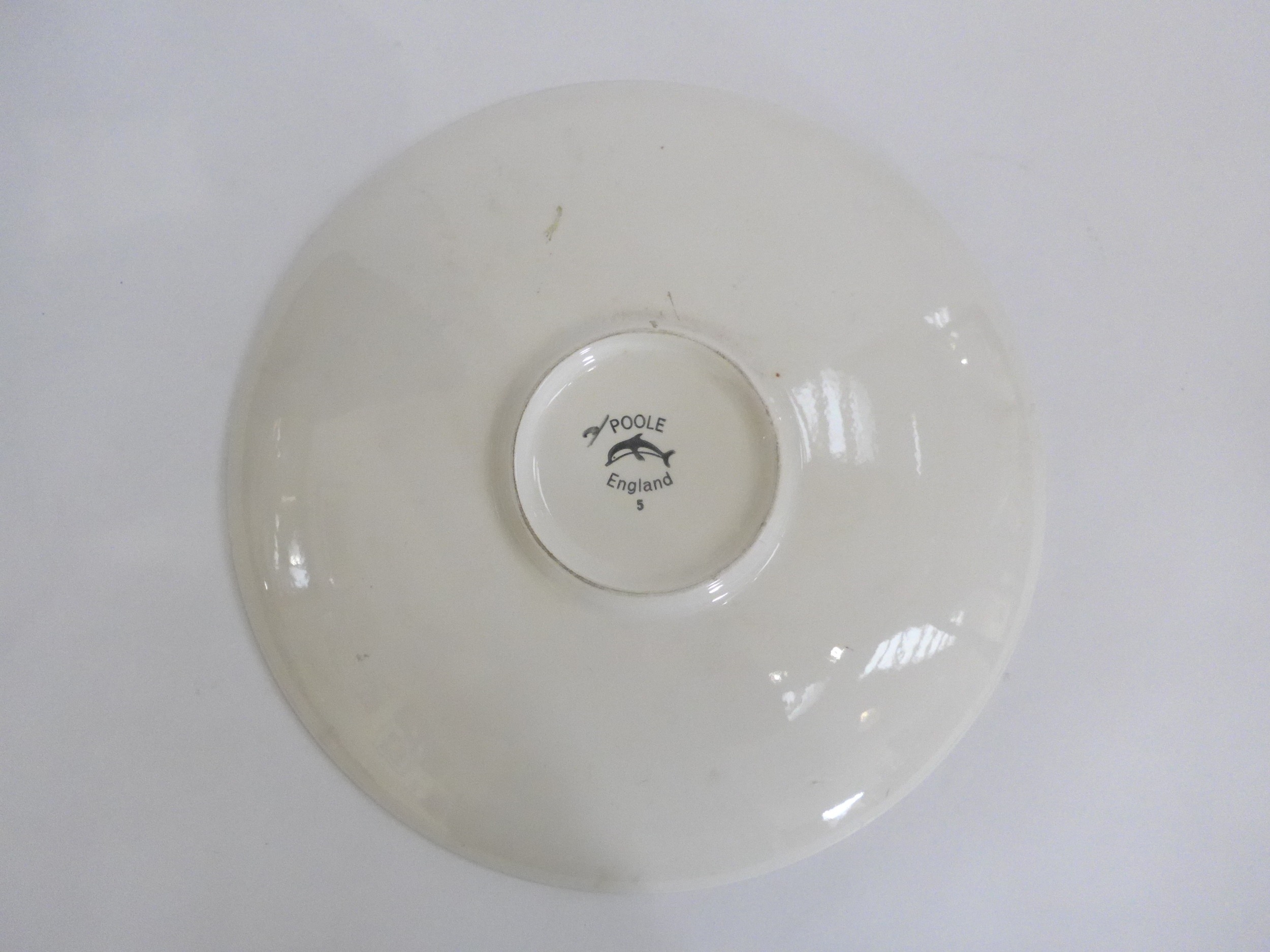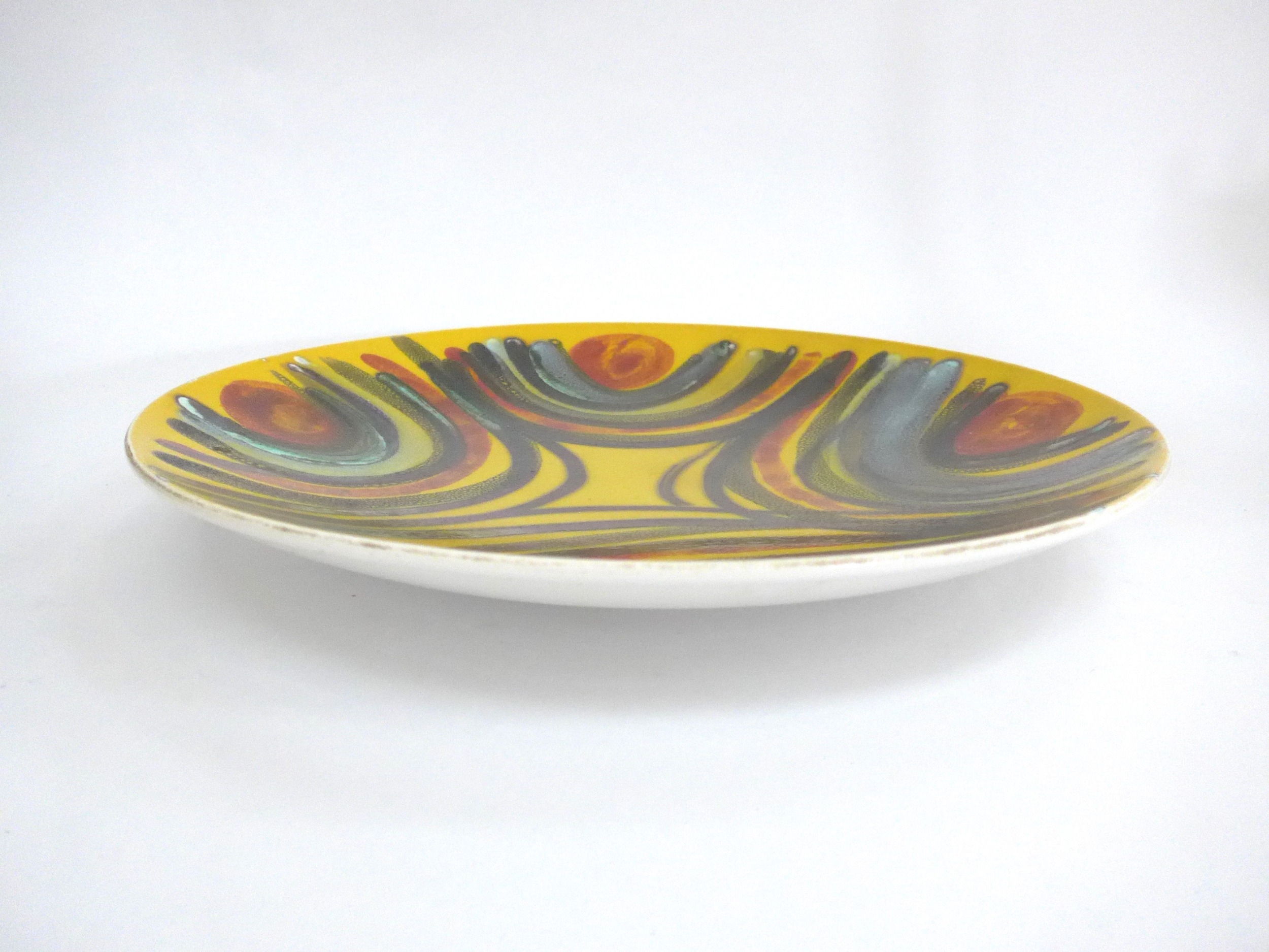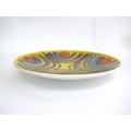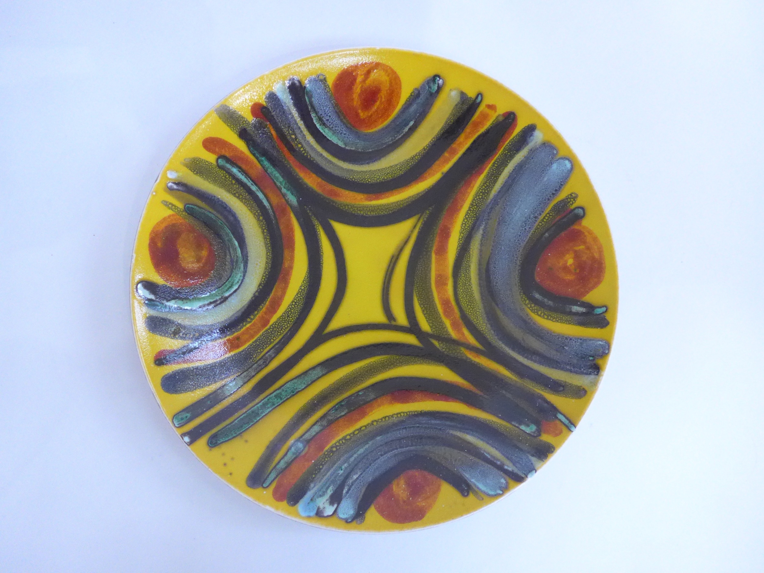 A large Poole Pottery Delphis range shallow dish, shape 5, yellow, blue, red and black colours. Black backstamps. 36.5cm diameter