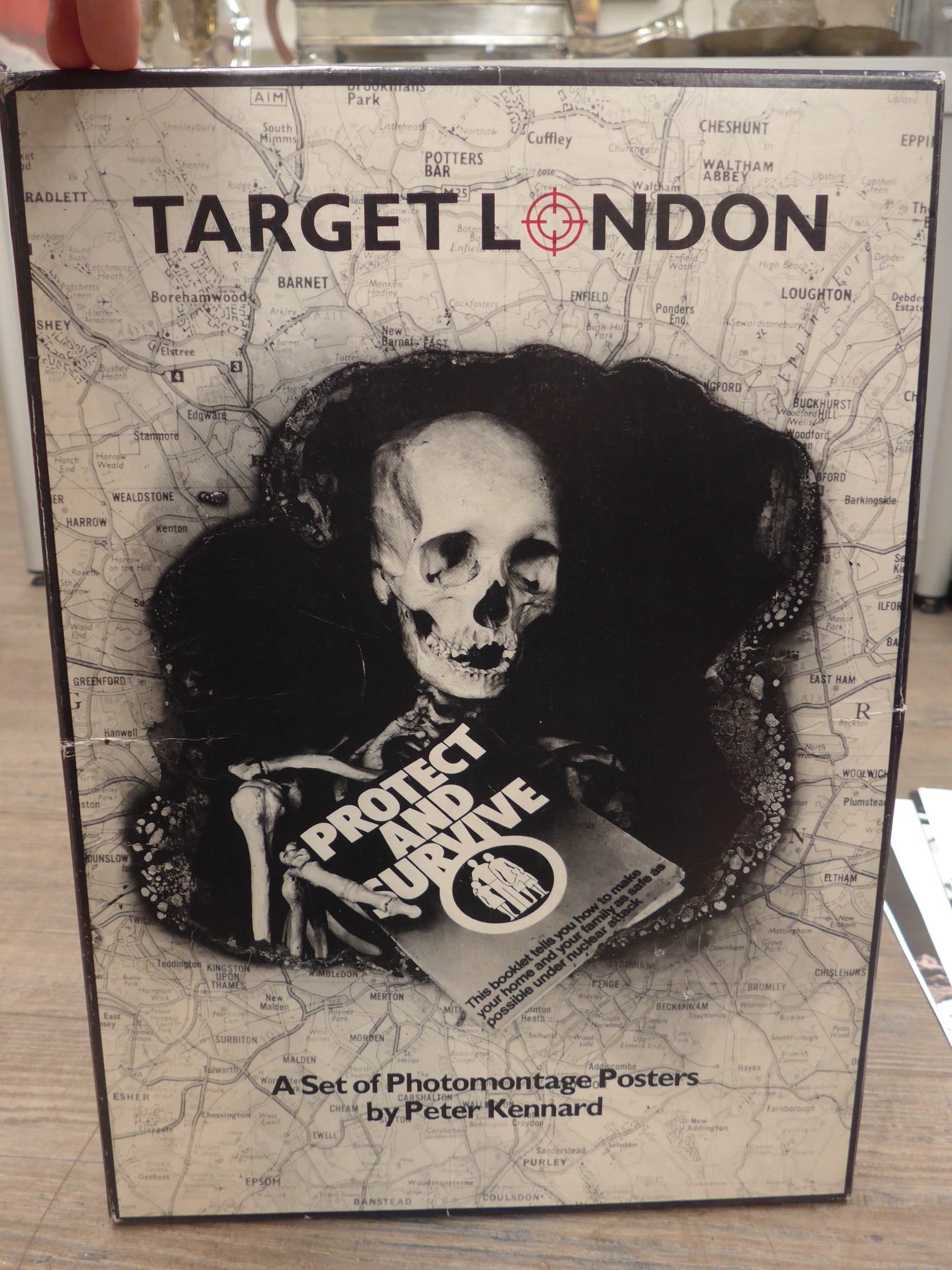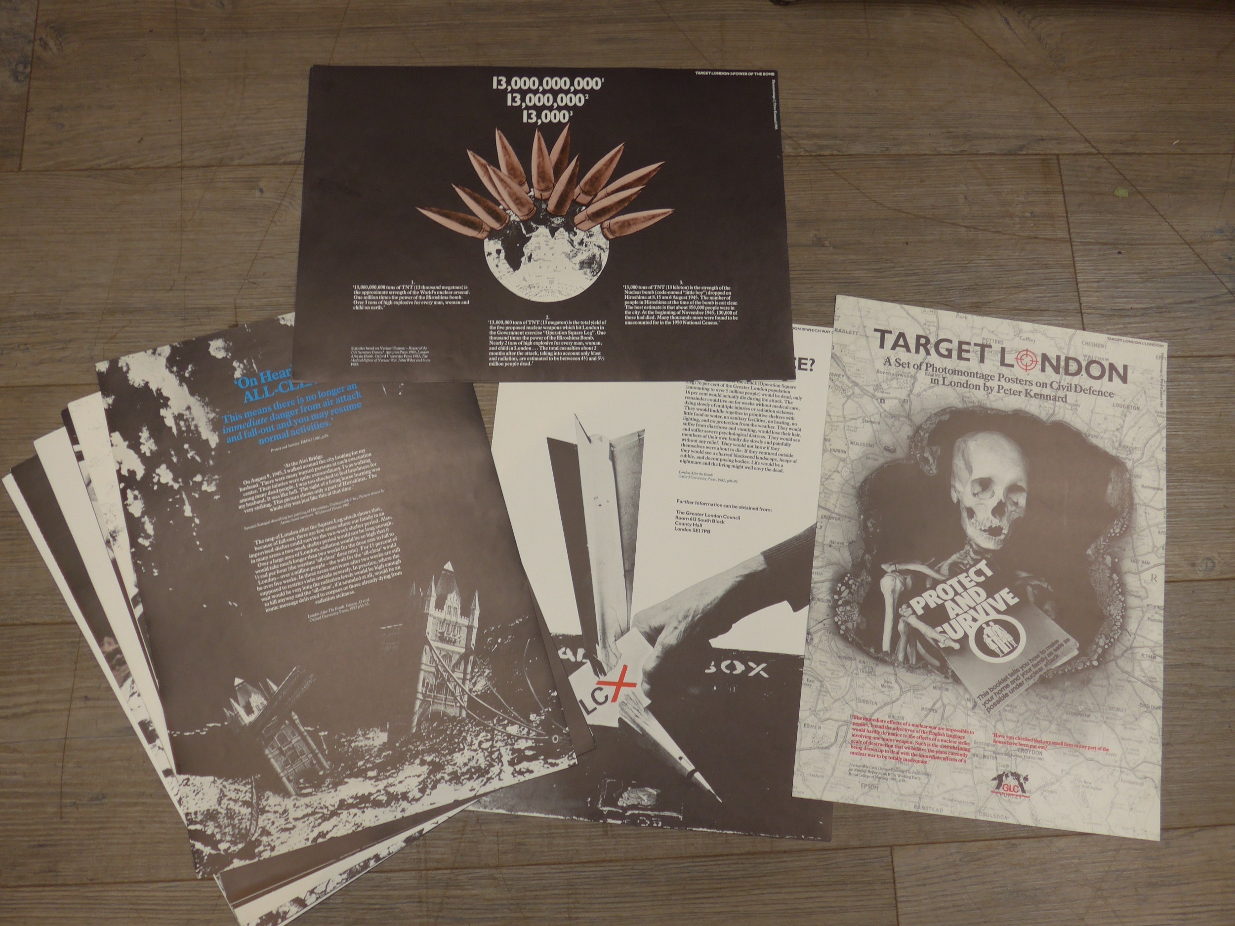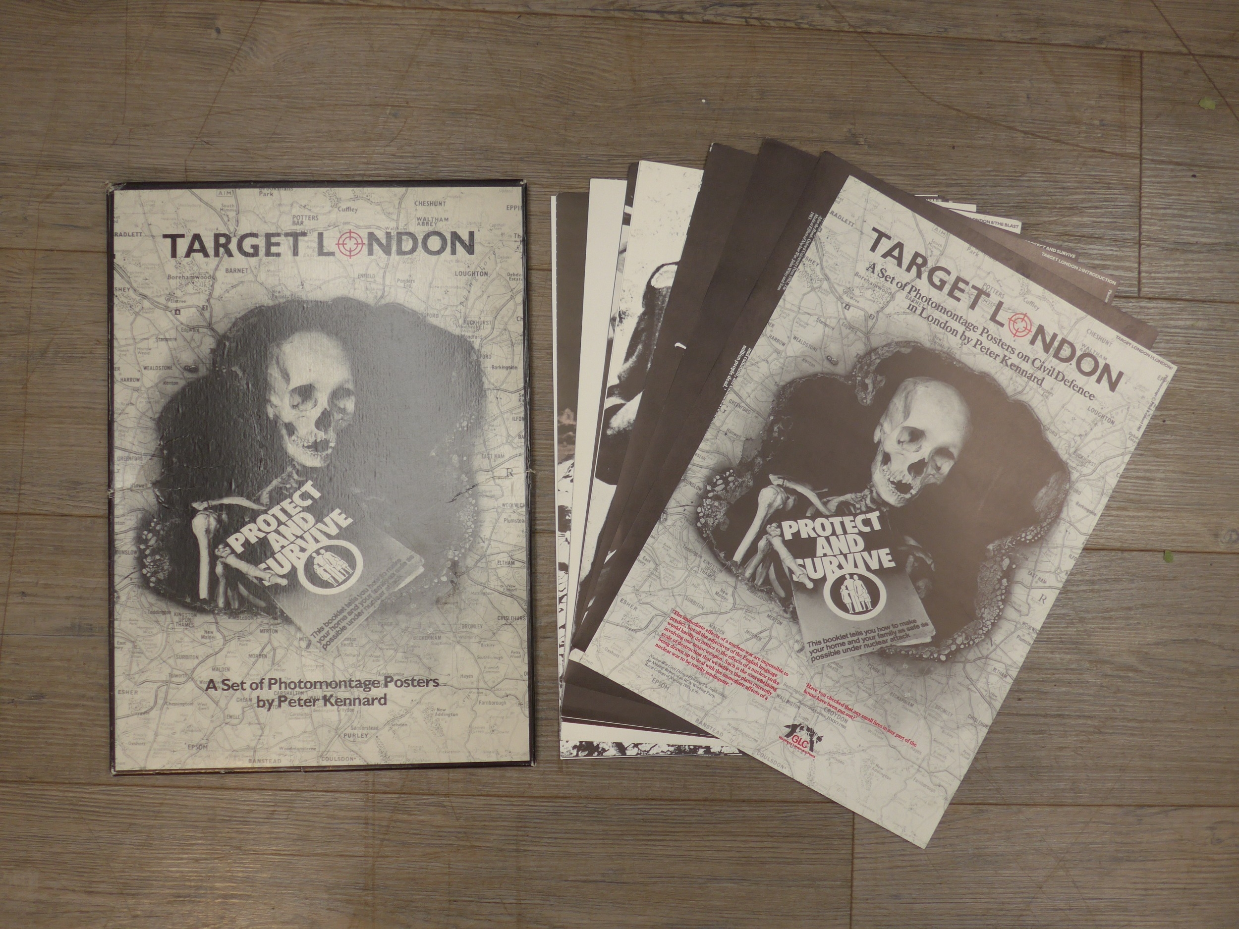 A Peter Kennard 'Target London' - A set of 18 photomontage posters on Civil Defence with card presentation box, first edition 1985 published for Greater London Council. Plus a 2003 'Face' exhibition Newspaper format catalogue, Gimpel Fils Gallery.