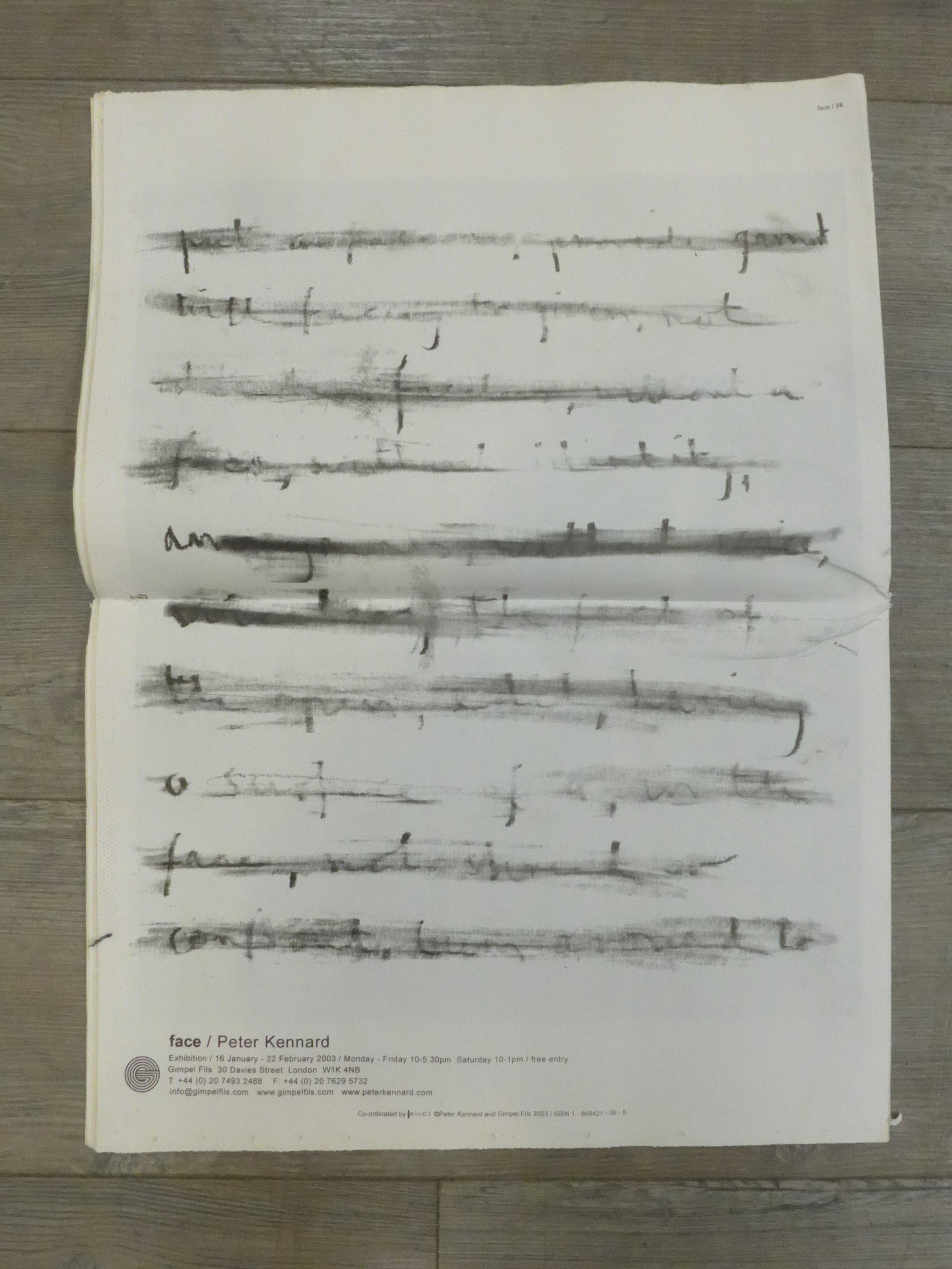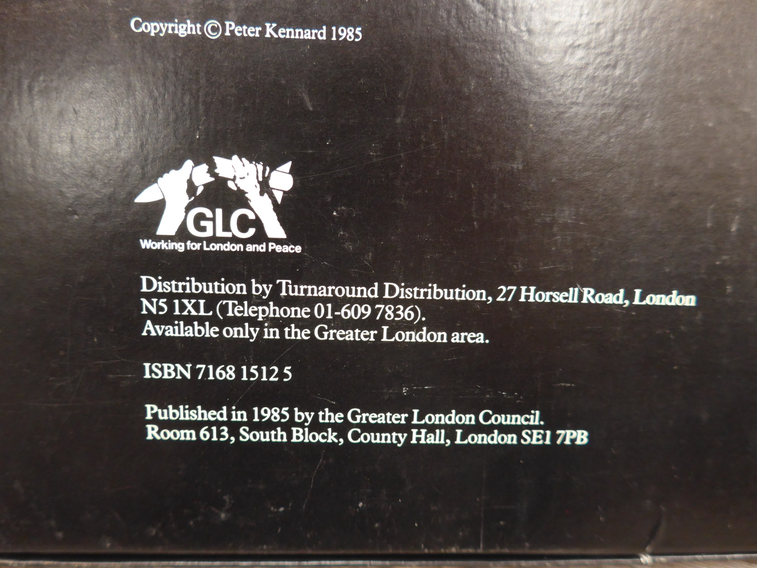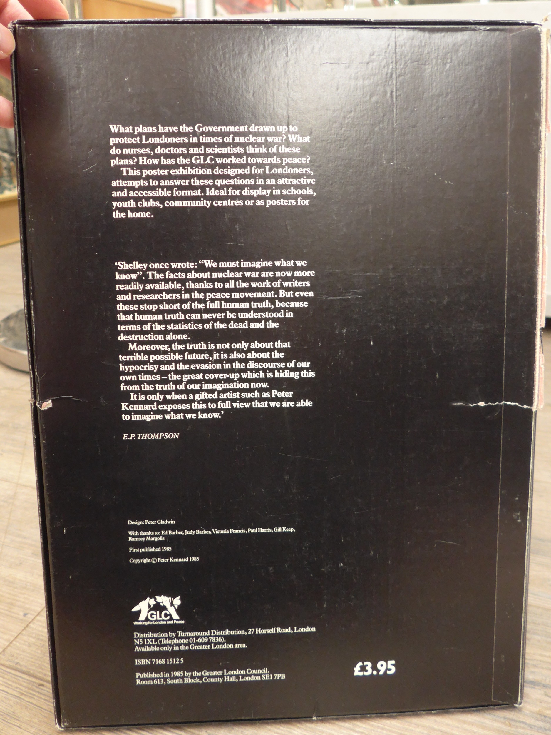 A Peter Kennard 'Target London' - A set of 18 photomontage posters on Civil Defence with card presentation box, first edition 1985 published for Greater London Council. Plus a 2003 'Face' exhibition Newspaper format catalogue, Gimpel Fils Gallery.