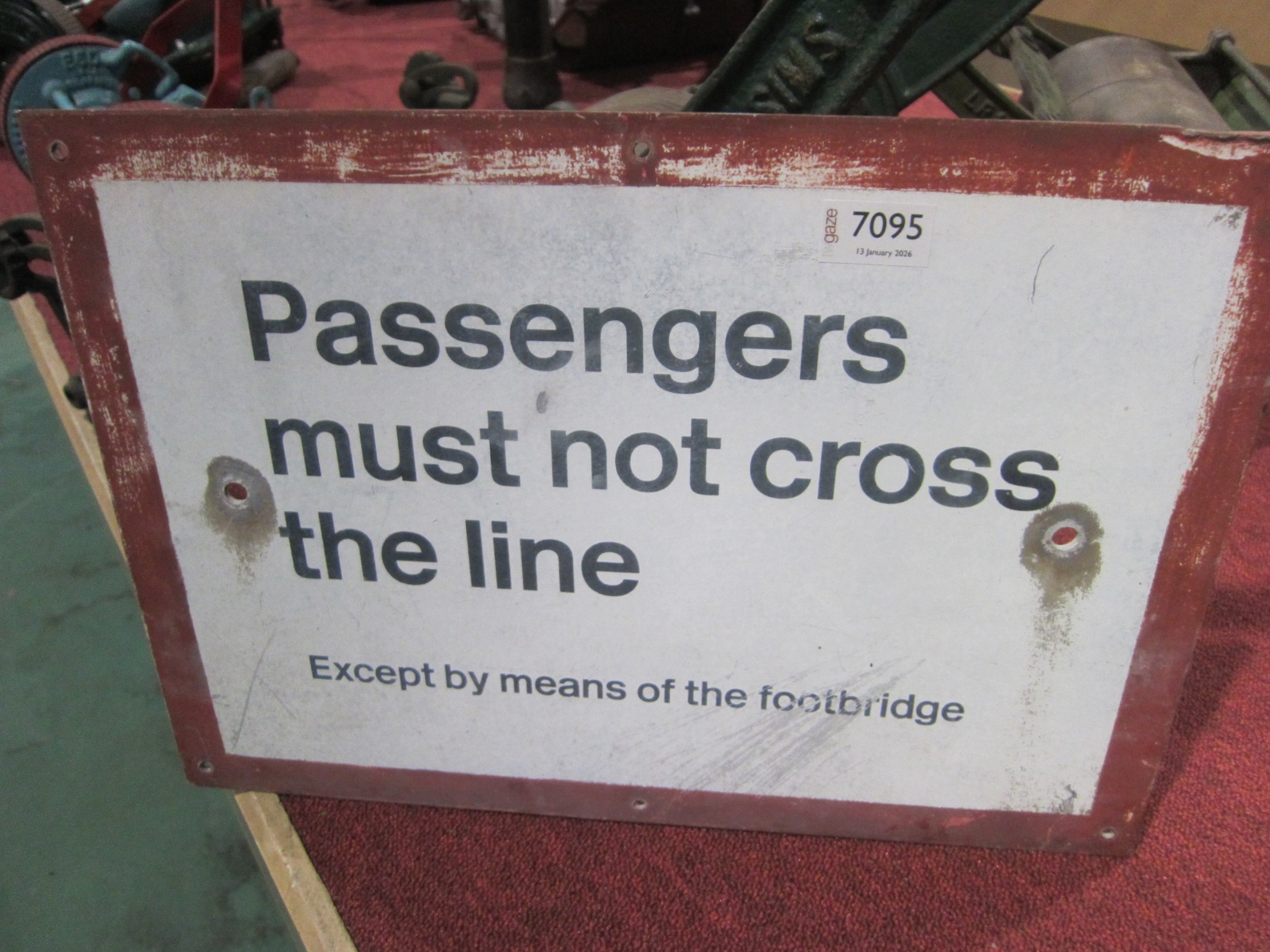 An aluminium sign - Passengers must not cross the line, 46cm x 33cm