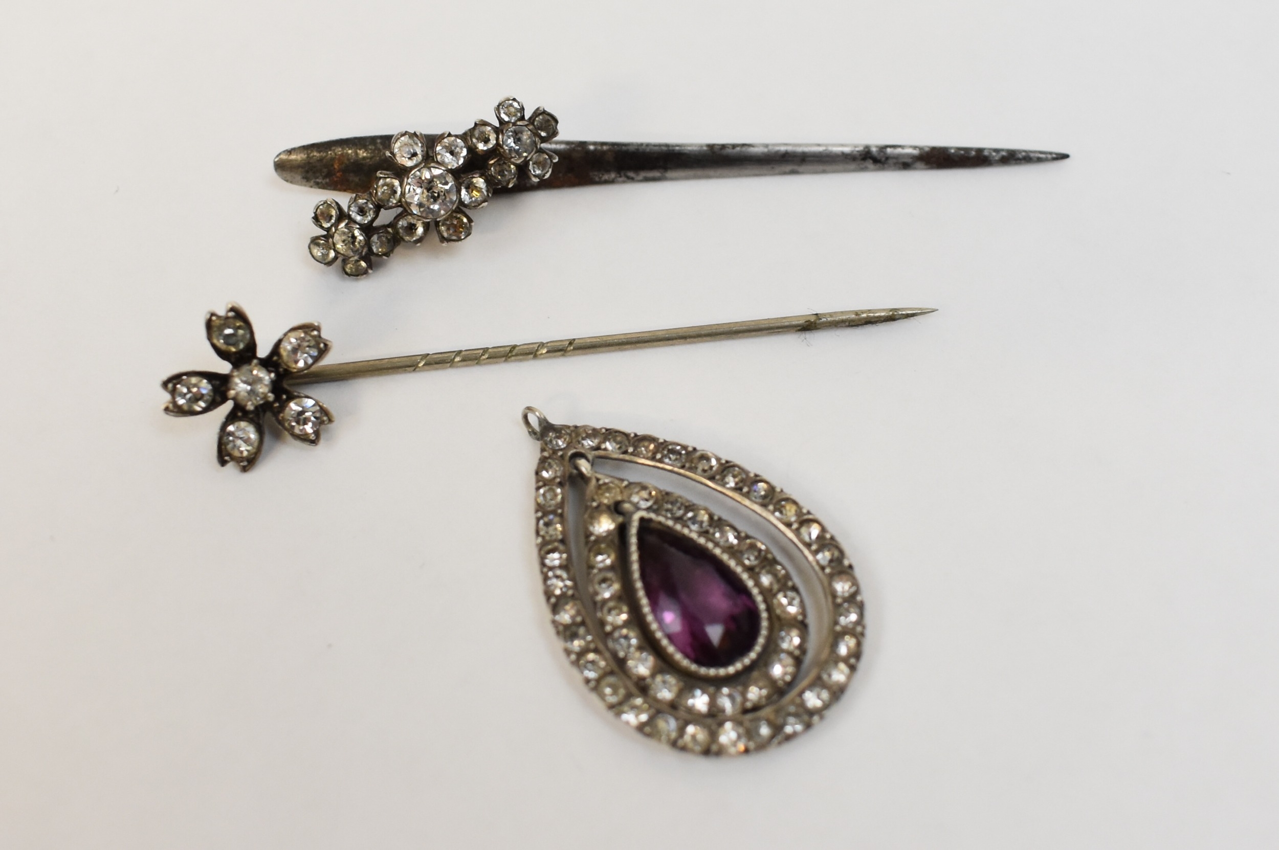 Two floral stick pins and a pendant set with clear stones and central purple stone (3)
