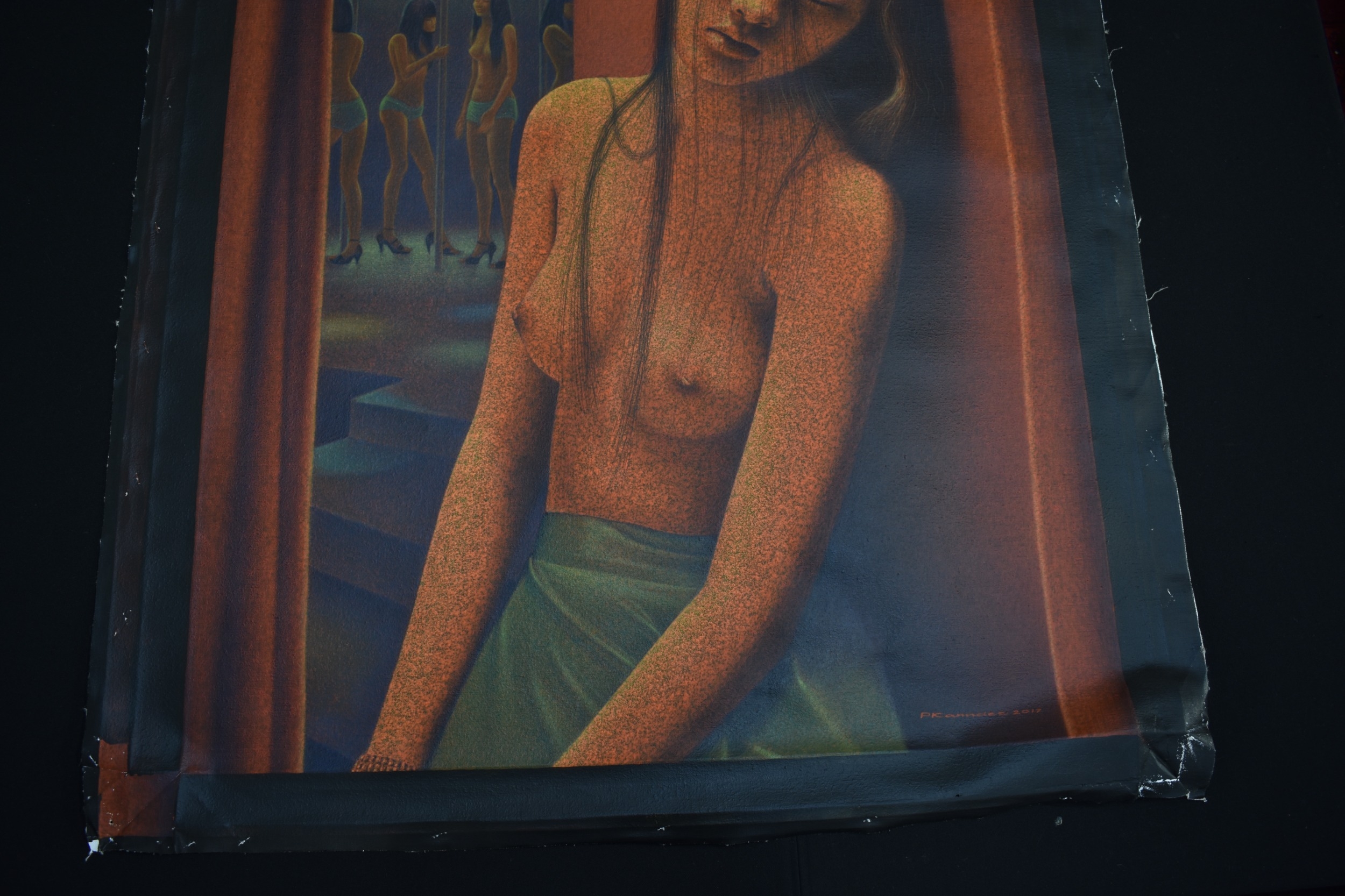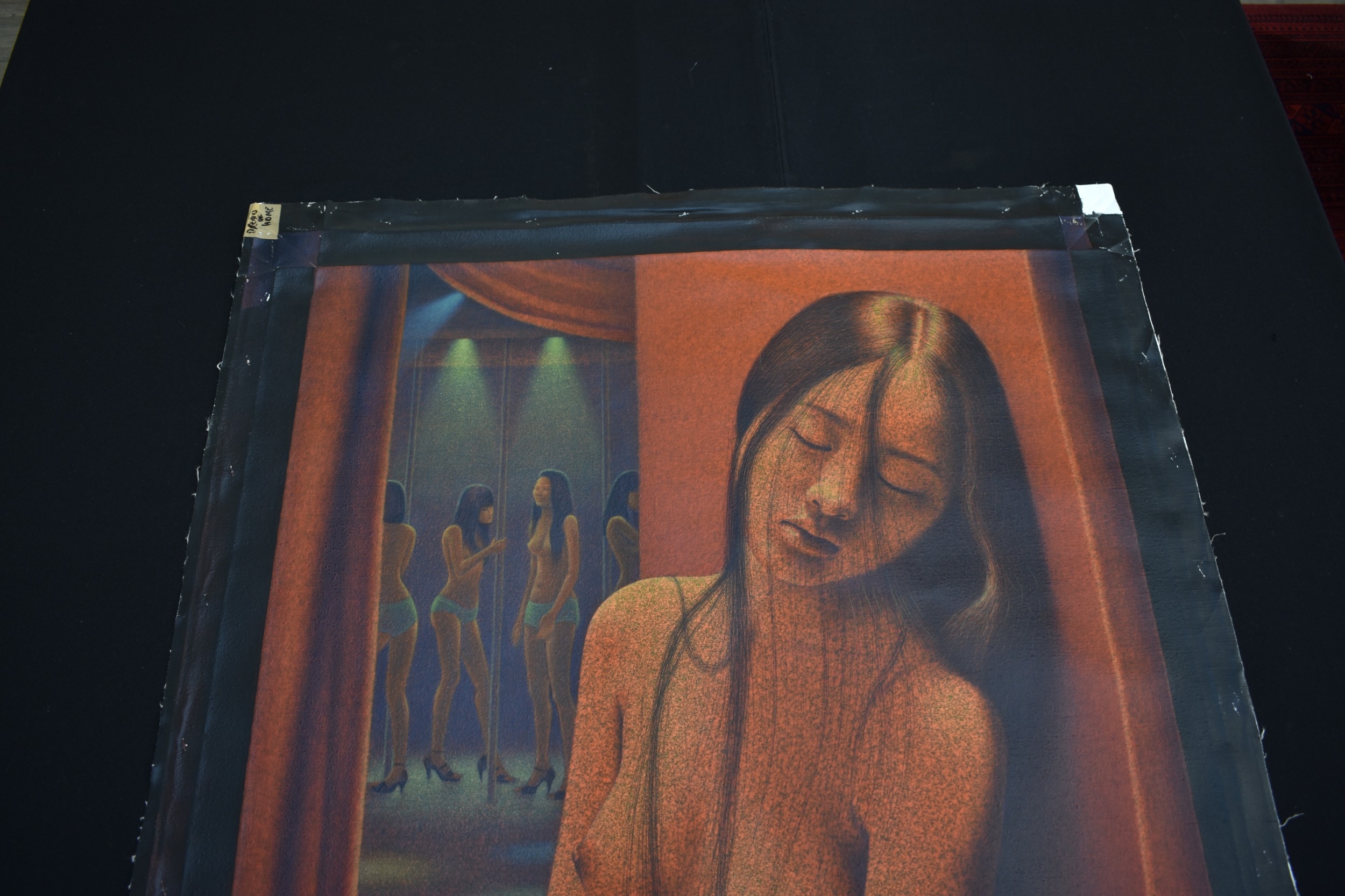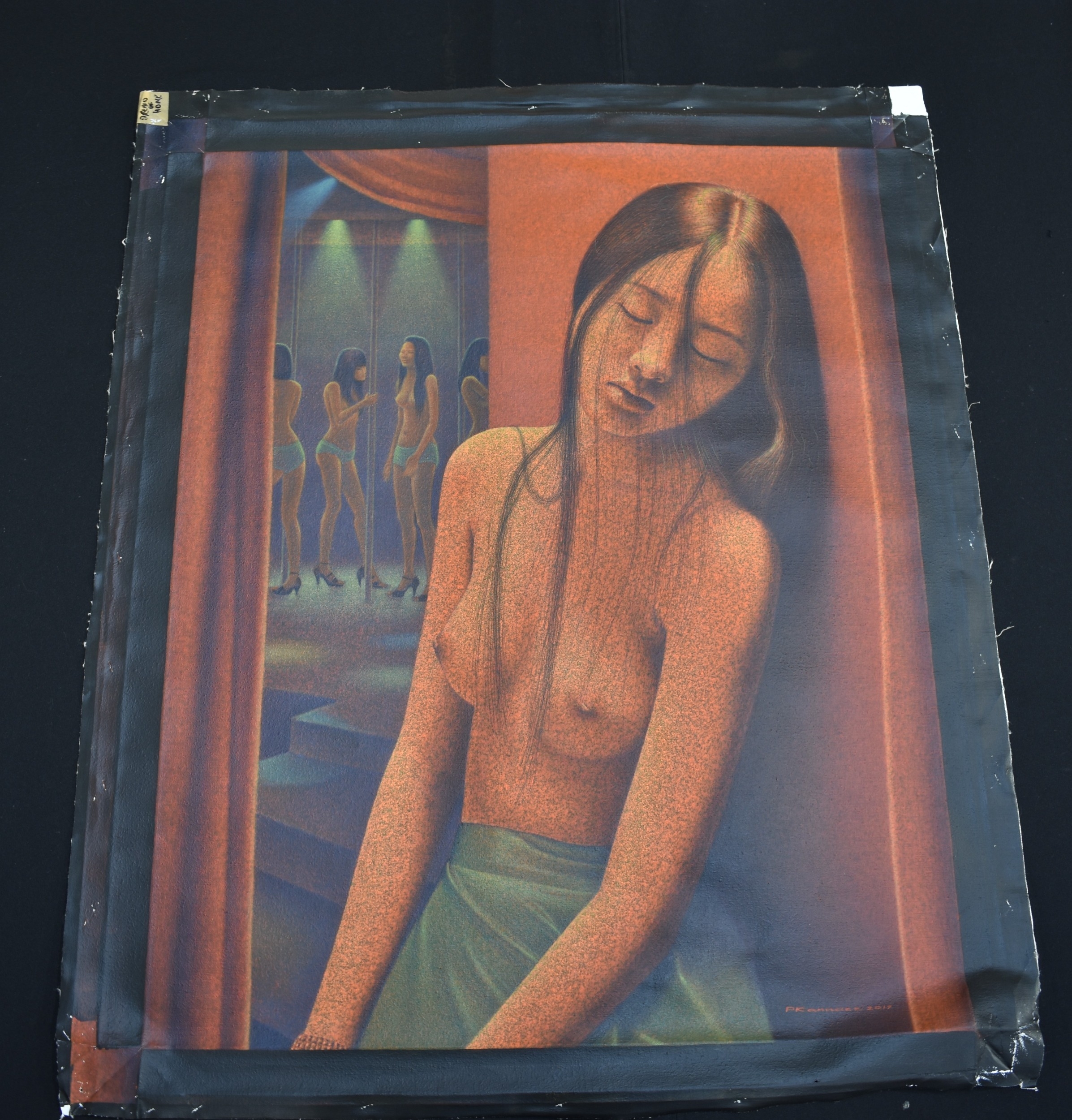 PAIROJ KARNDEE Thai Contemporary Artist: Female portrait, titled " Dream of home " 3/4 length image of female with dancing girls to back ground, acrylic on canvas. The artist has been influenced by the mysterious Apsaras - the celestial maidens of ancient Asian culture depicted in the galleries of Cambodia's Angkor Wat. His techniques painstakingly recreate the stone textures of those images with a time-consuming rendering of acrylic on linen canvas. His figures show a notable range of emotions. Signed and dated, 2017, image size 100cm x 79cm