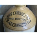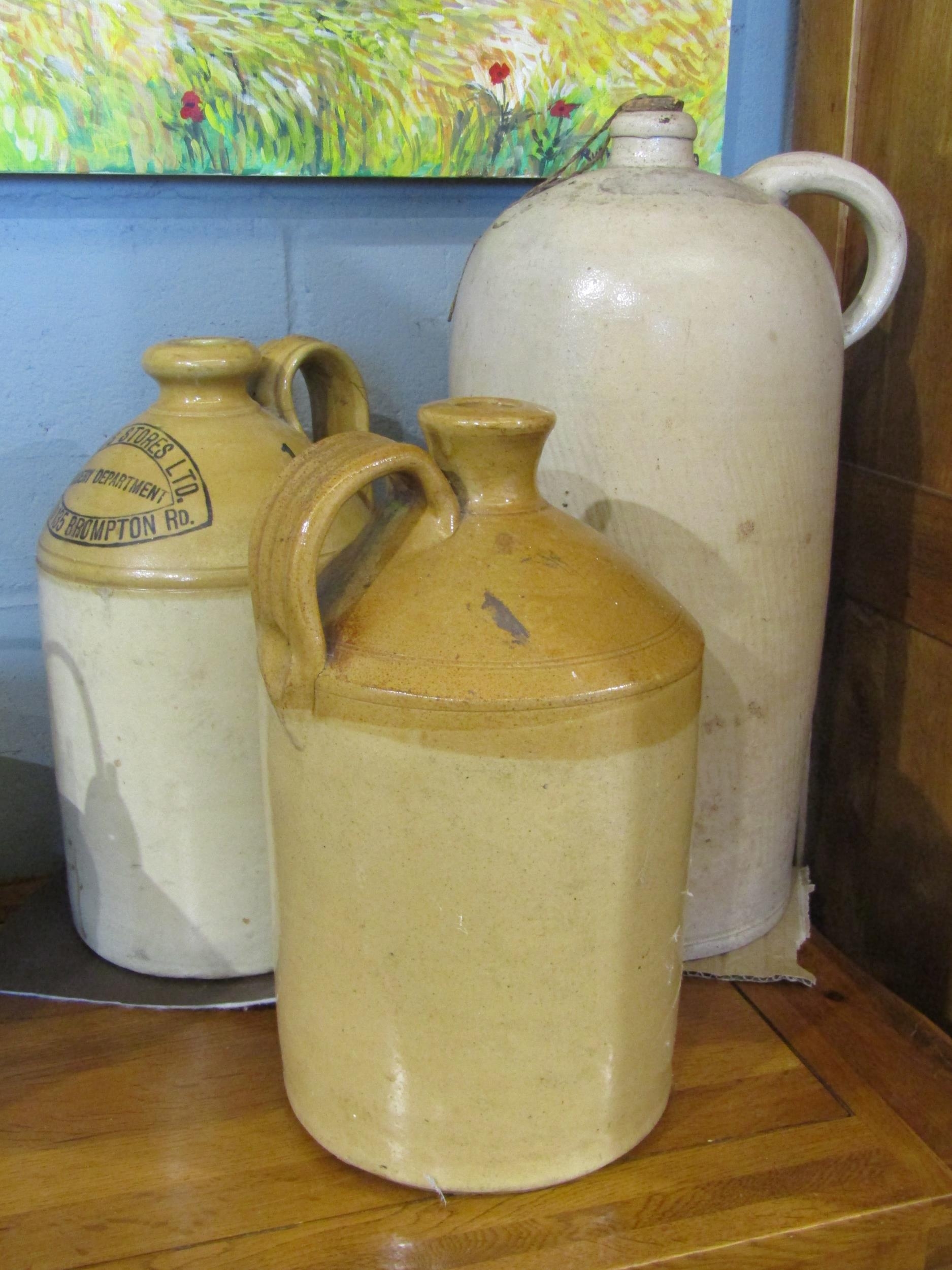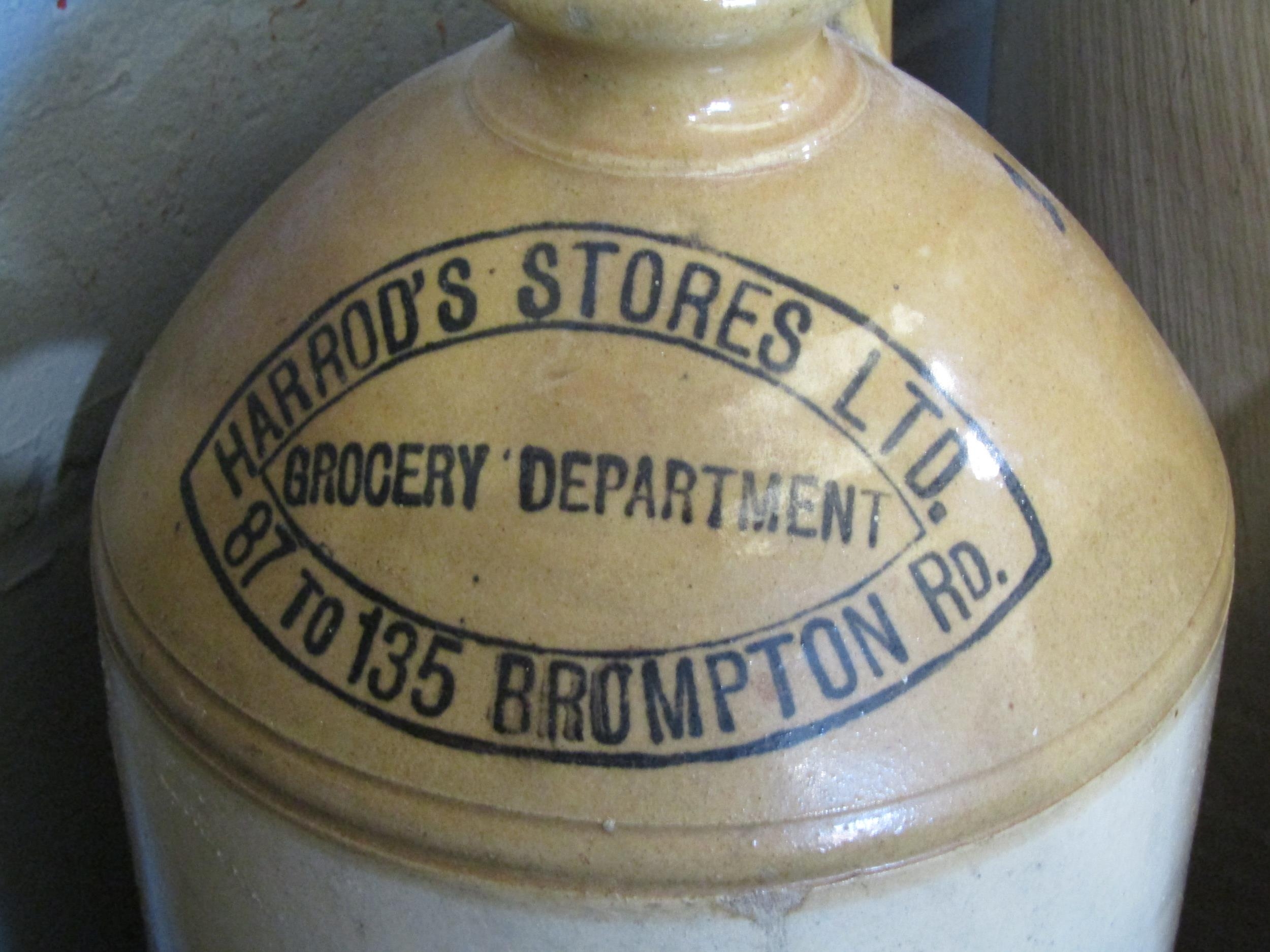 A Stoneware "Harrod's Stores Ltd", grocery department 87-135 Brompton Road flagon, a similar flagon and a flagon marked "10 Kan" (3)