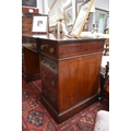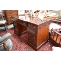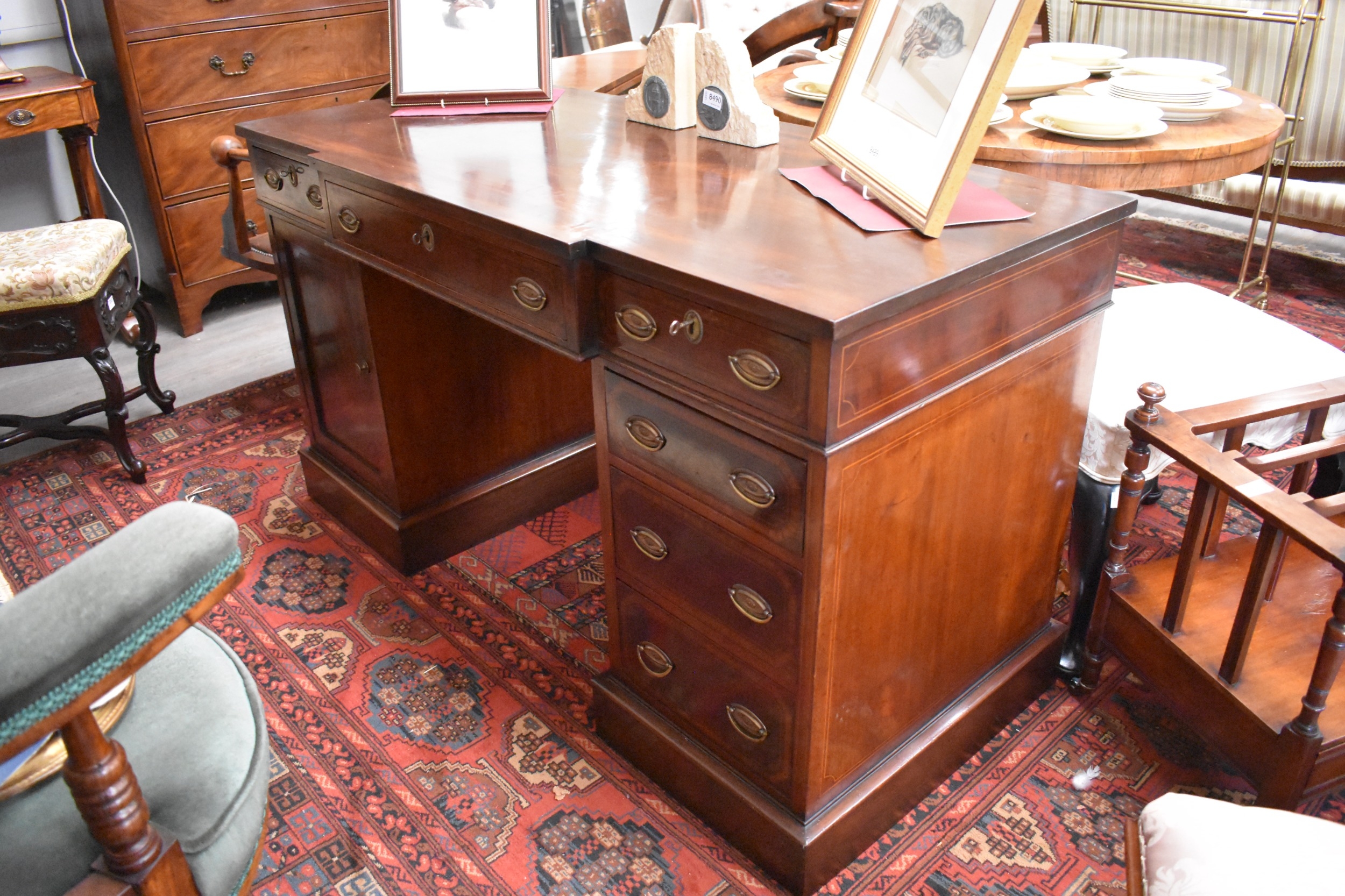 An Edwardian line inlaid mahogany breakfront twin pedestal desk, with three frieze drawers (each with a key) one over a single door cupboard, the other over a three drawer pedestal, 136 wide x 64cm deep x 77cm tall