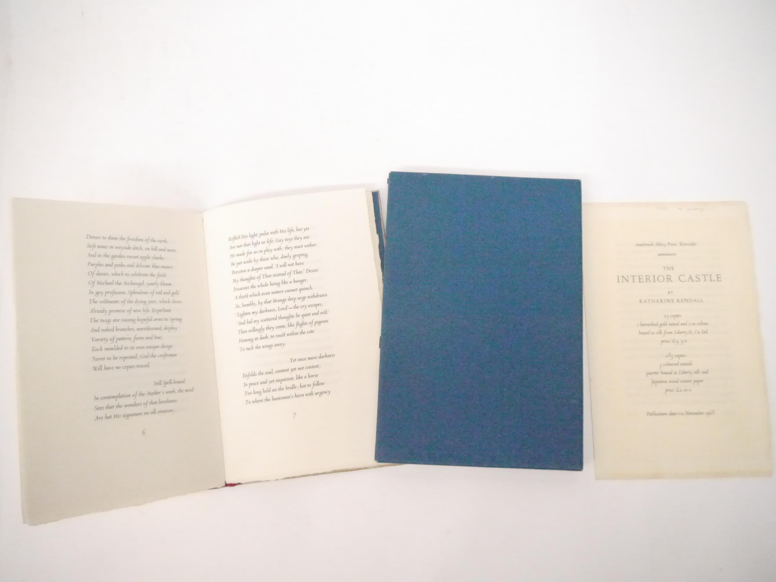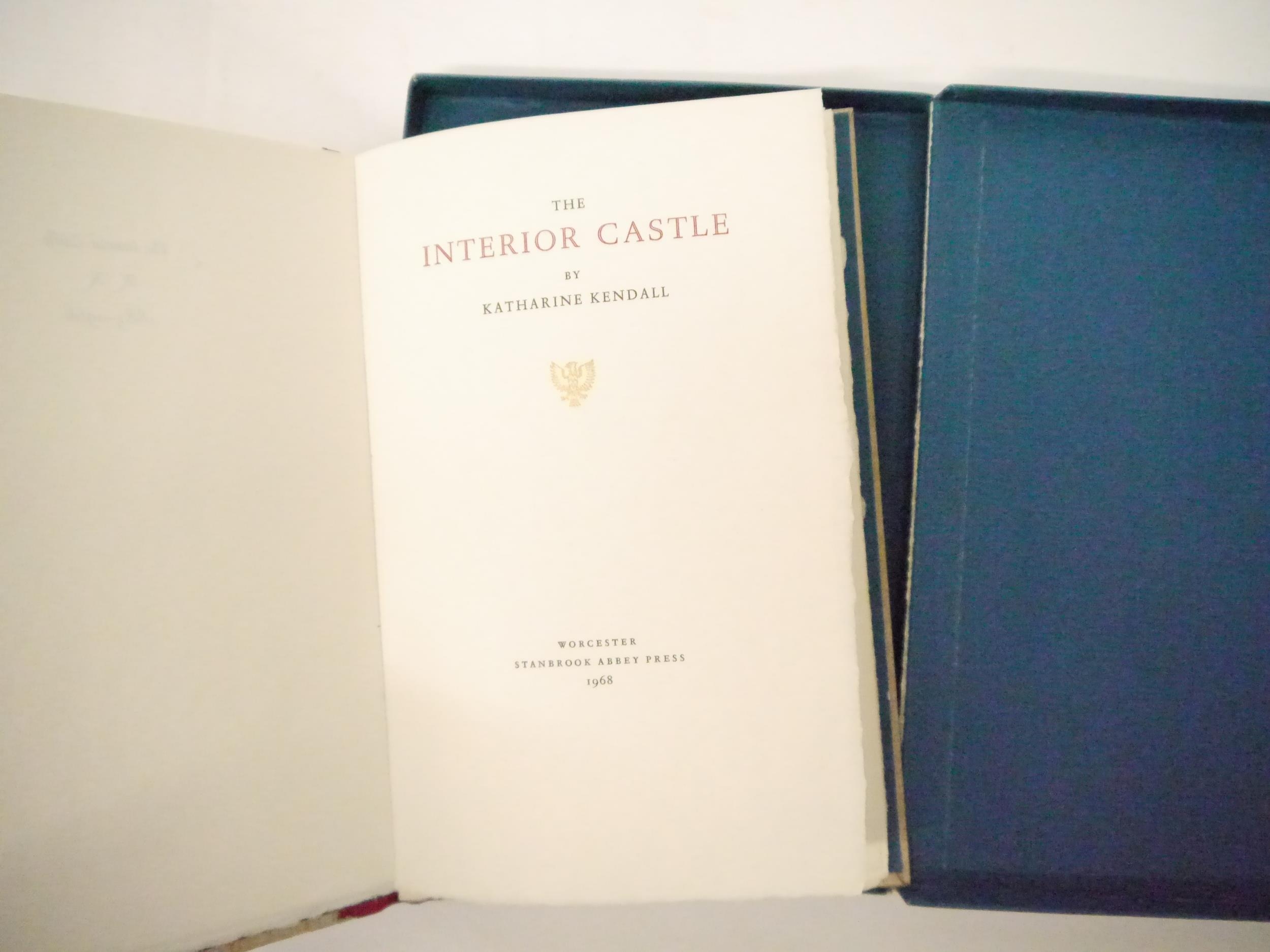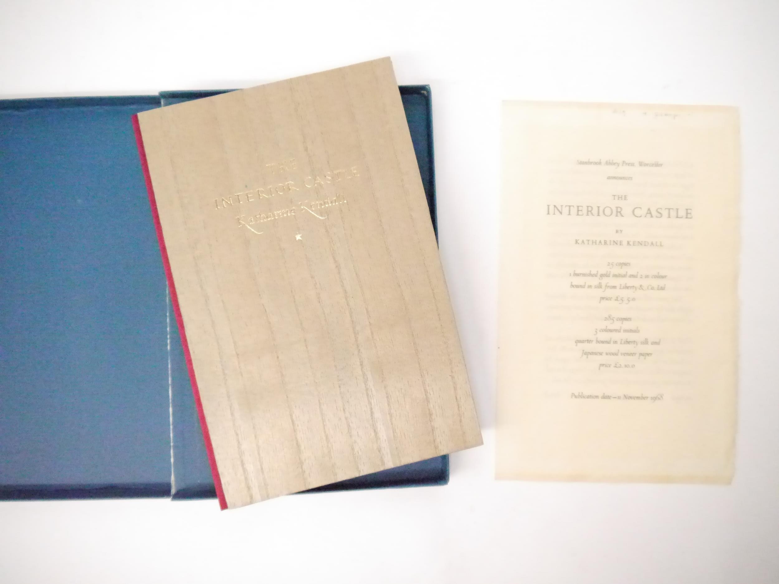 Stanbrook Abbey Press. 'The Interior Castle by Katharine Kendall.', Printed at the Stanbrook Abbey Press, 1968, limited edition, one of 310 copies on hand-made paper with 3 hand-drawn initial letters in red. Fine copy with red silk spine, wood veneer paper over boards, drop-back box. With the original prospectus and small printed slip. (Butcher A18).