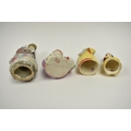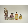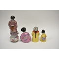 A late 19th/early 20th Century enamel painted porcelain figure holding a woven pot, later Japanese seated figure and two Royal Worcester Oriental candle snuffer figures (4)