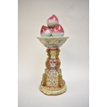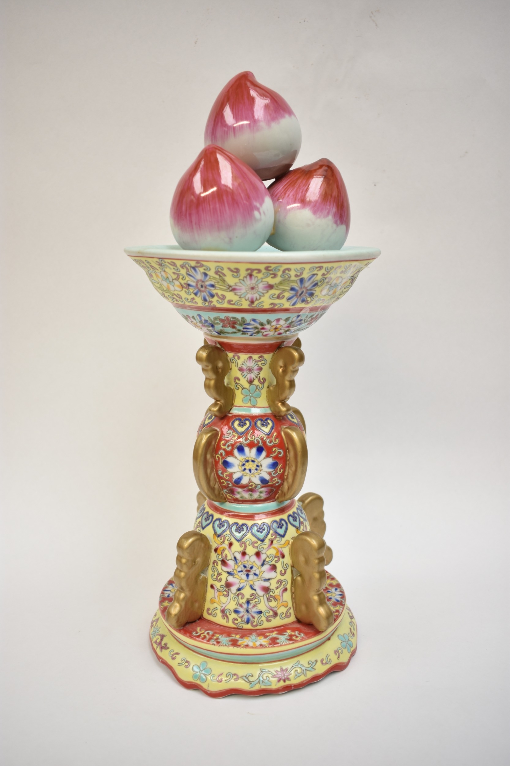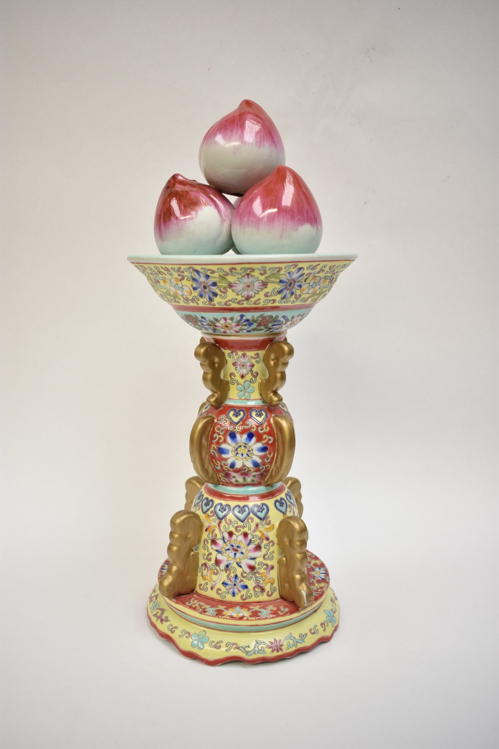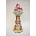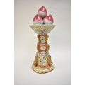 A Peoples Republic of China, table centrepiece, fruit held aloft, floral decorated column, blue Qianlong (1736-95) seal mark to base, but not of the period, 38.5cm tall