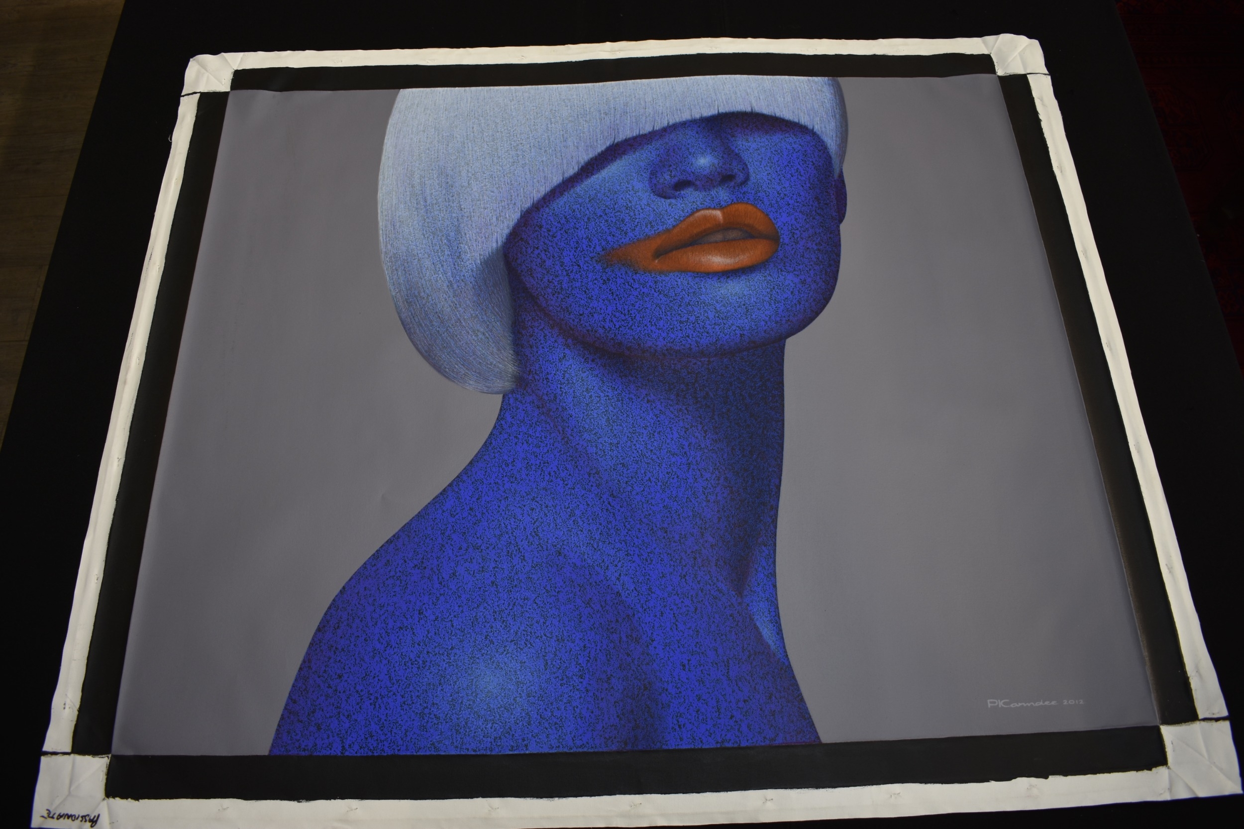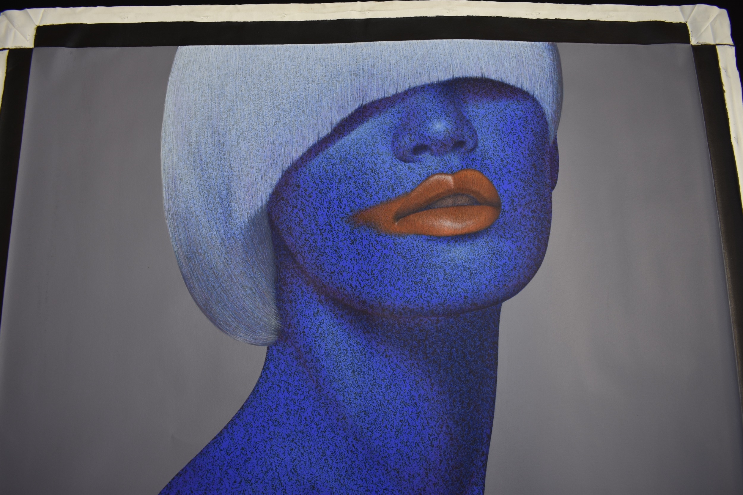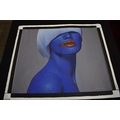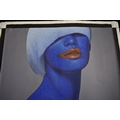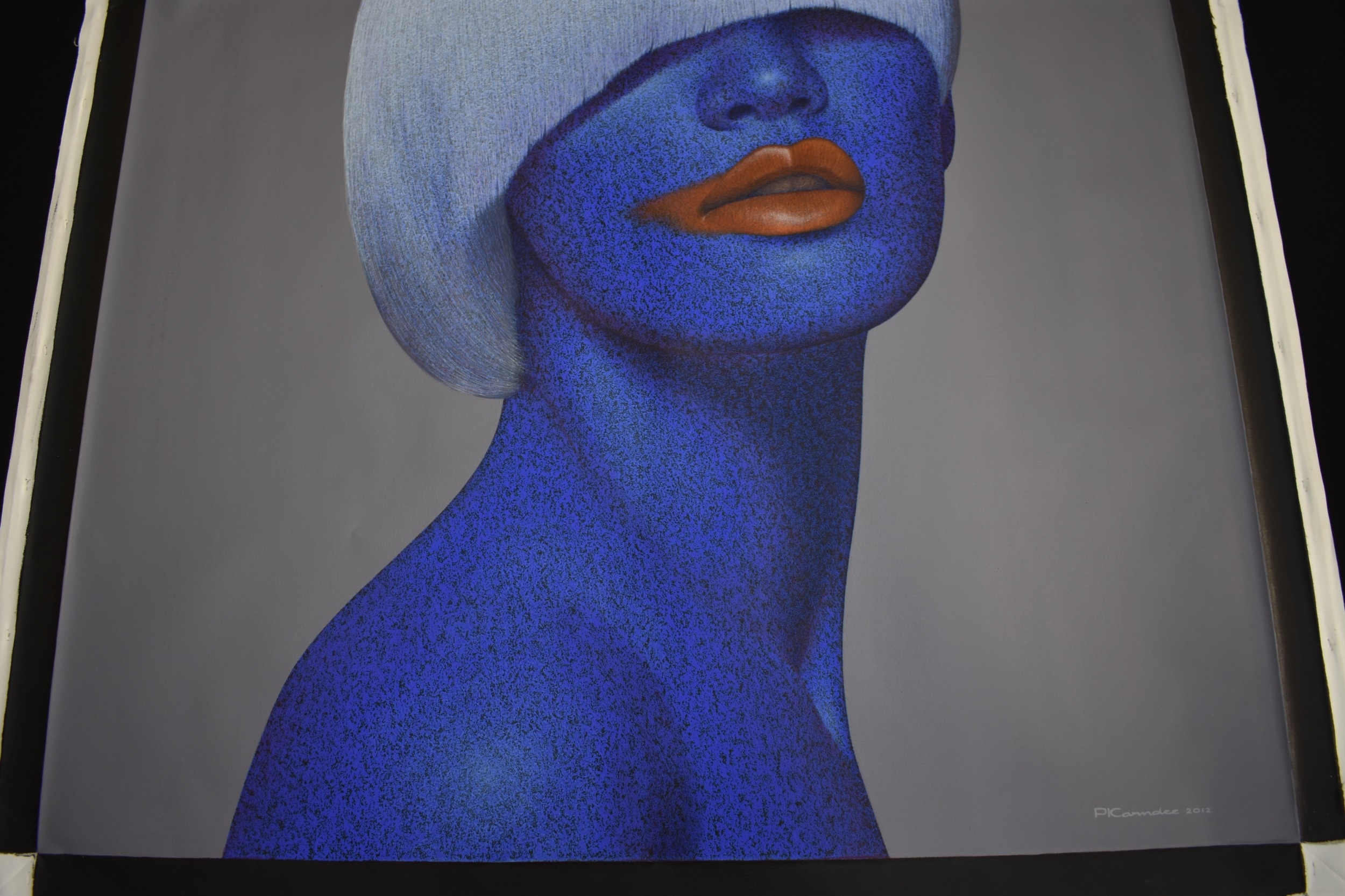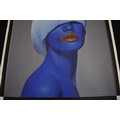 PAIROJ KARNDEE Thai Contemporary Artist: Female portrait, titled " Passionate " head and shoulder image, blue tonal skin, acrylic on canvas. The artist has been influenced by the mysterious Apsaras - the celestial maidens of ancient Asian culture depicted in the galleries of Cambodia's Angkor Wat. His techniques painstakingly recreate the stone textures of those images with a time-consuming rendering of acrylic on linen canvas. His figures show a notable range of emotions. Signed and dated, 2012, image size 89.5cm x 109.5cm