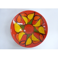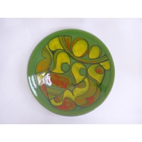 Two Poole Pottery Delphis range plates, shape 3, orange & green, yellow & green colours. Black backstamps. 20cm diameter