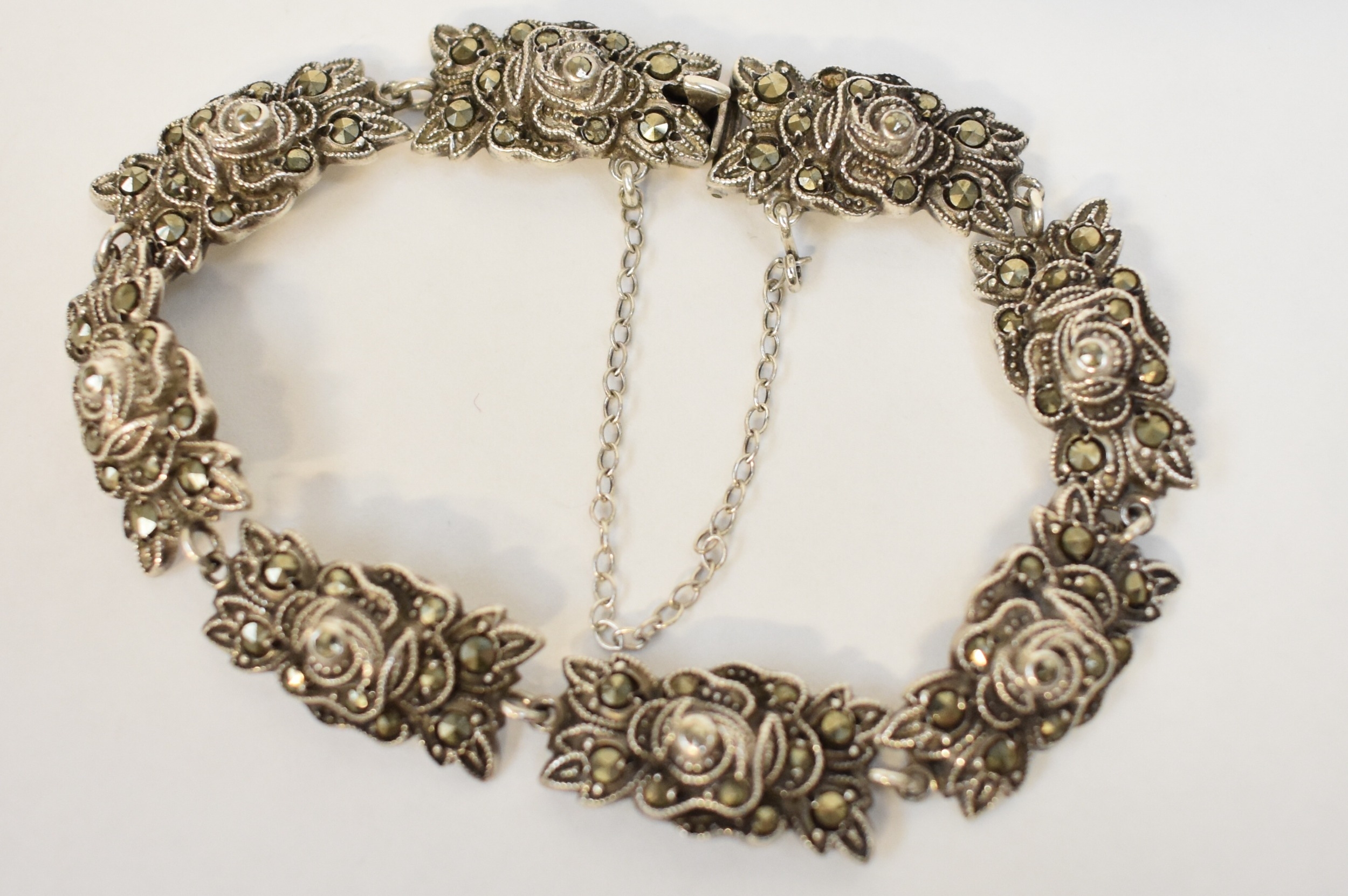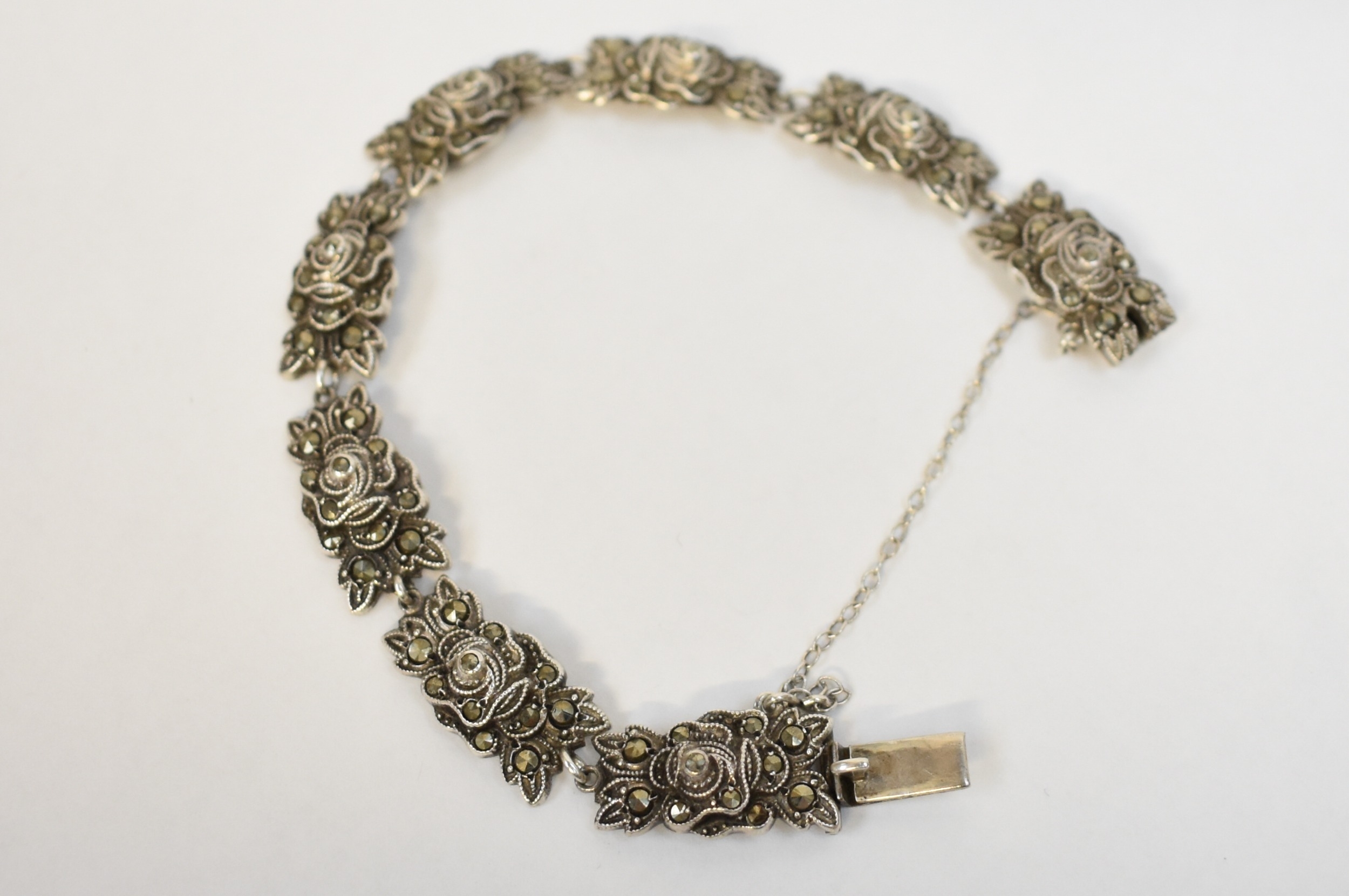 A white metal marcasite bracelet of floral form