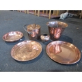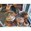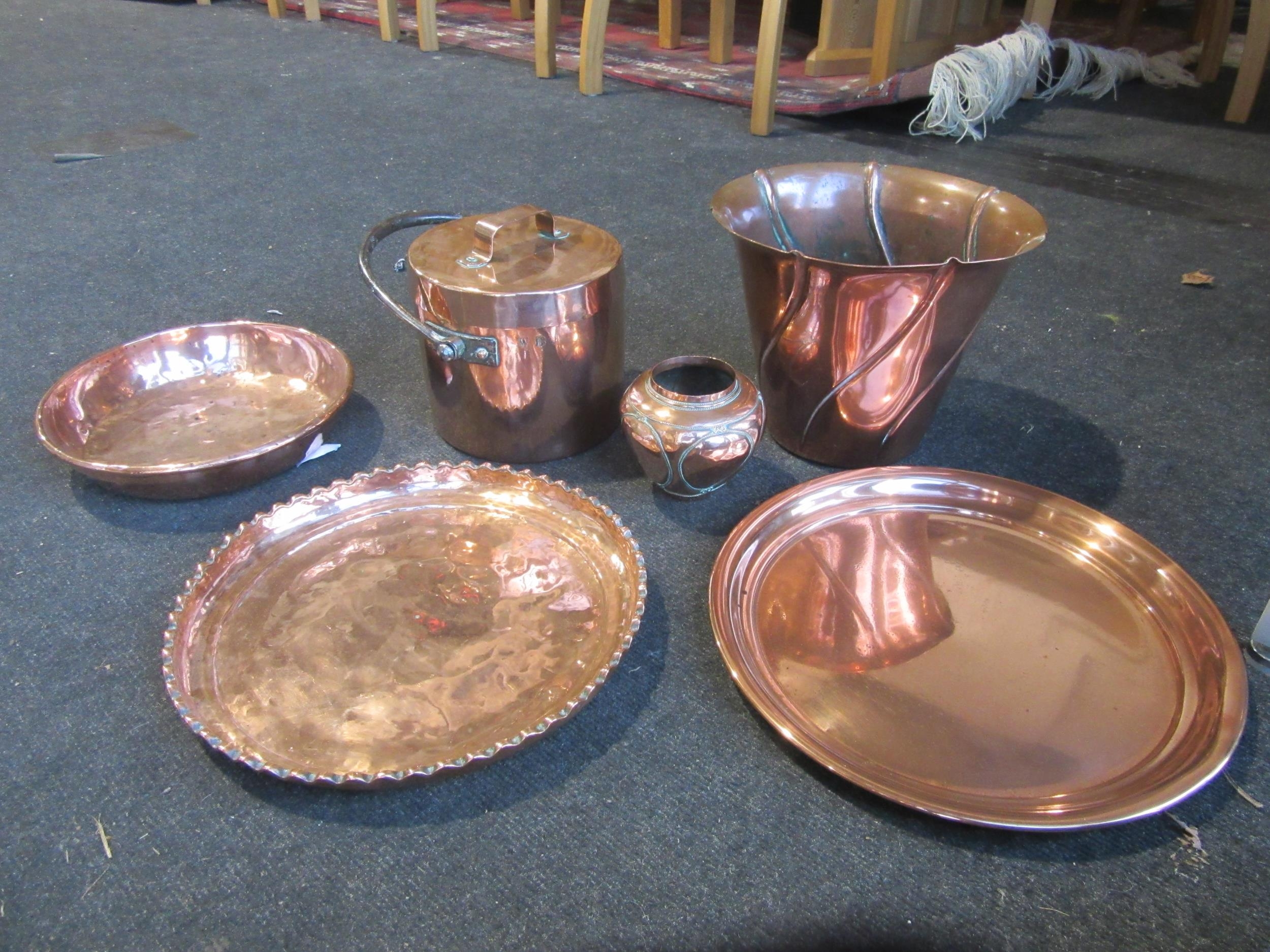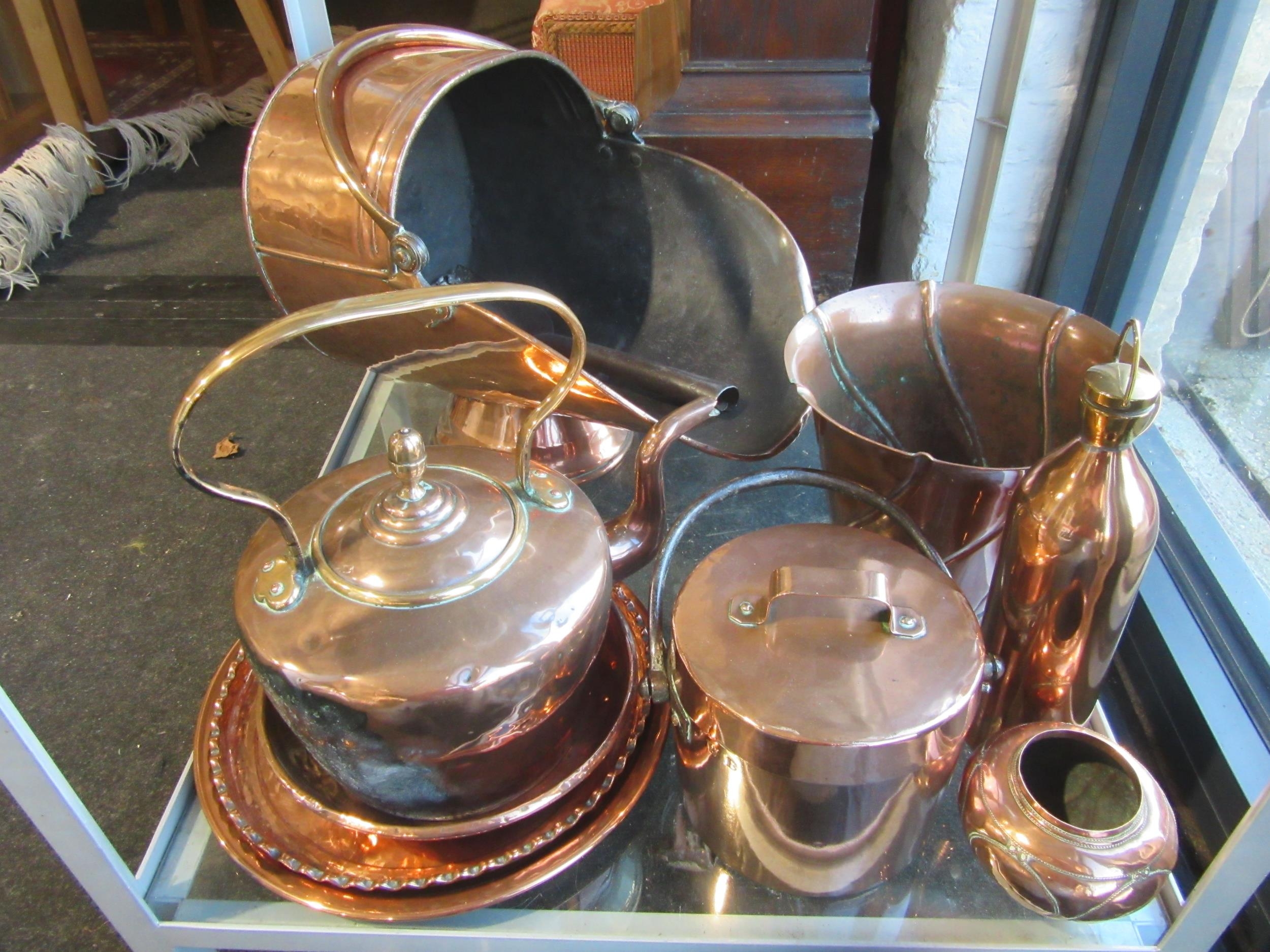 A collection of metal wares to include a copper helmet shaped coal scuttle, copper waste paper basket, etc.