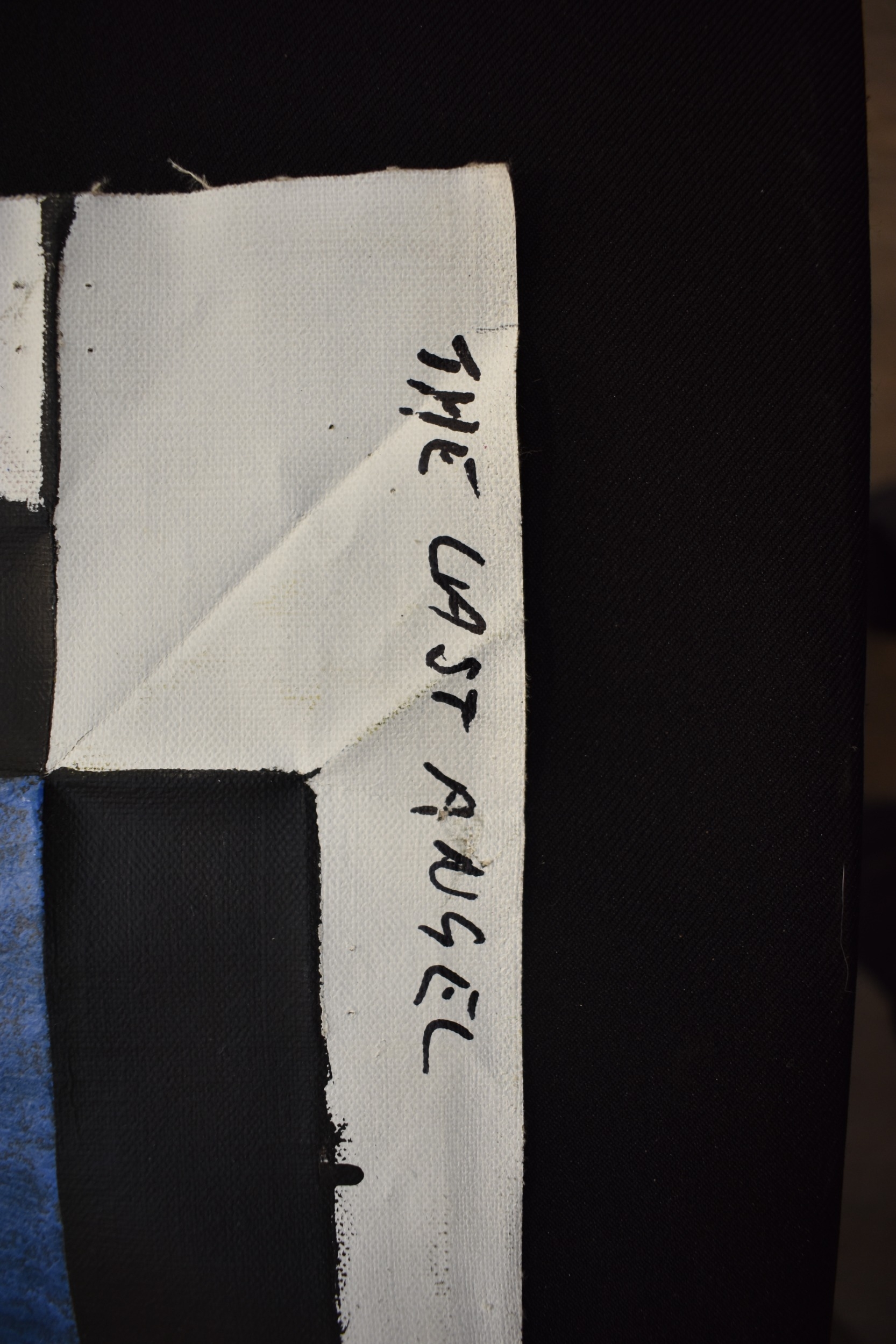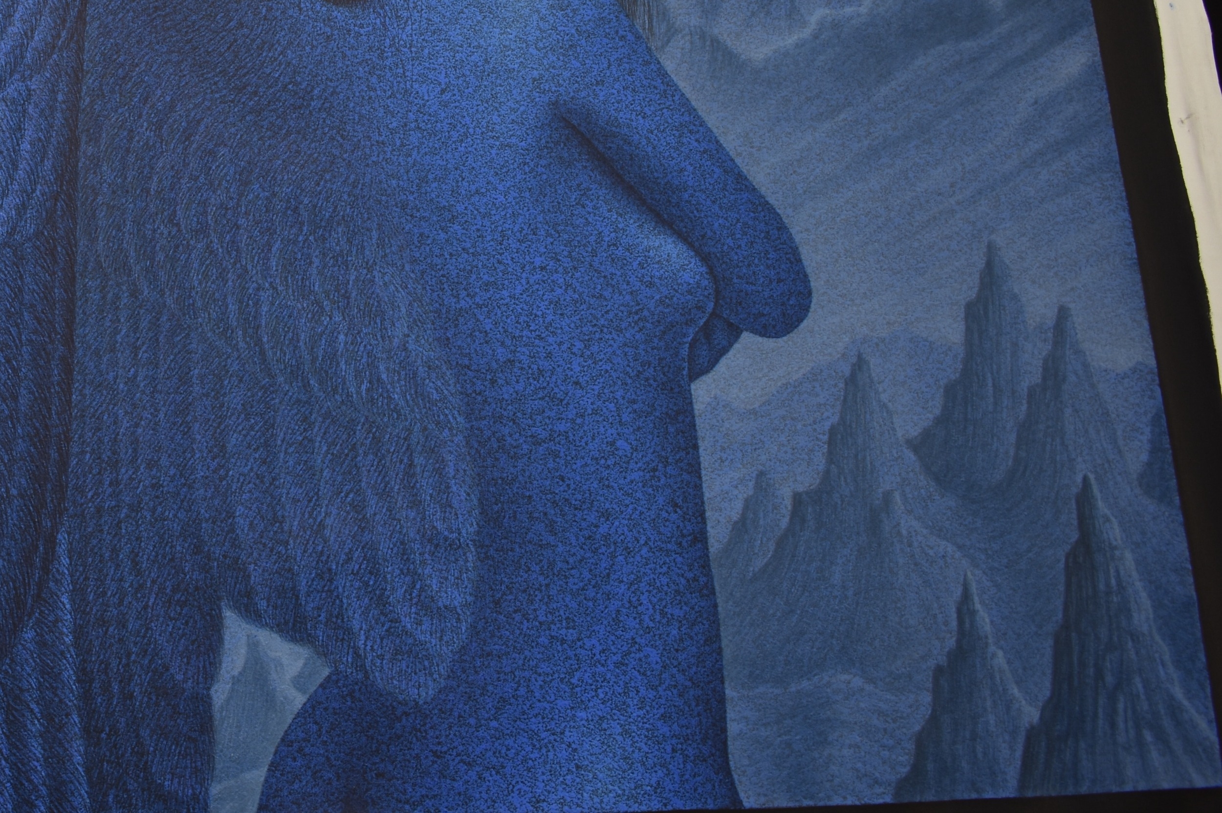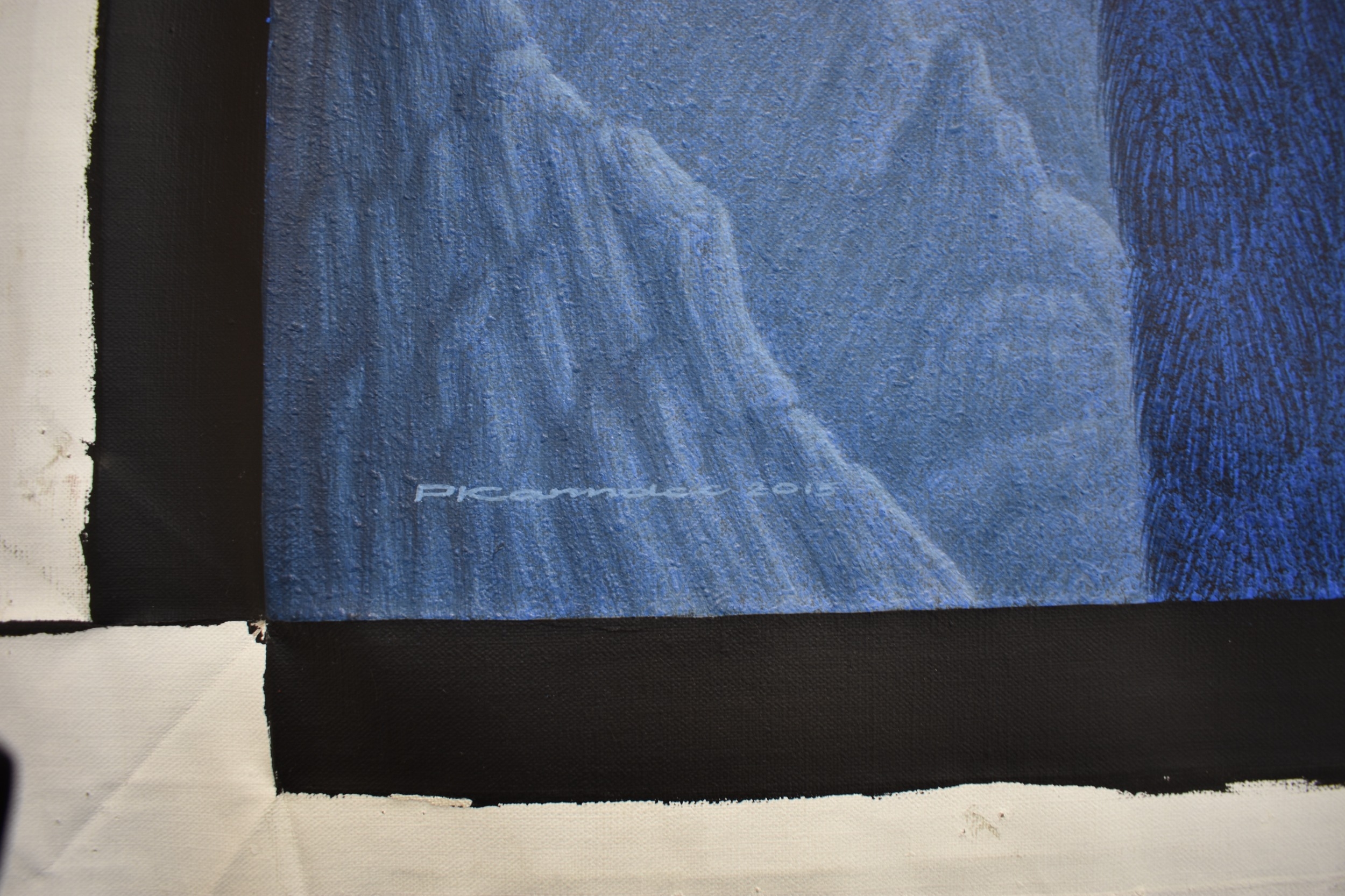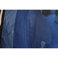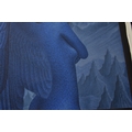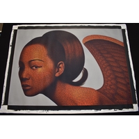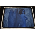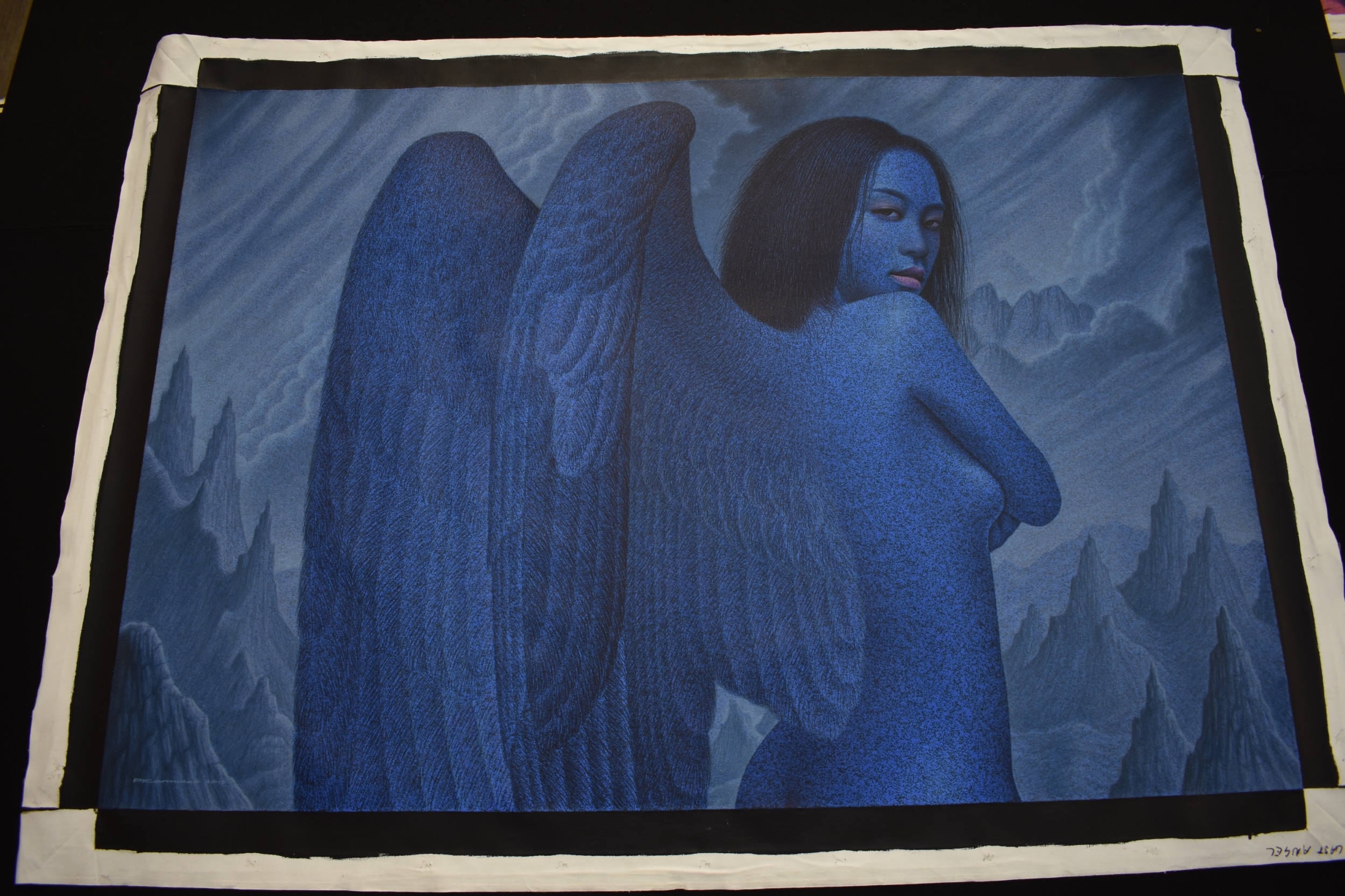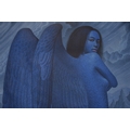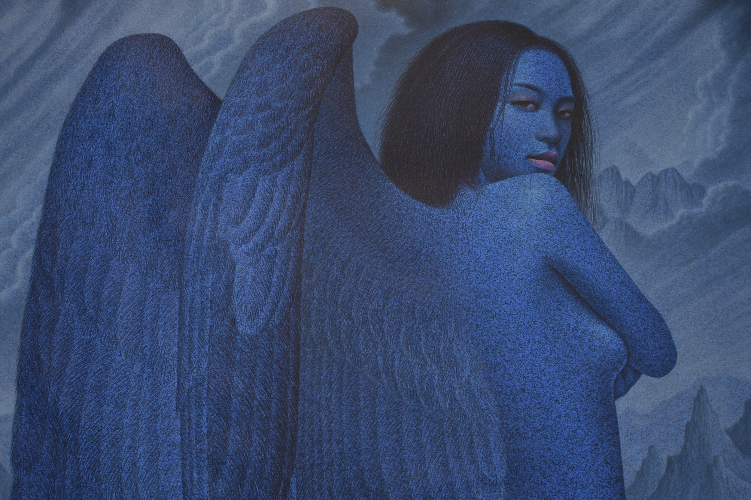 PAIROJ KARNDEE Thai Contemporary Artist: Portrait female in Angel form, titled " The last Angel" the angel standing with back towards you head turned looking over her shoulder, blue tonal skin, acrylic on canvas. The artist has been influenced by the mysterious Apsaras - the celestial maidens of ancient Asian culture depicted in the galleries of Cambodia's Angkor Wat. His techniques painstakingly recreate the stone textures of those images with a time-consuming rendering of acrylic on linen canvas. His figures show a notable range of emotions. Signed and dated, 2013, 89.5cm x 129cm