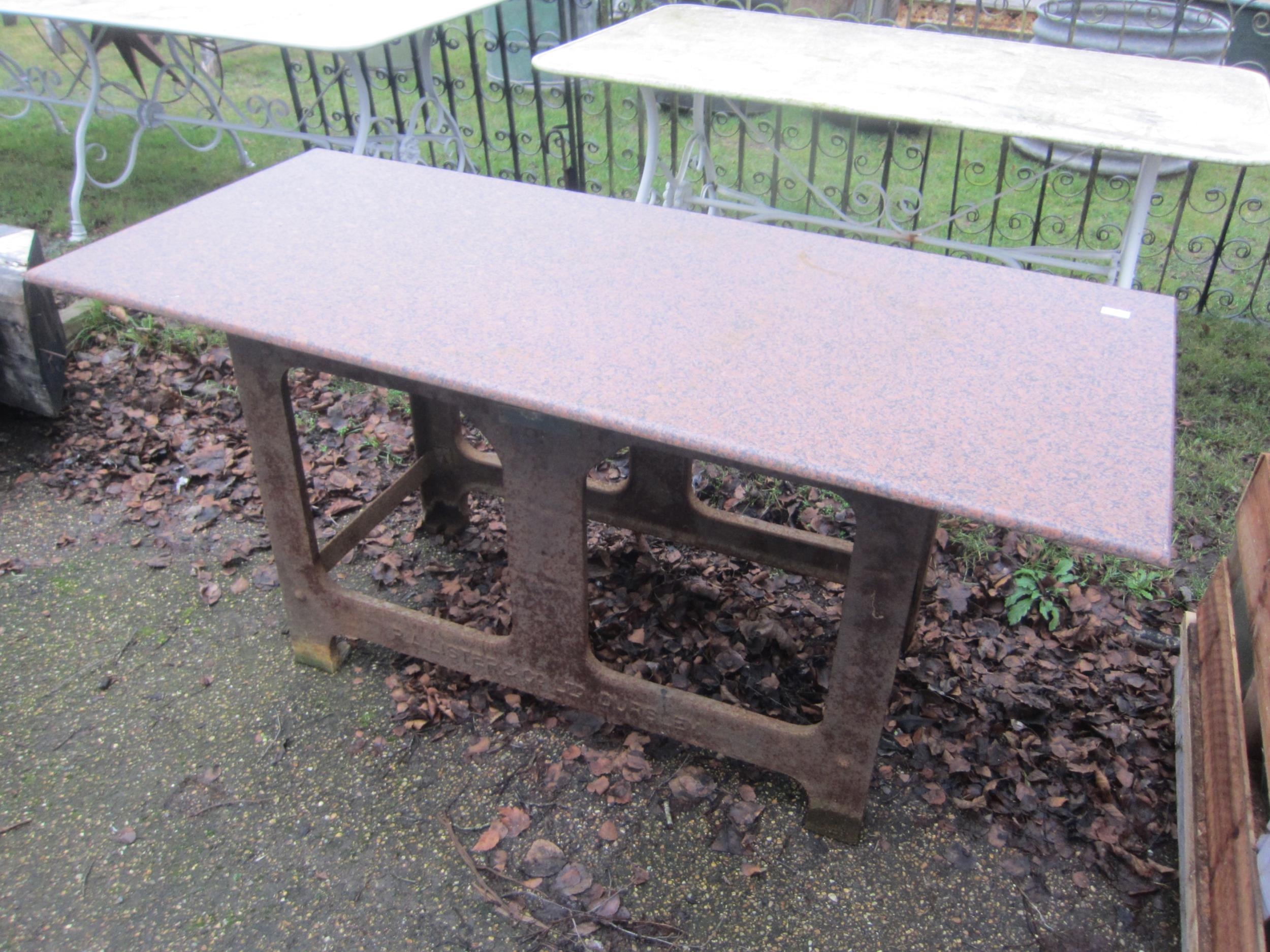 A cast iron R. A. Lister iron machine base with marble table top, 160cm x 70cm table top, 74cm high