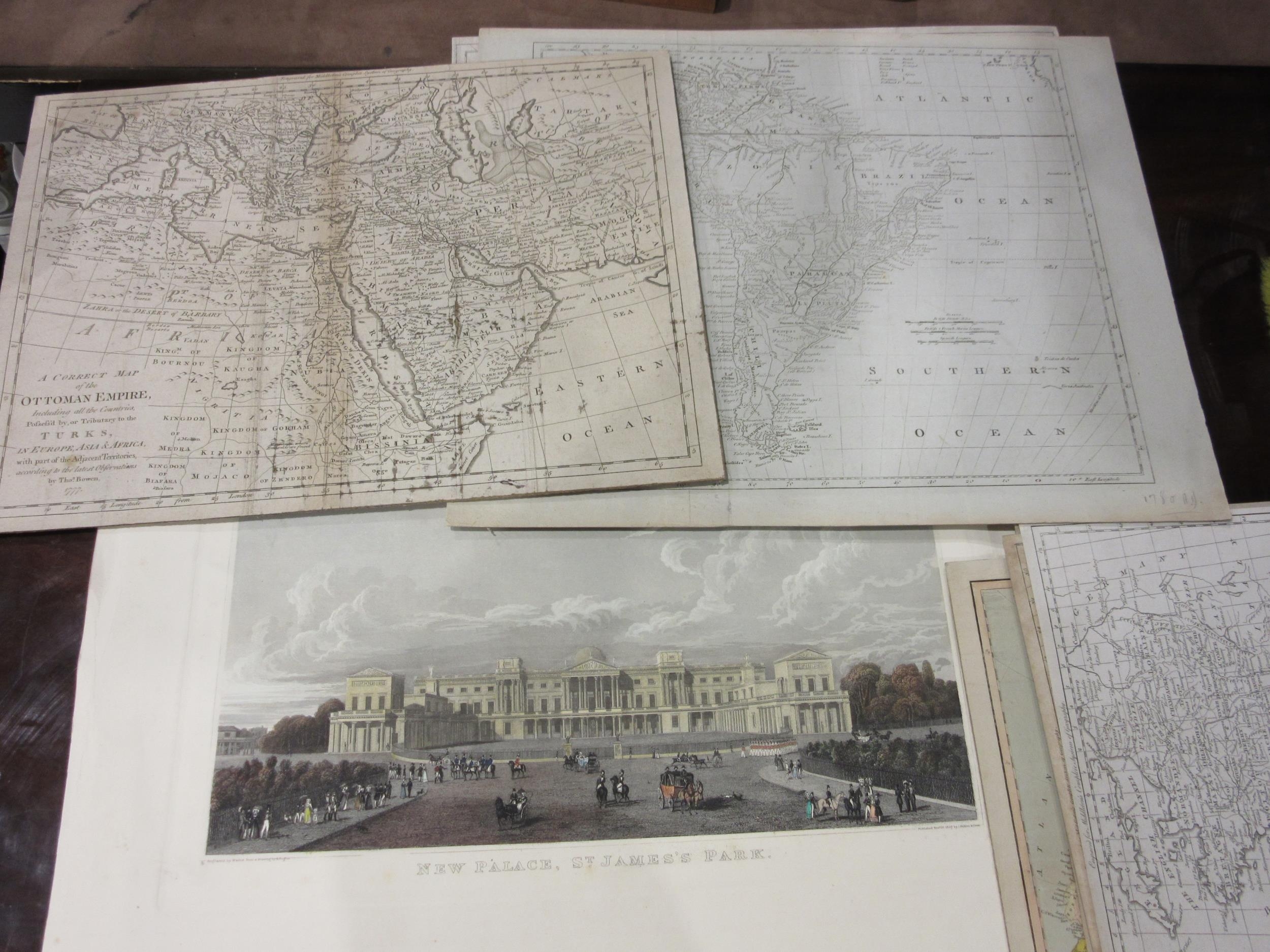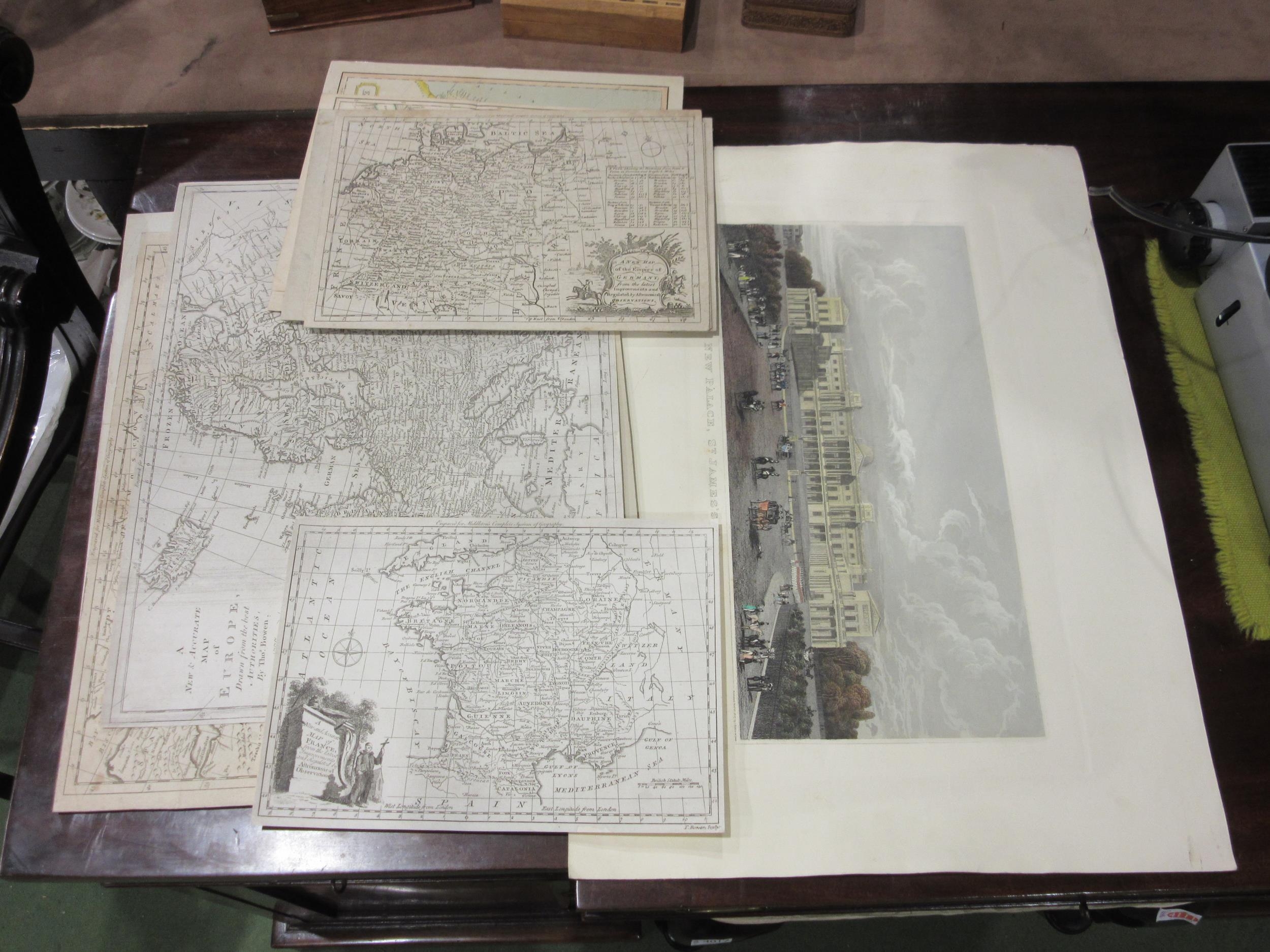 A packet containing nine engraved maps, mainly 18th Century by Thomas Bowen, two professionally cleaned and restored and ready for mounting/framing, being ‘A New and Accurate Map of Europe’, 1777, 34 x 44cm, and ‘France’, 21 x 29cm, plus others Germany, Spain & Portugal, Ottoman Empire etc, and an engraving of New Palace St James’s Park