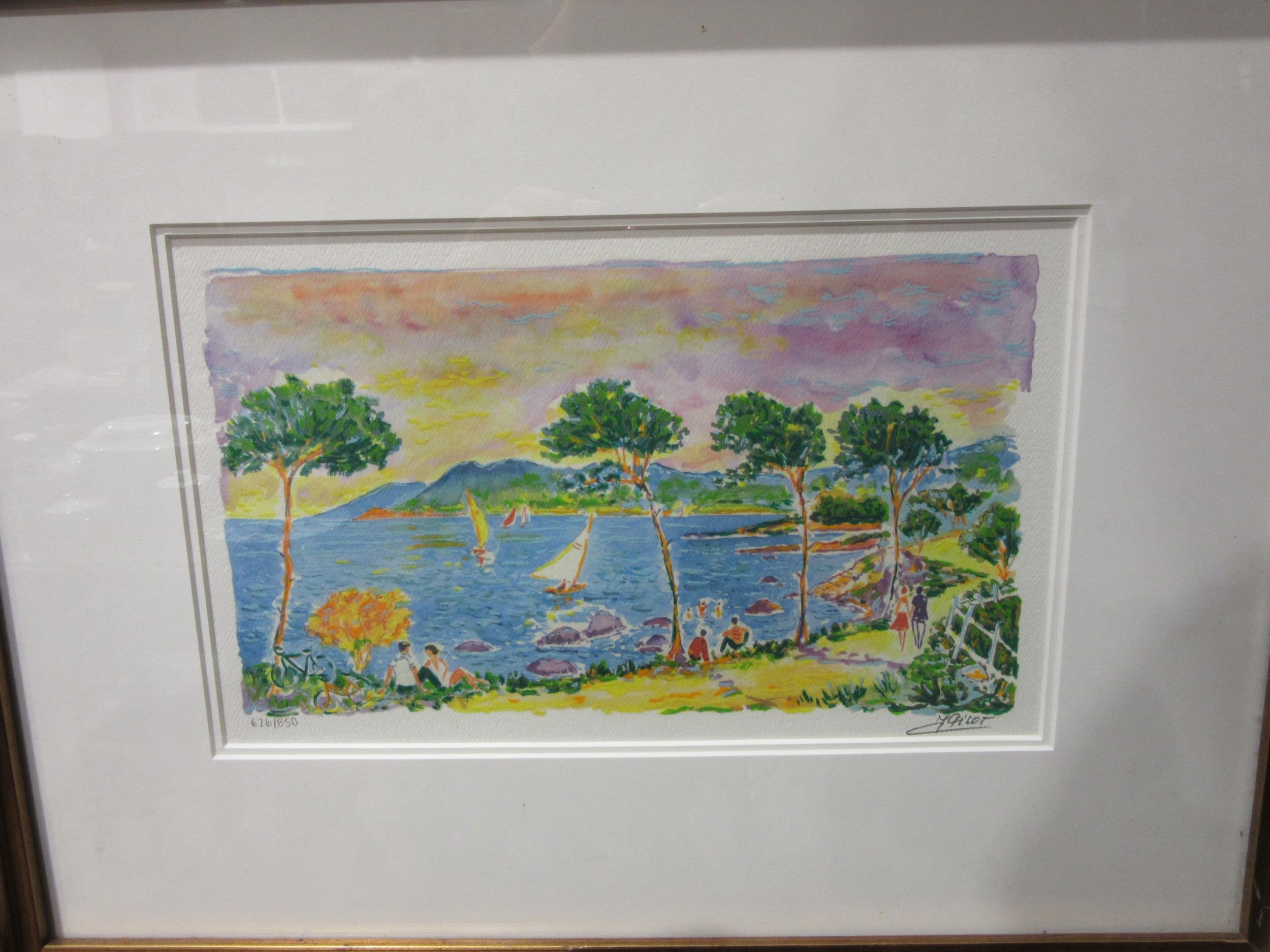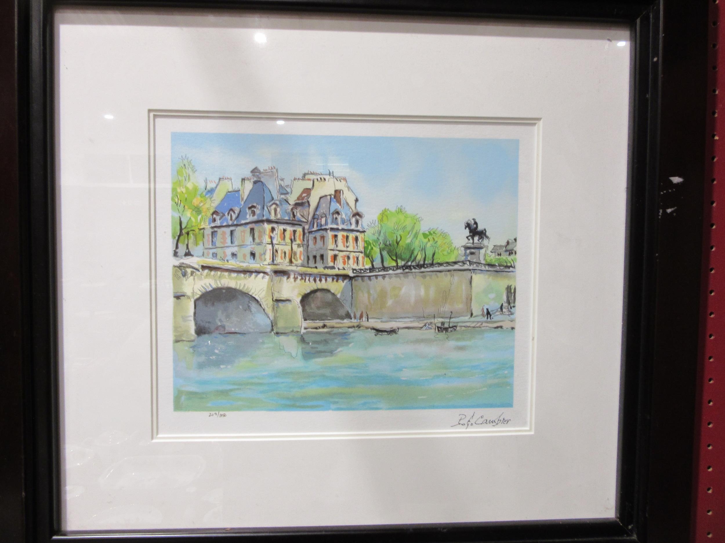 Two prints, one after Cambier "Le Pont Neuf" no.209/350, blind stamped, signed lower right, framed and glazed, 23.5cm x 28.5cm image size together with "Apres la Promenade" no.626/850, indistinctly signed lower right, framed and glazed, 17cm x 28.5cm image size (2)
