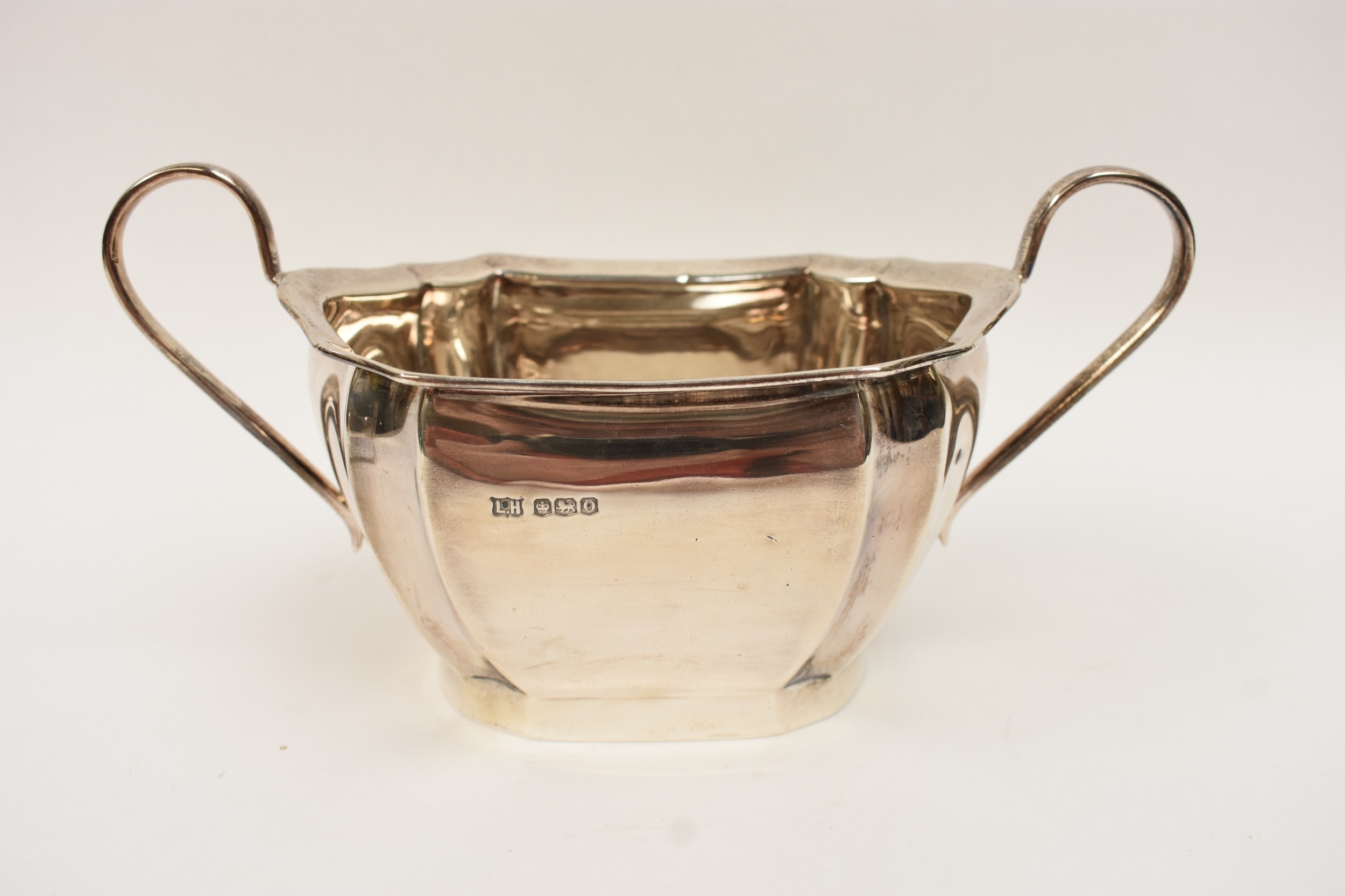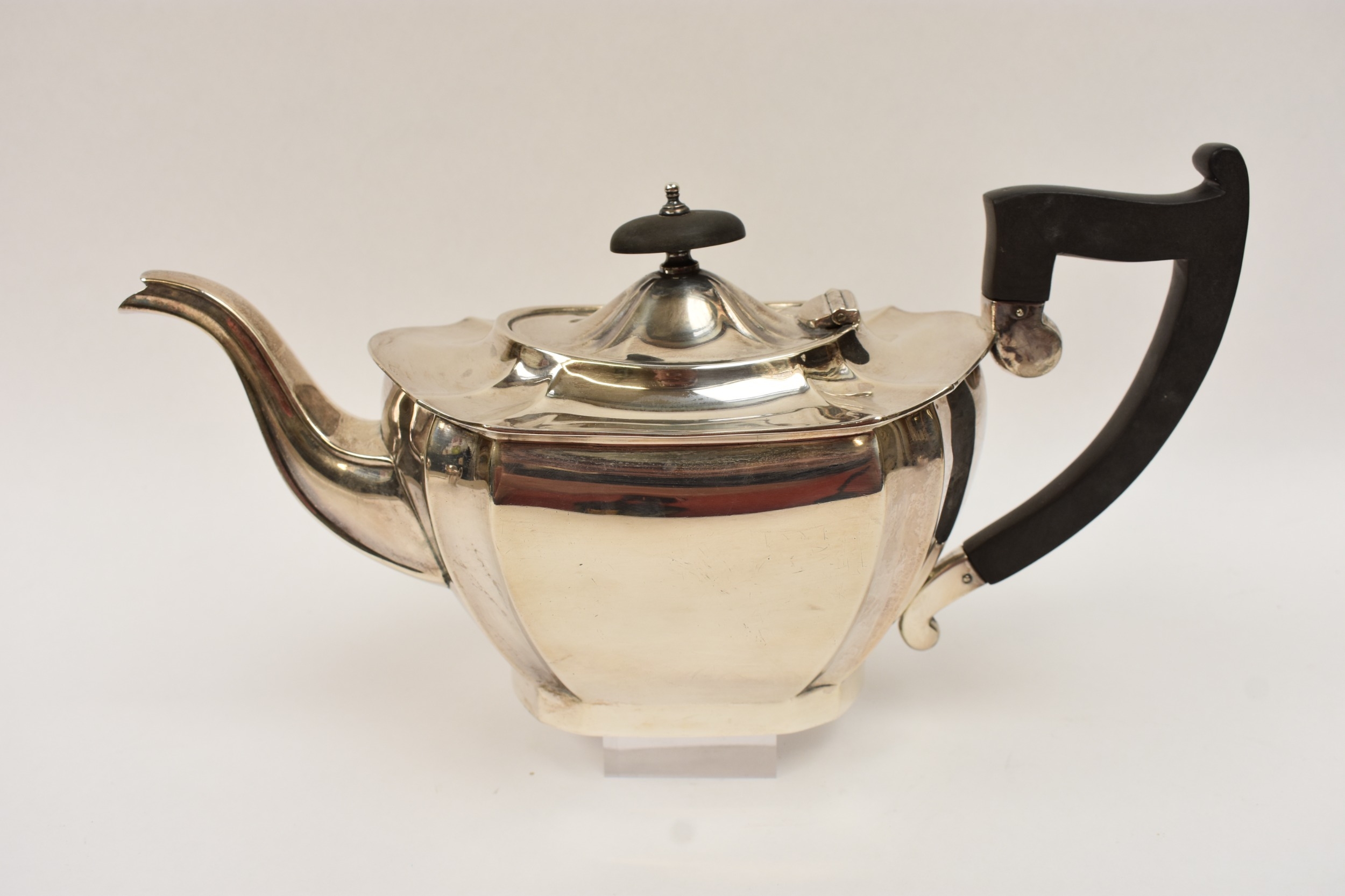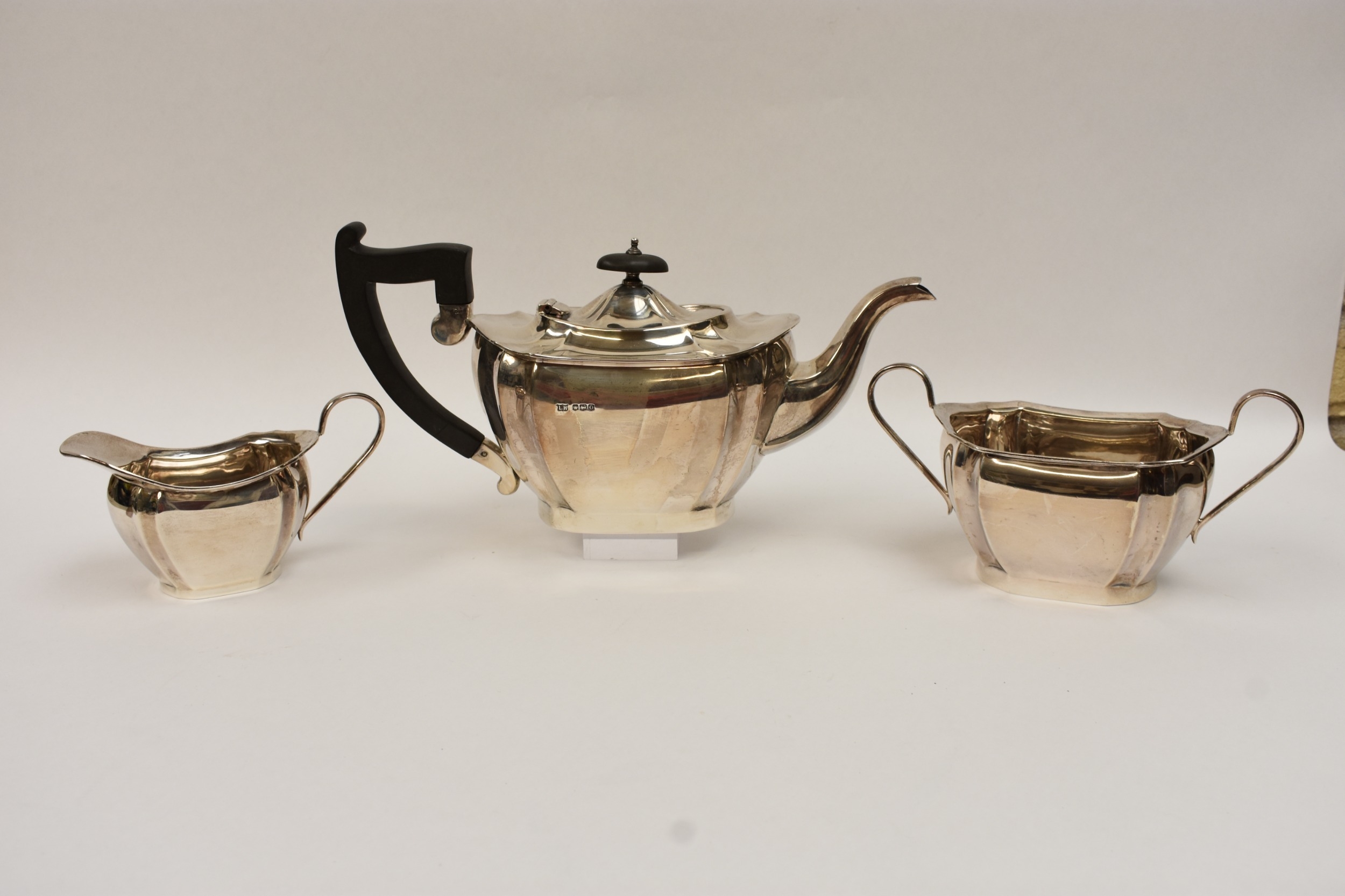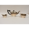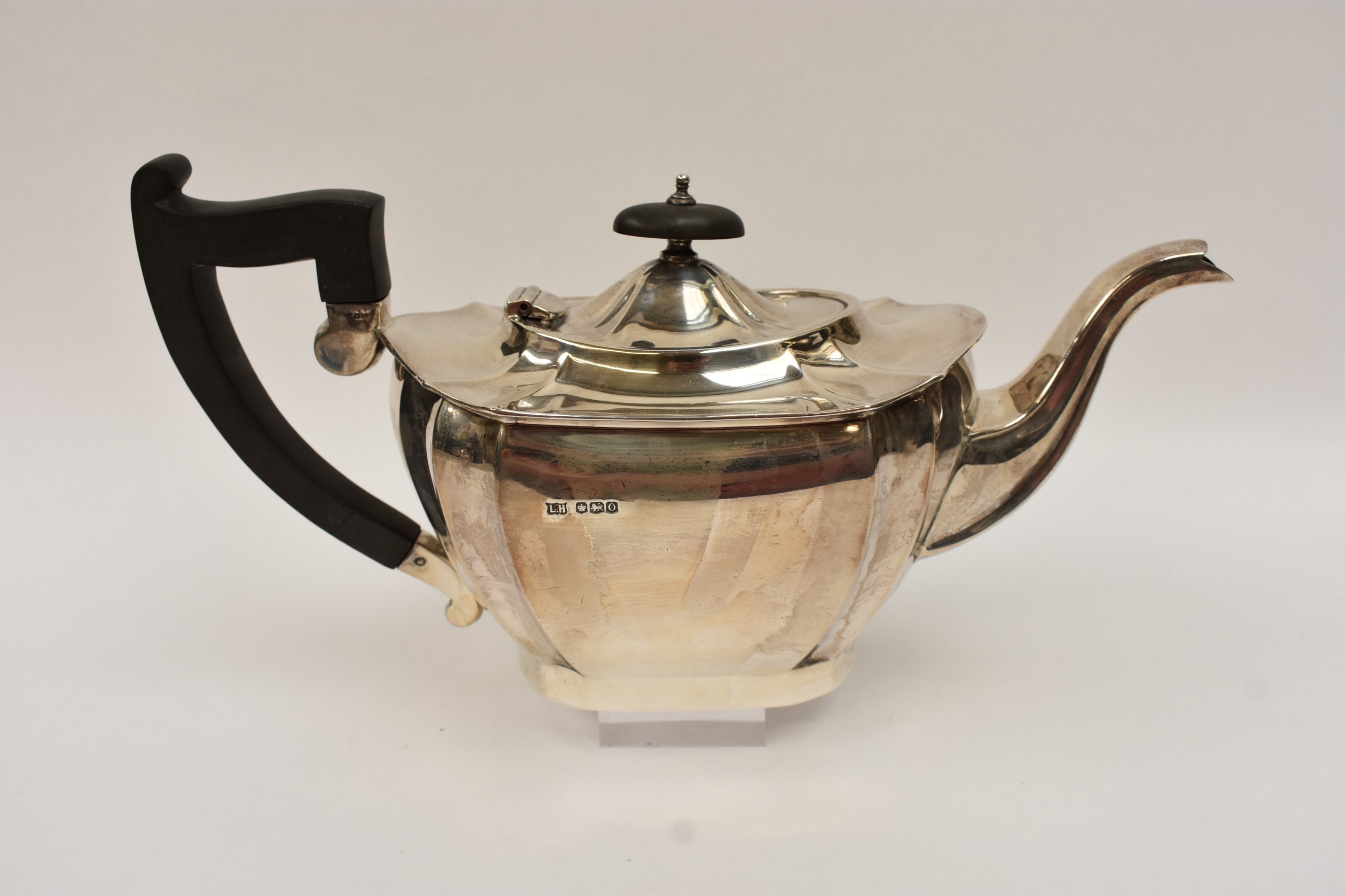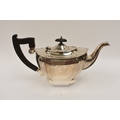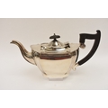 An L Harrison silver three piece tea set of classical form with ebony knop and handle, the sugar bowl has an impact mark to the side, Sheffield 1931, 1142g