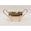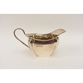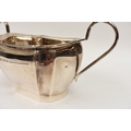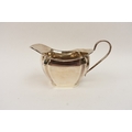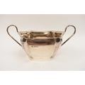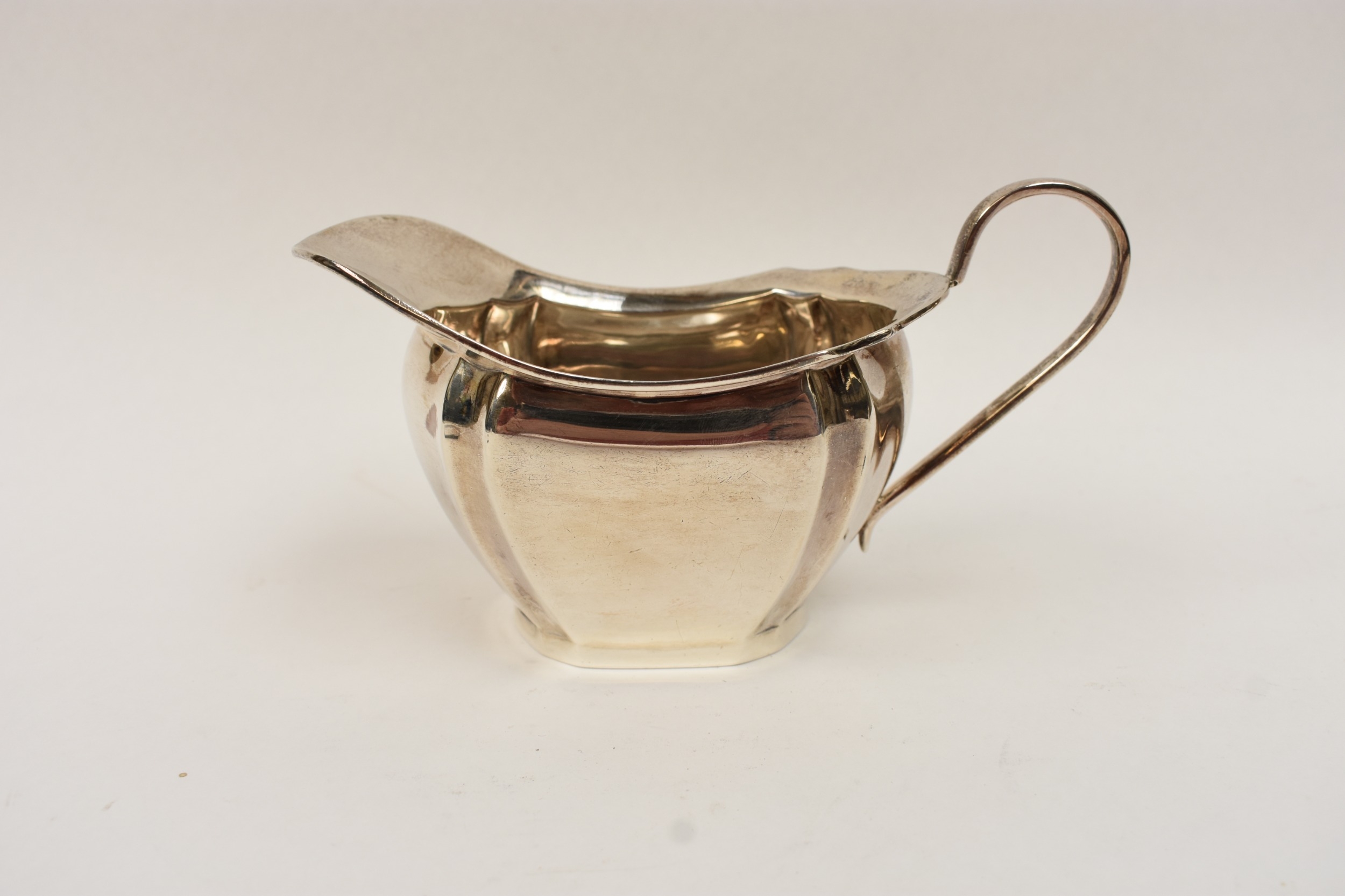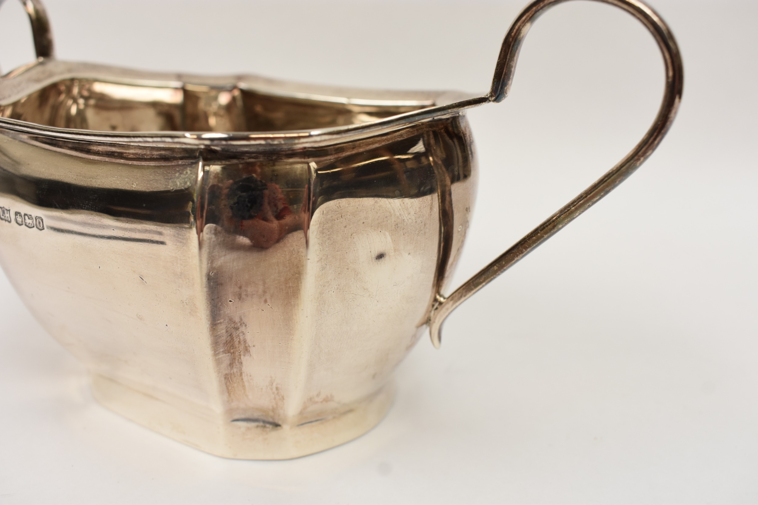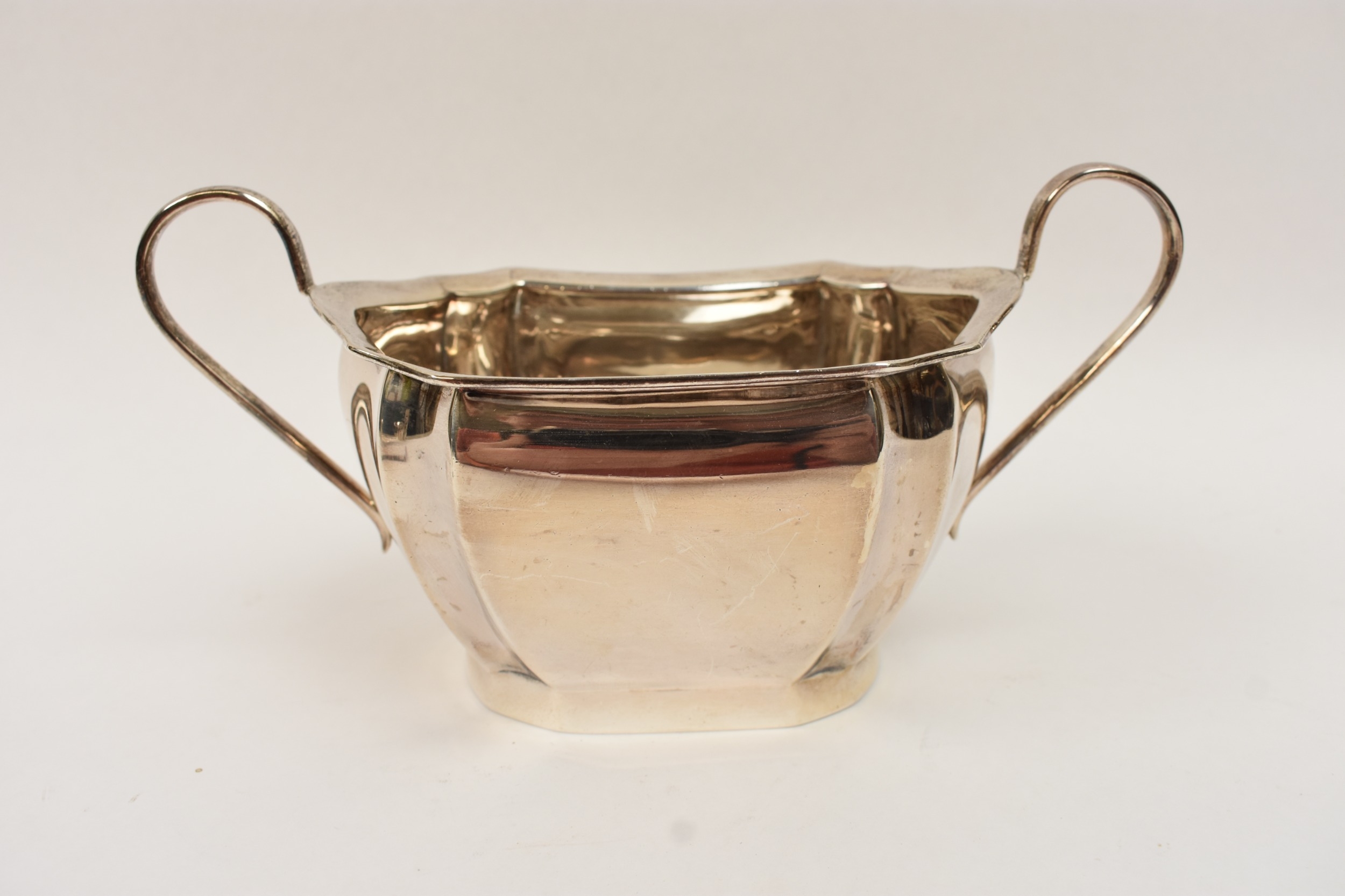 An L Harrison silver three piece tea set of classical form with ebony knop and handle, the sugar bowl has an impact mark to the side, Sheffield 1931, 1142g