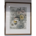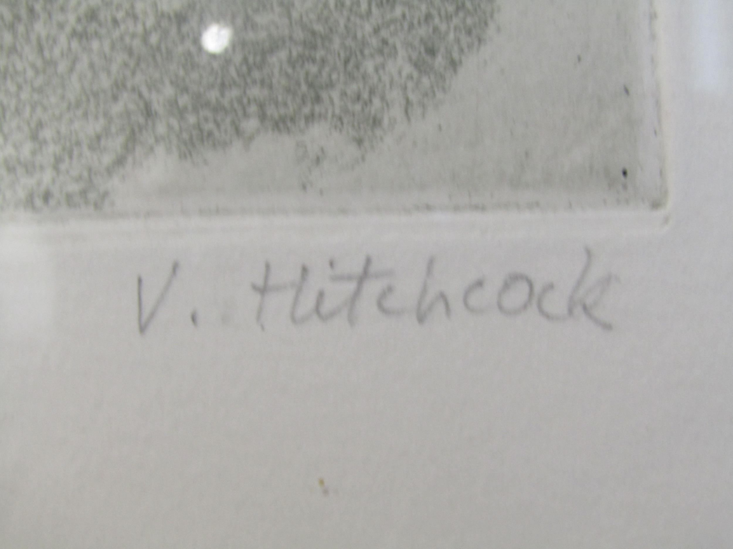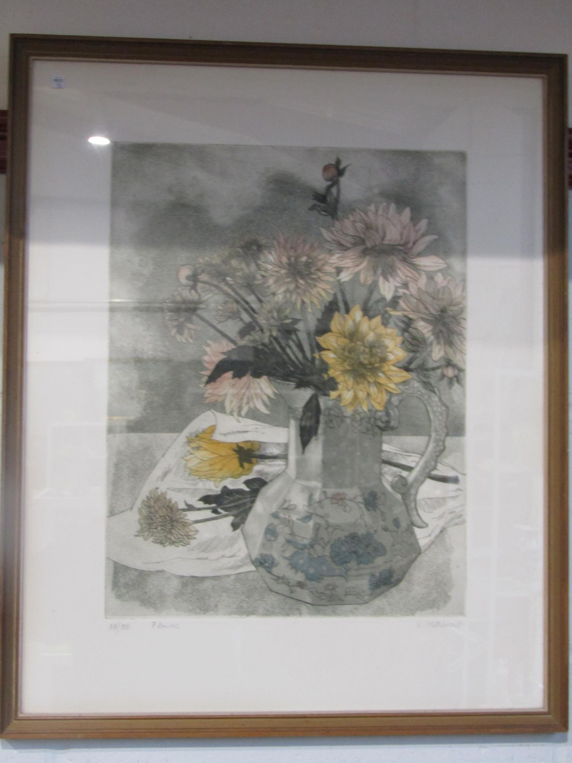 A limited edition V Hitchcock etching "Flowers" no. 38/50, signed lower right, framed and glazed. 43cm x 32cm image size