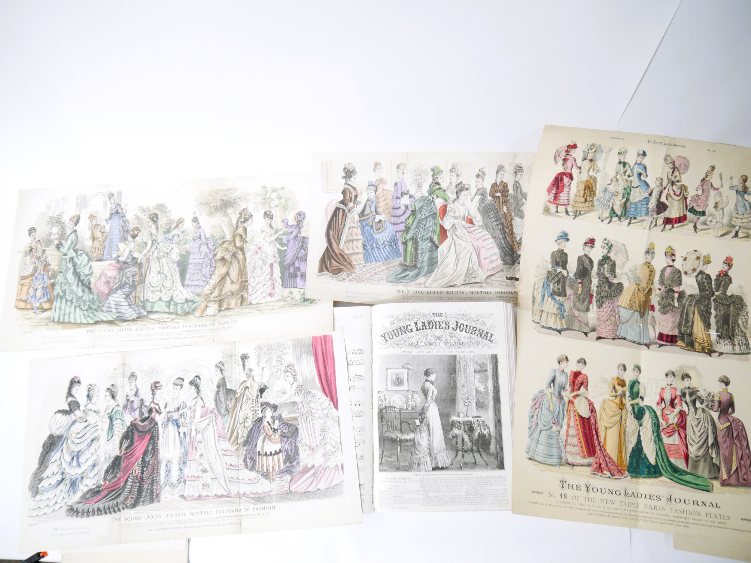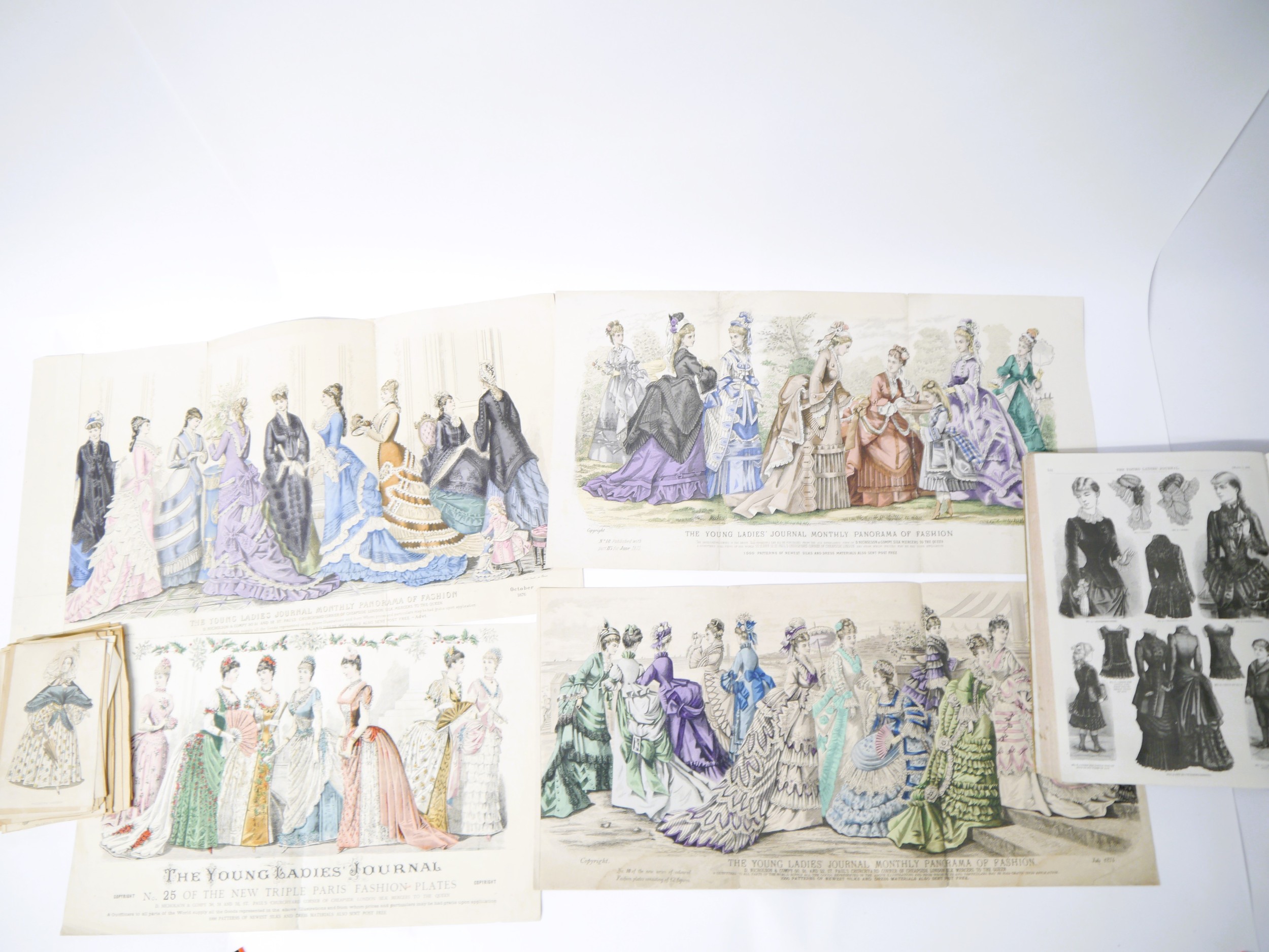 (Fashion.) 'The Young Ladies Journal. An Illustrated Magazine of Fashion, Fancy Work, Family Reading, etc etc', volume 21, January-December 1883, No's 973-1,024, 448pp, black & white engraved ills. throughout (some double page), folio, old quarter cloth; together with a packet containing 10 ‘New Triple Paris Fashion Plates’, D Nicholson and Company, all hand coloured 1887-88, 7 three-fold colour ‘Monthly Panorama of Fashion’ colour plates 1873-76, and 50 single hand coloured fashion illustrations from 1830s/40s
