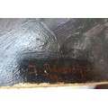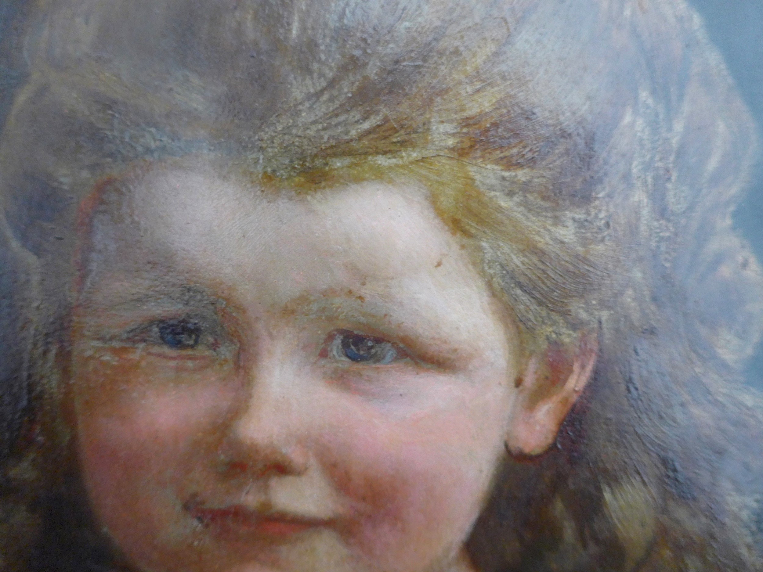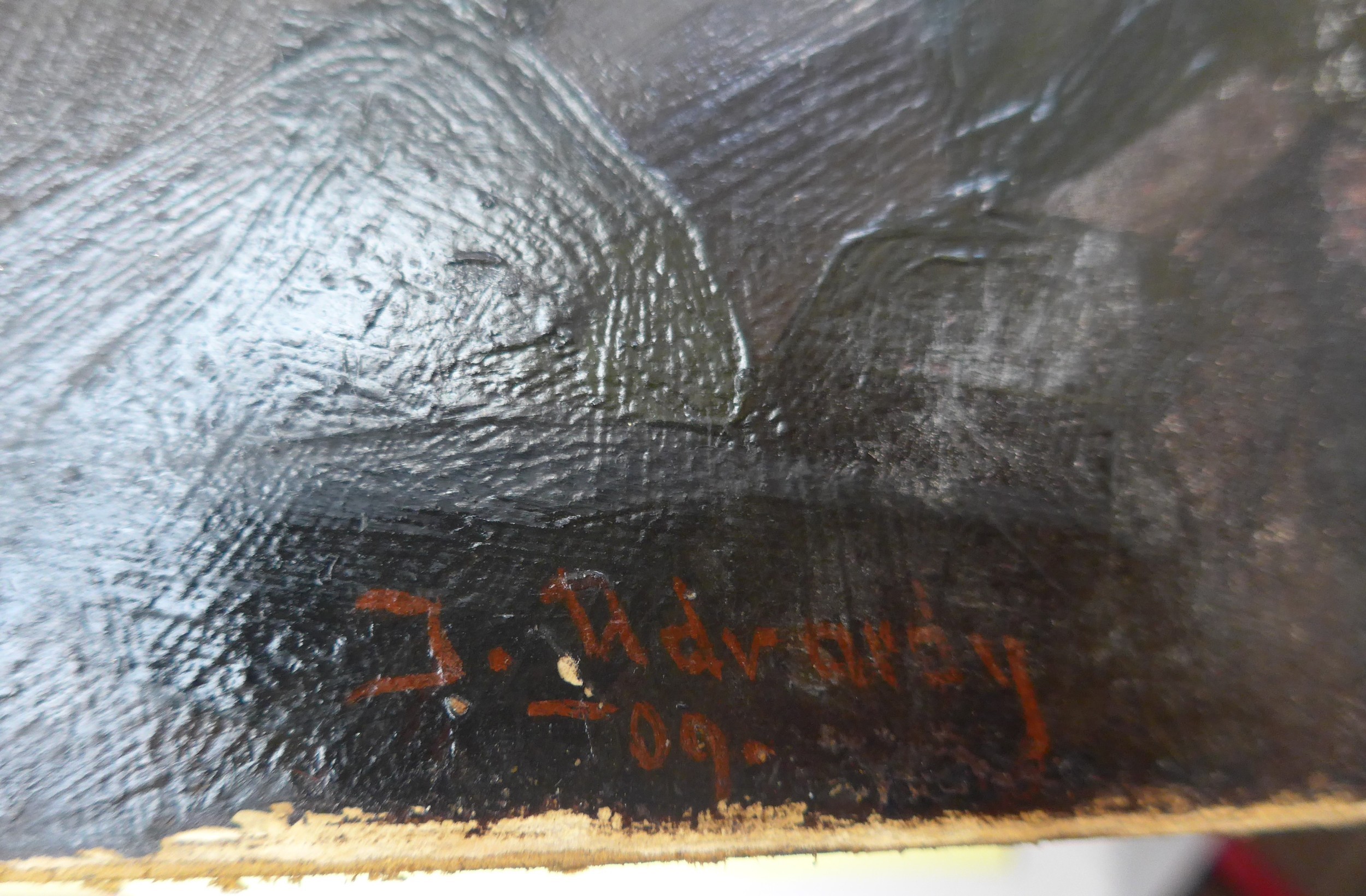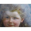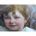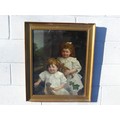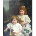 After Rowland Hilder (1903-1995) a framed and glazed print, landscape with deer. Signed in the print only. Image size 37cm x 55cm, and an early 20th Century oil on card board of two children dressed in white linen, holding Teddy Bears. Indistinctly signed bottom left 'J. Udvardy'? and dated '09. Set in a gilt frame (a/f) and glazed. Image size 63cm x 51cm (2)
