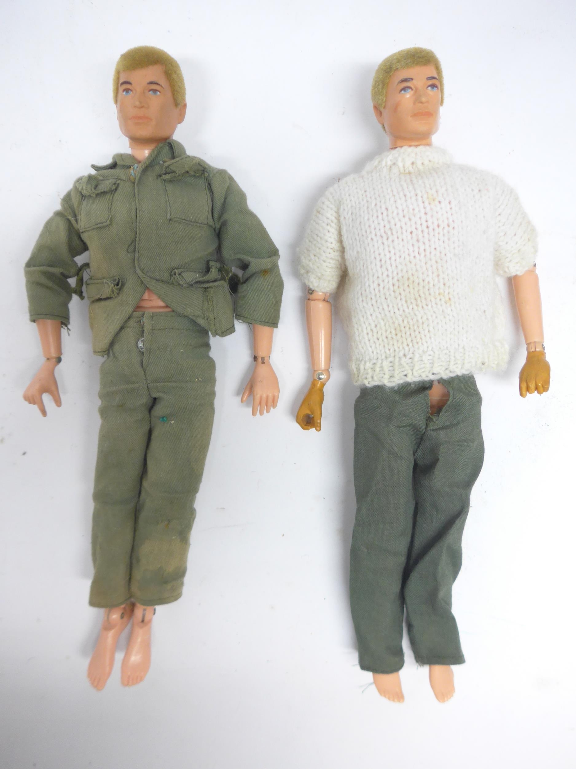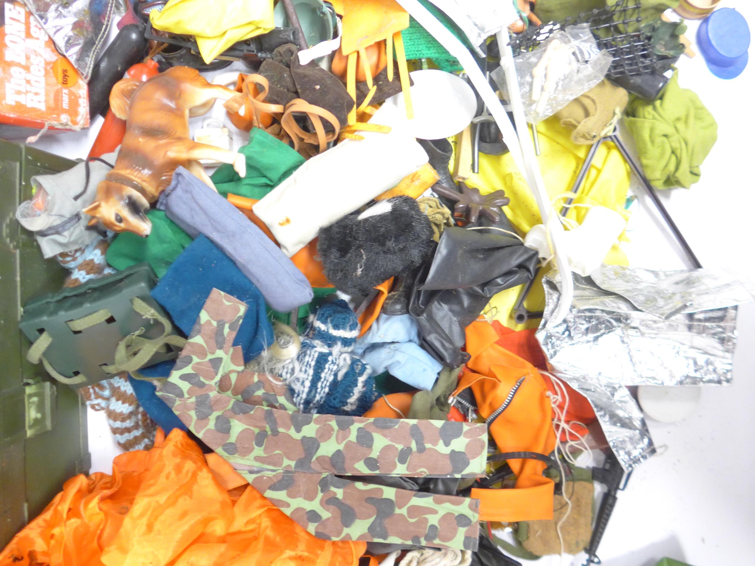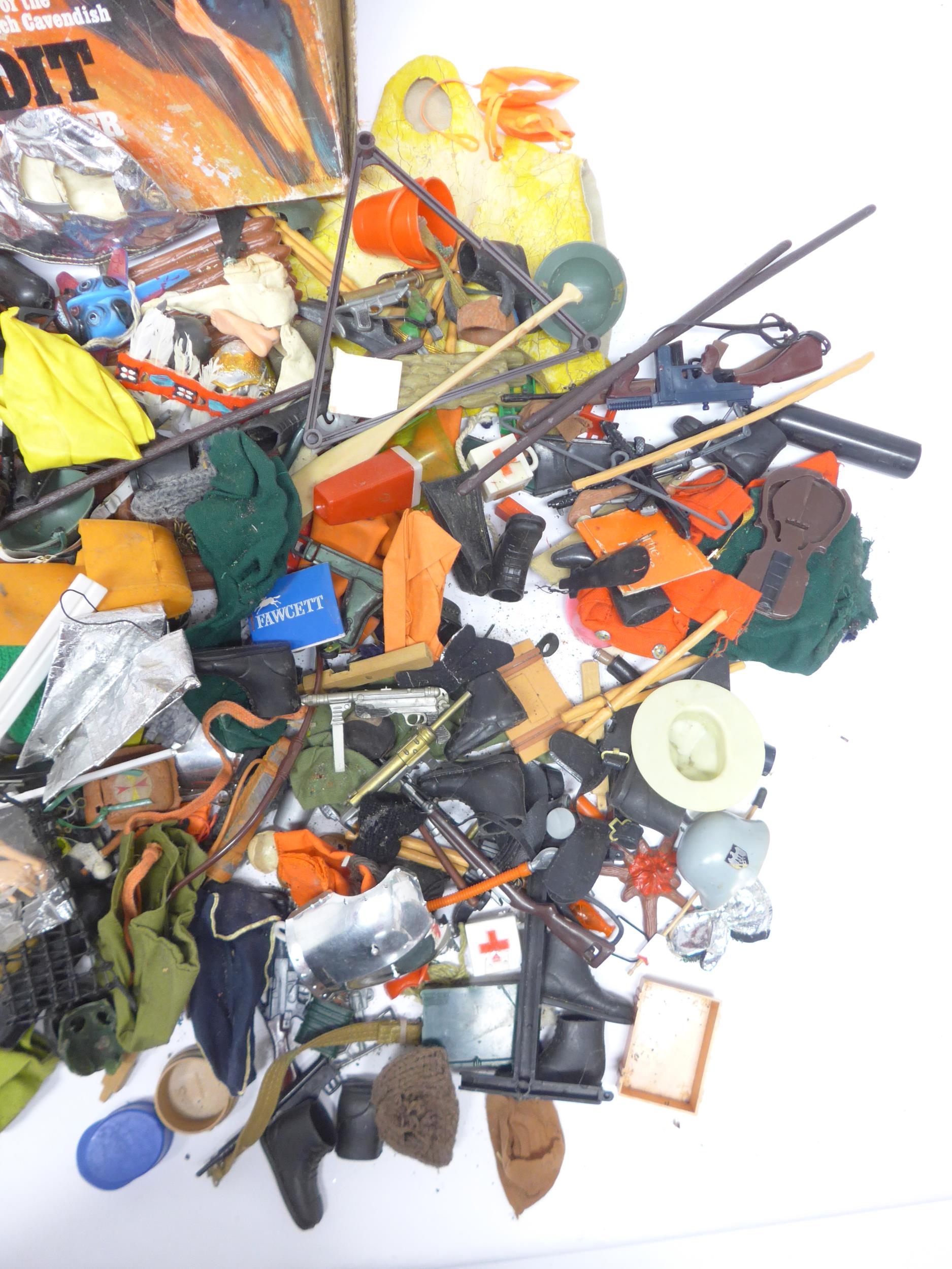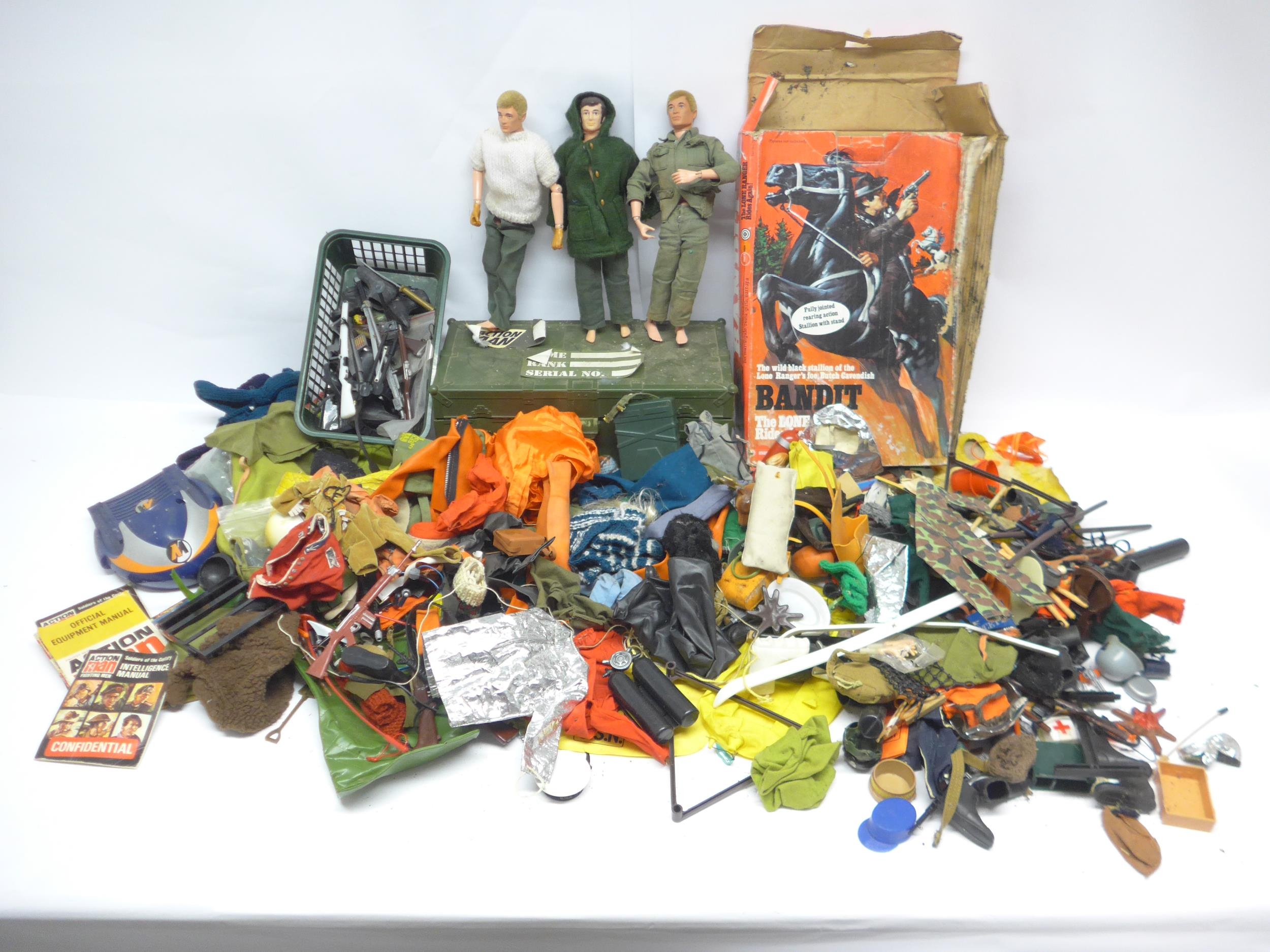 Two vintage Palitoy Action Man figures with blonde flock hair, a Hong Kong made Action Man style figure, an empty Marx Toys Lone Ranger Bandit box (poor), and a large quantity of Action Man, Lone Ranger and similar clothing, accessories and spares (general wear and signs of damp storage throughout)