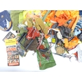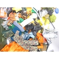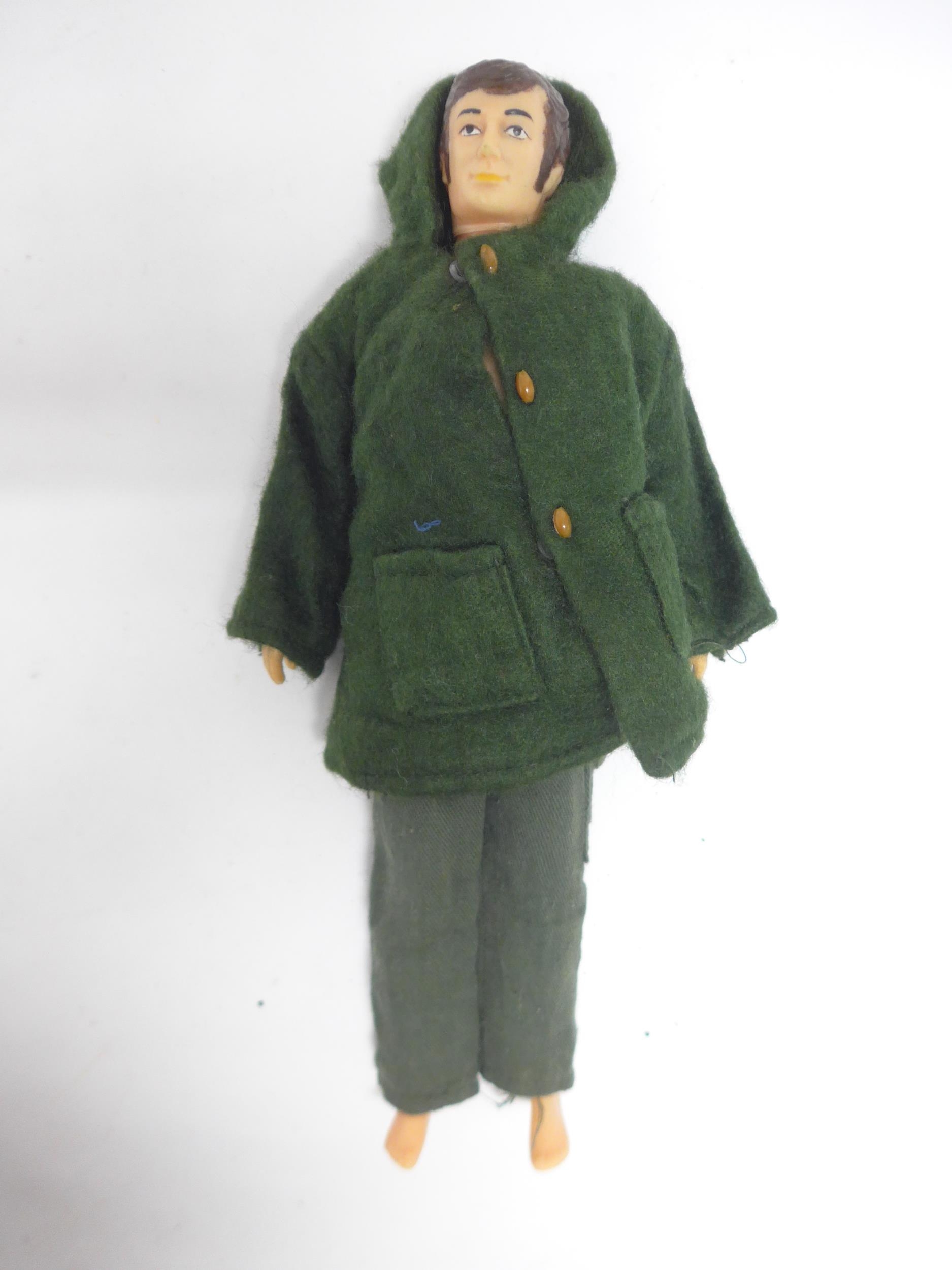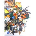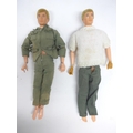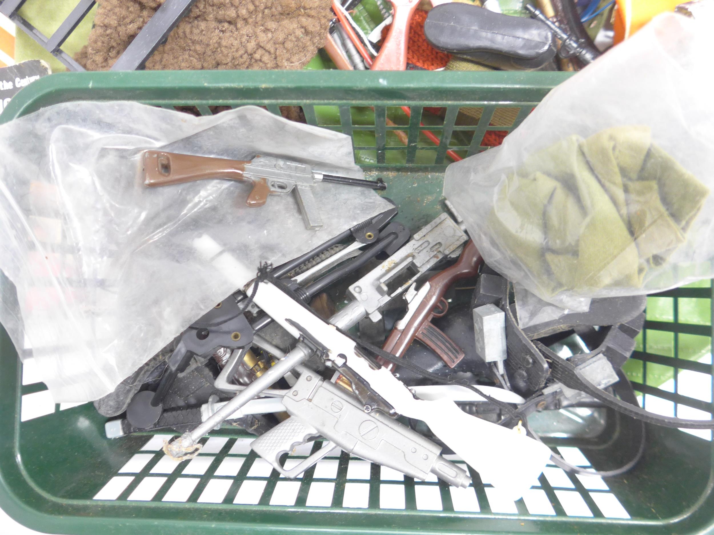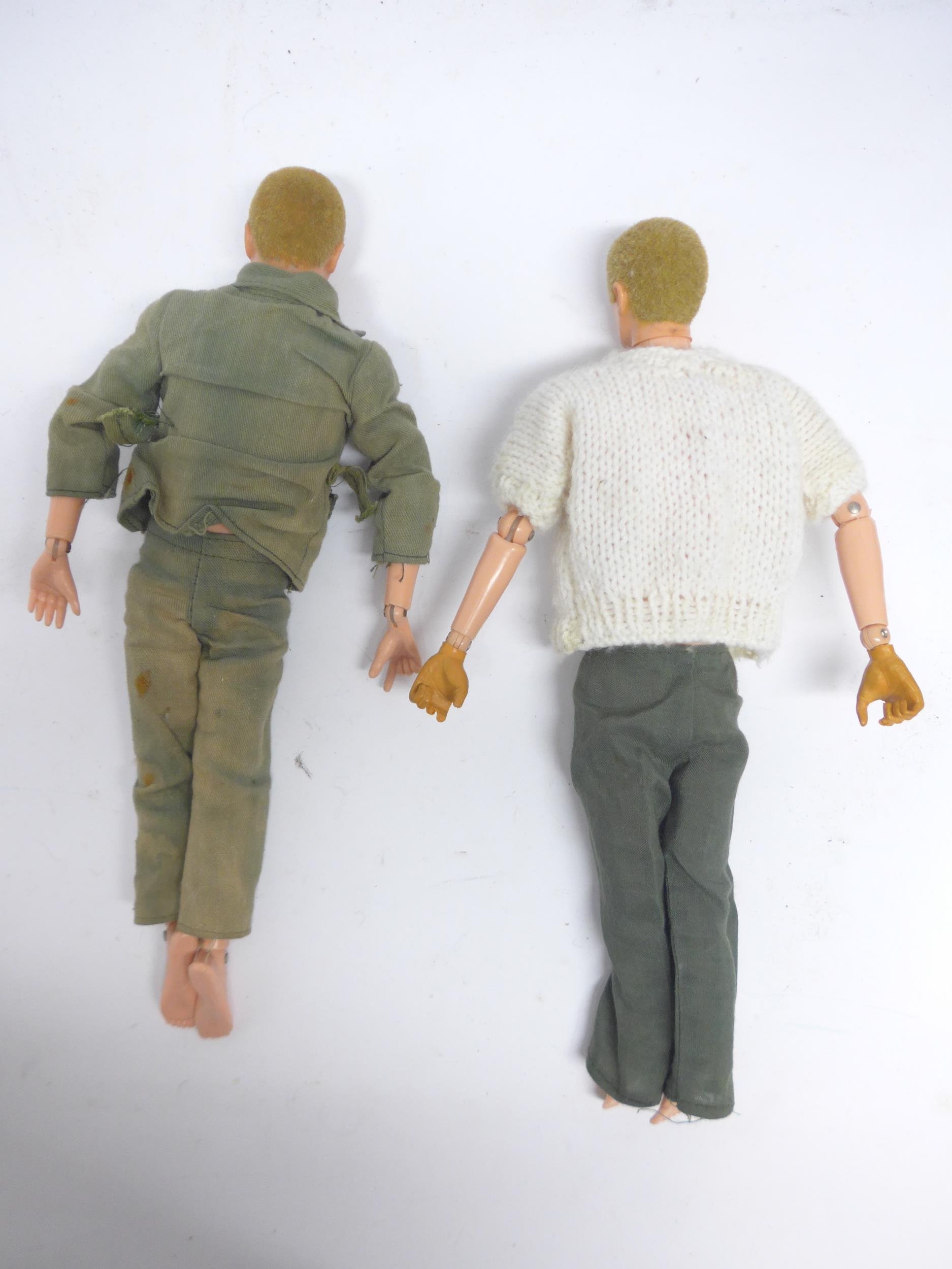 Two vintage Palitoy Action Man figures with blonde flock hair, a Hong Kong made Action Man style figure, an empty Marx Toys Lone Ranger Bandit box (poor), and a large quantity of Action Man, Lone Ranger and similar clothing, accessories and spares (general wear and signs of damp storage throughout)