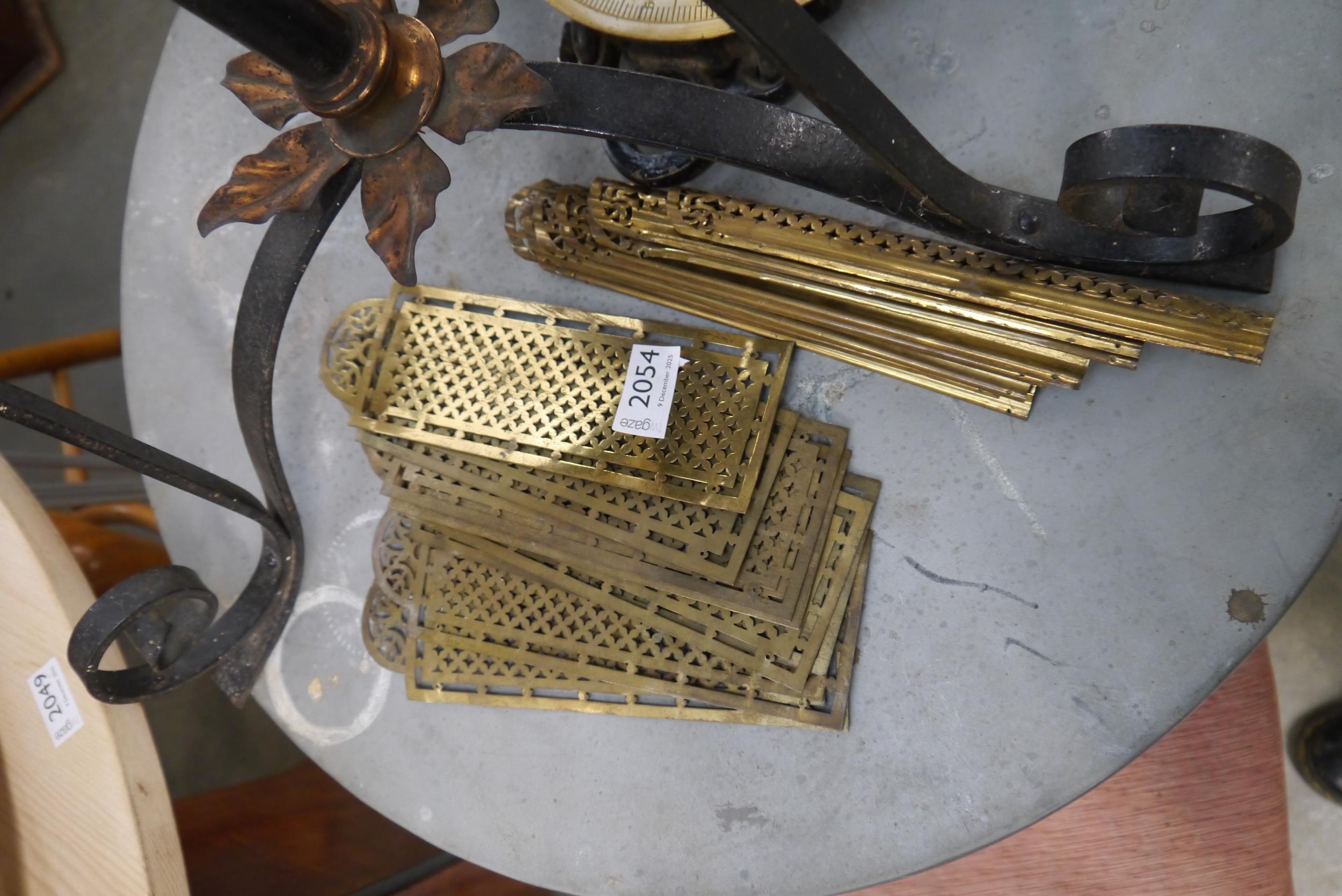 Four pairs of turn of the Century brass pierced door plates and corner mouldings
